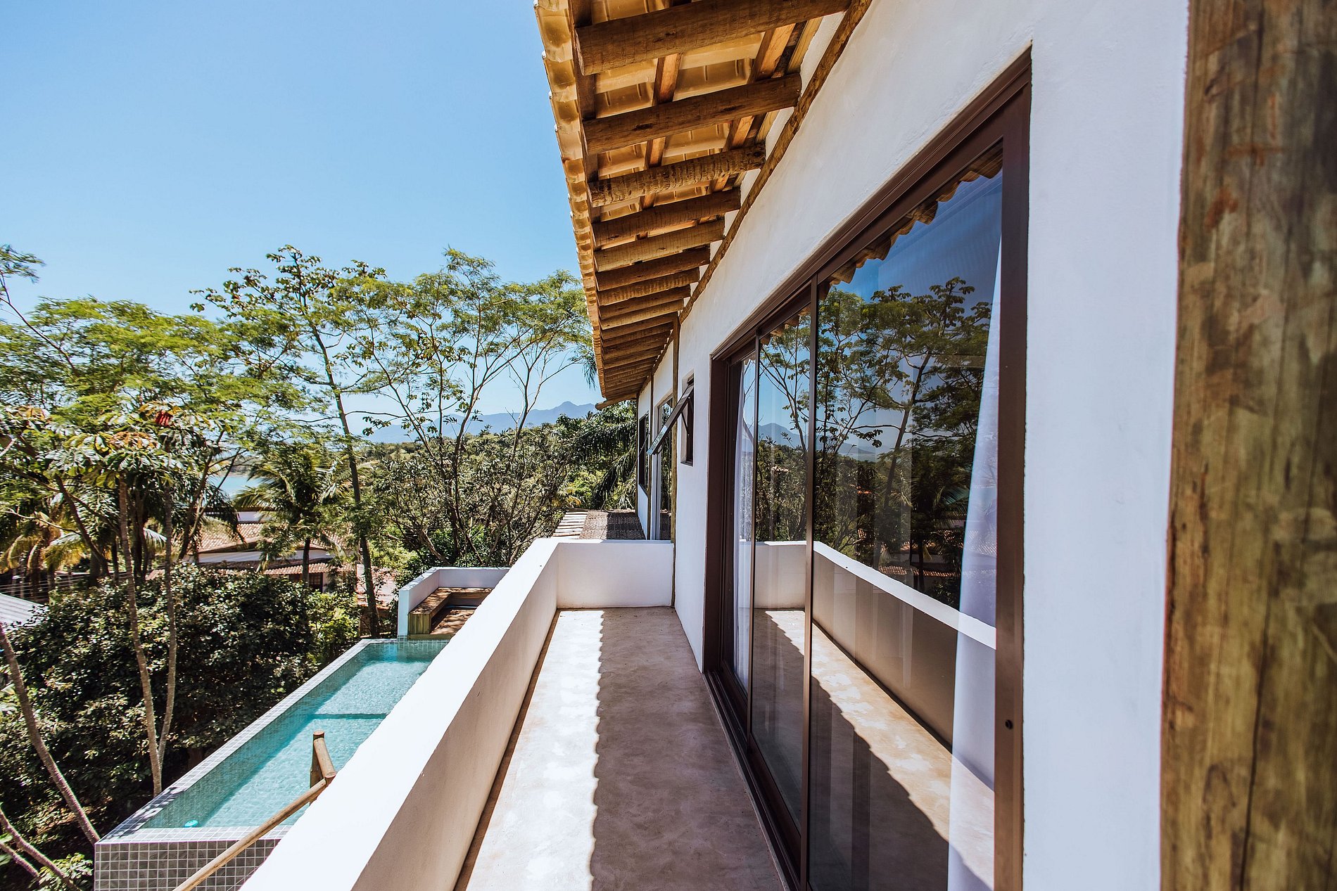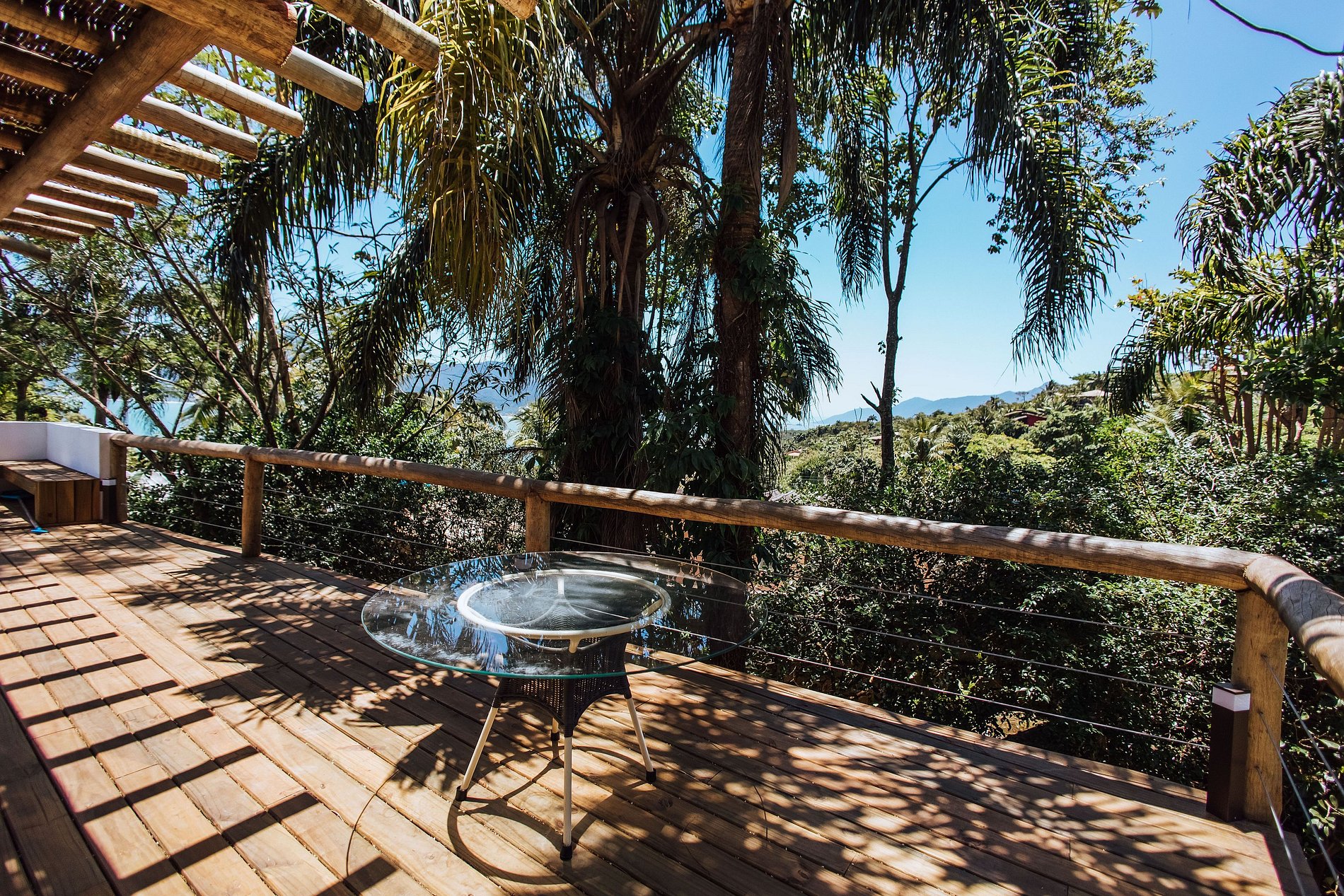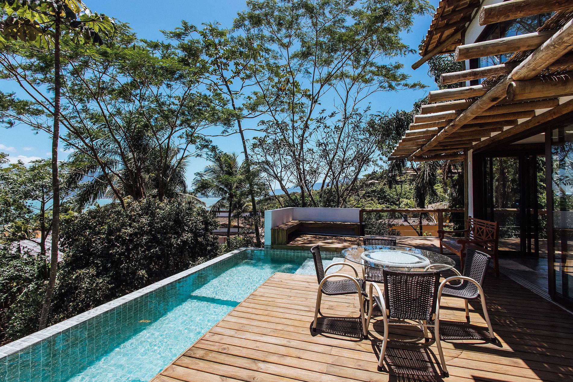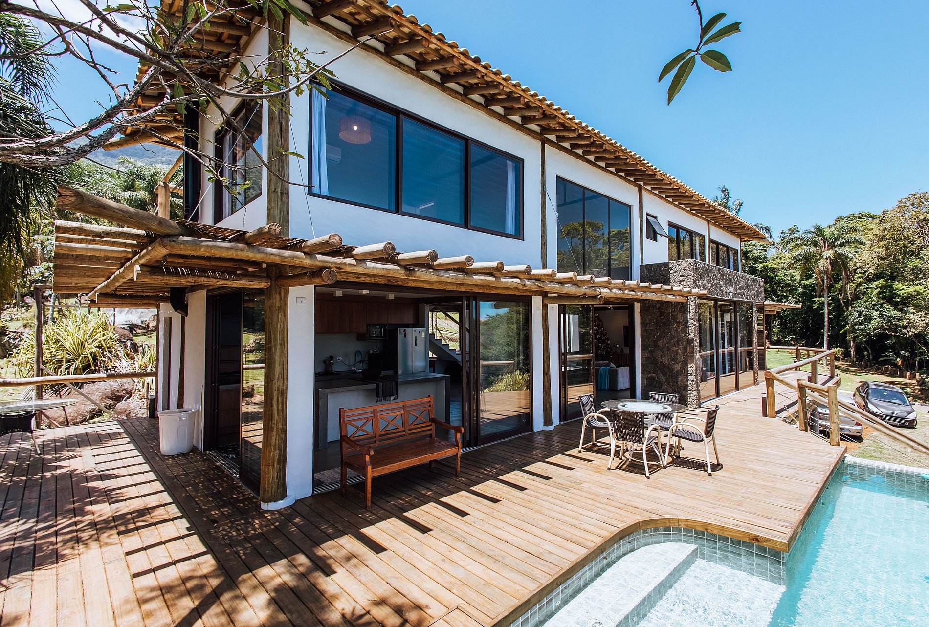 - Área externa incrível, com amplo deck de madeira integrado ao ambiente interno, mesa para refeições ao ar livre e uma bela piscina aquecida, com linda vista;