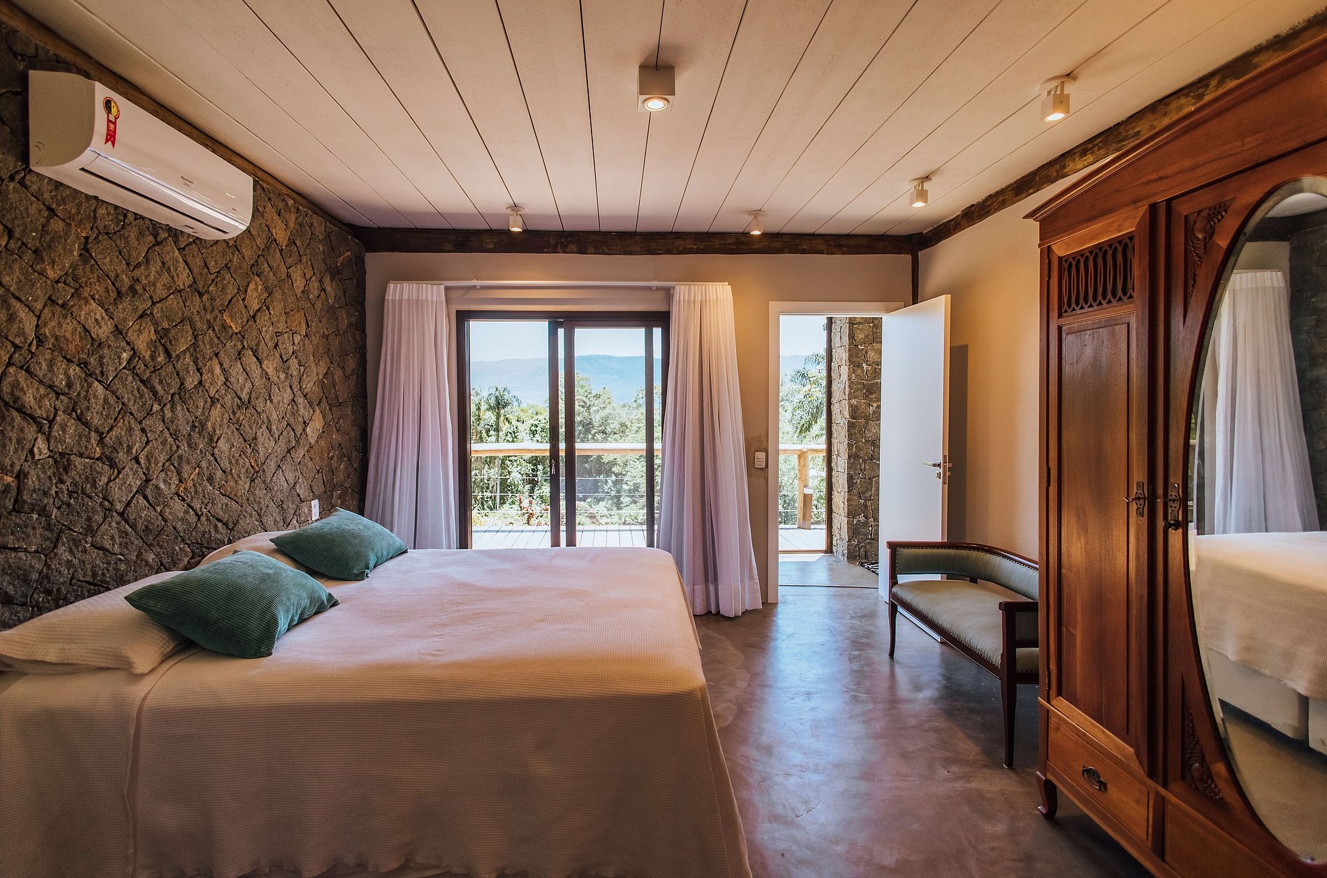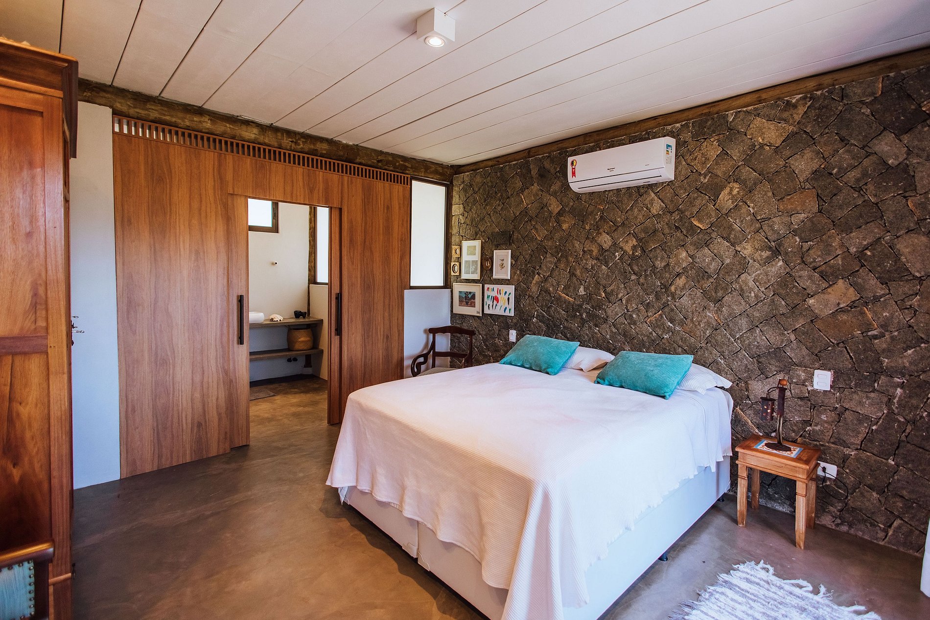 São 4 suítes, todas com ar-condicionado, enxoval completo, na seguinte configuração: