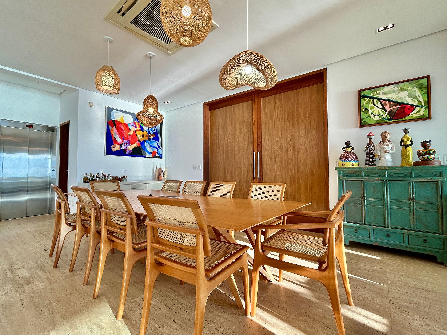 - A área externa é incrível e perfeita para reunir familiares e amigos! Piscina aquecida com vista para o mar e espreguiçadeiras, integrada à varanda da casa, onde fica o espaço gourmet com churrasqueira, forno de pizza, mesa para refeições ao ar livre e uma belíssima varanda mobiliada;