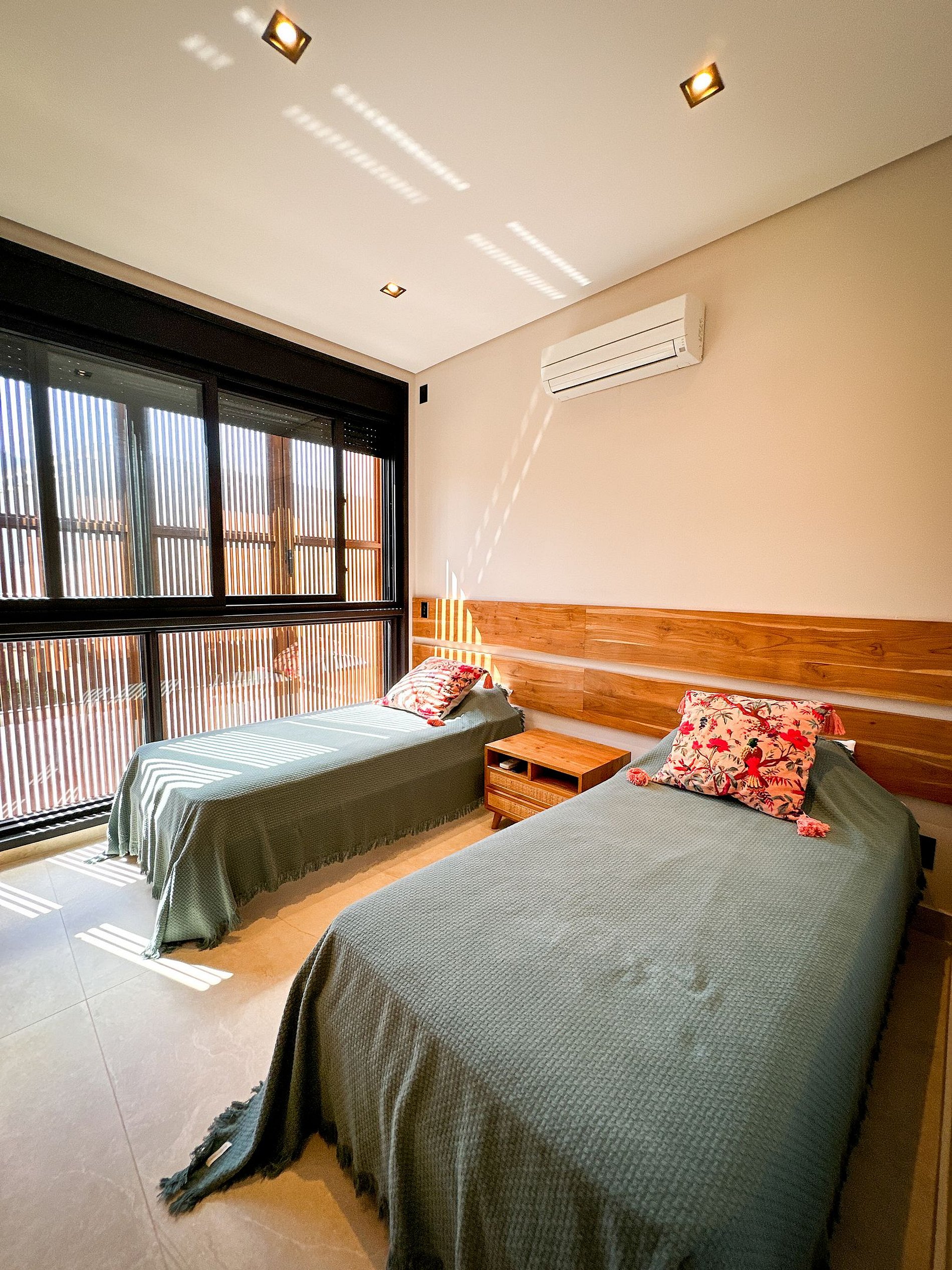São 4 suítes, todas com ar-condicionado e enxoval completo, na seguinte configuração: