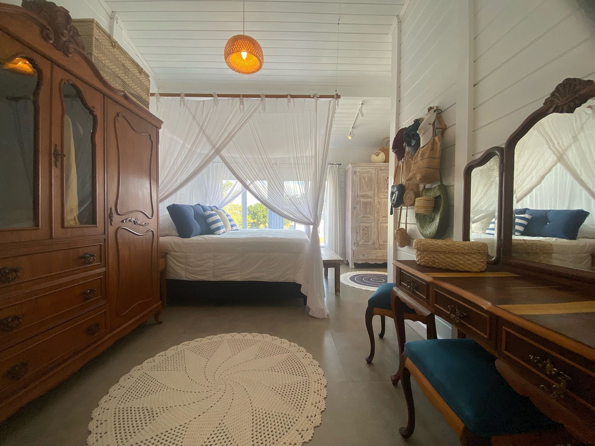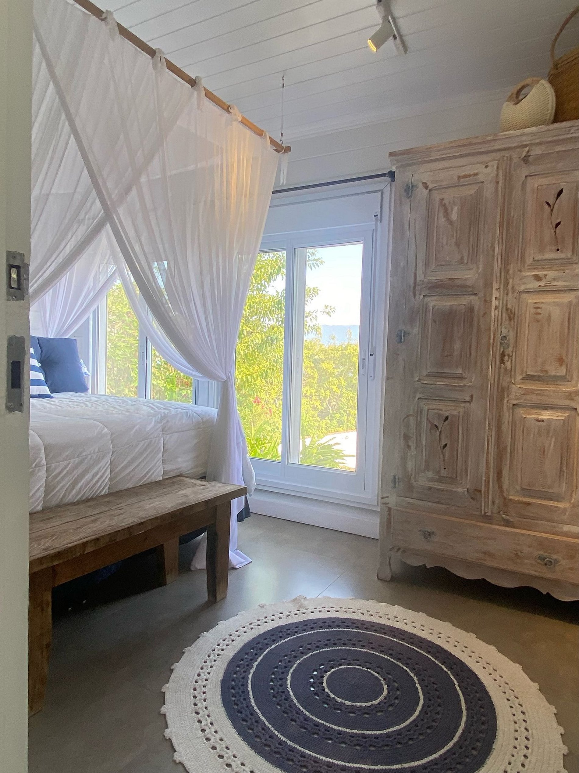 Suíte 1 (superior) - 1 cama de casa king dossel, armário e uma bela varanda com vista para o mar;