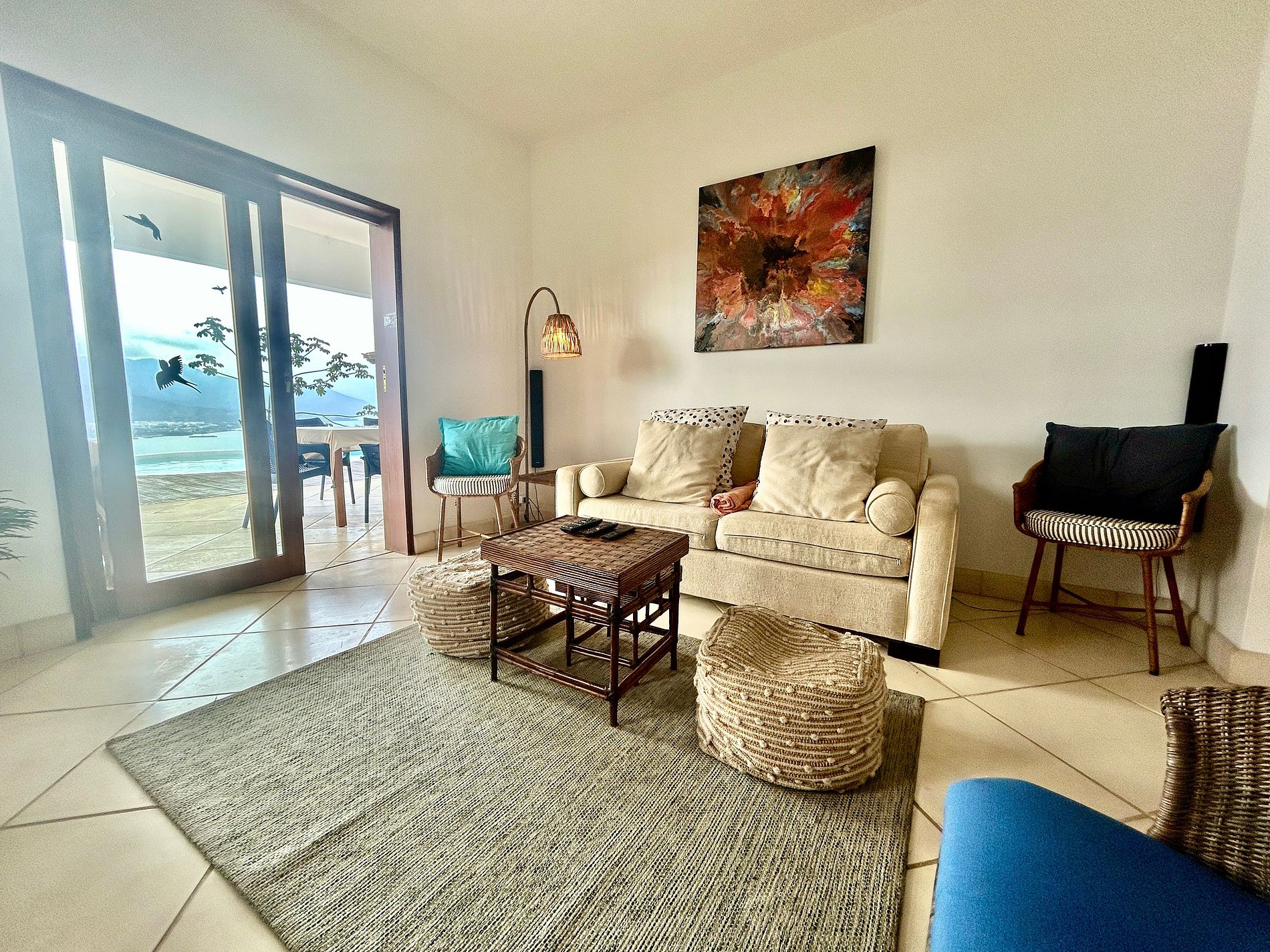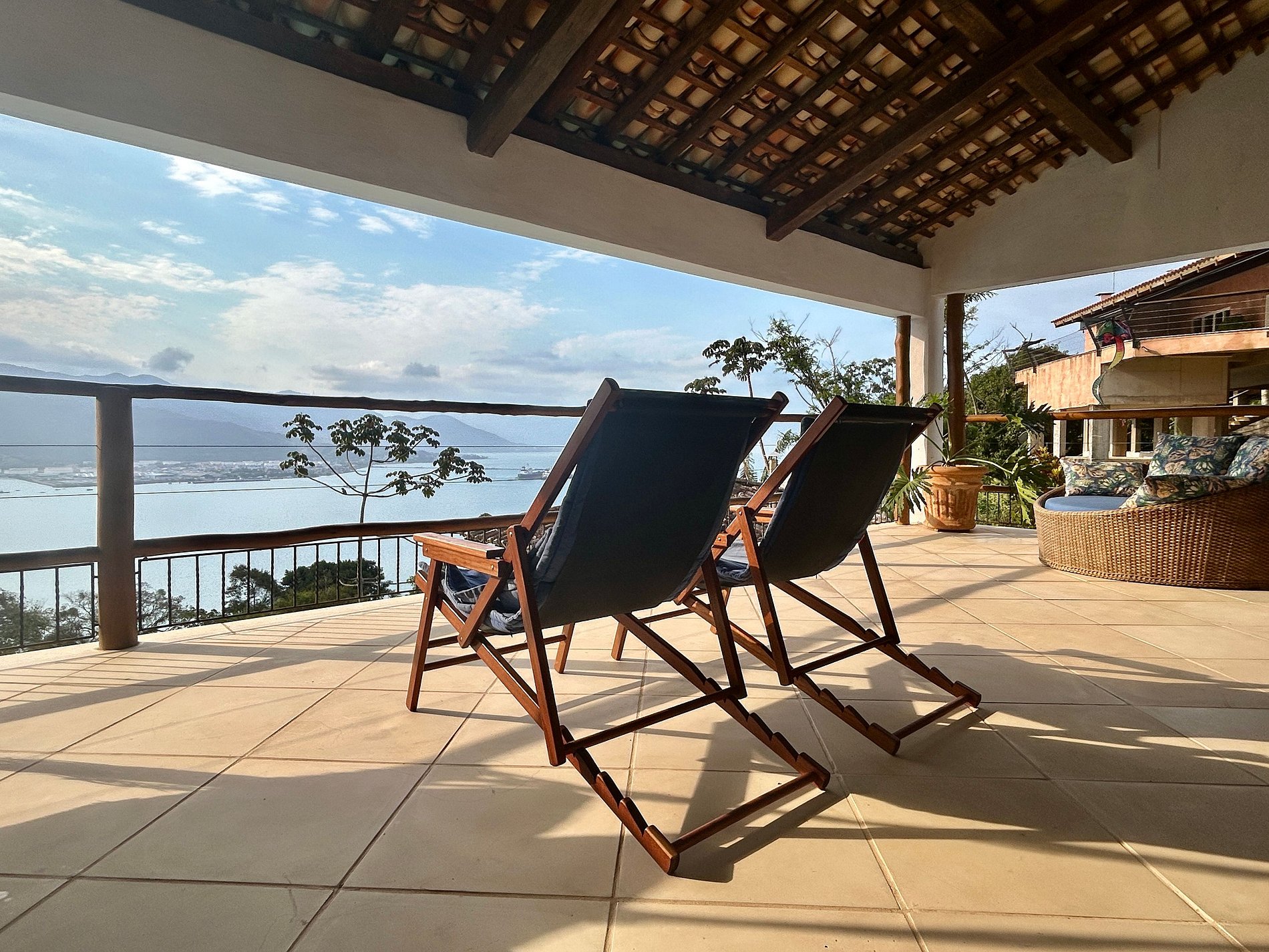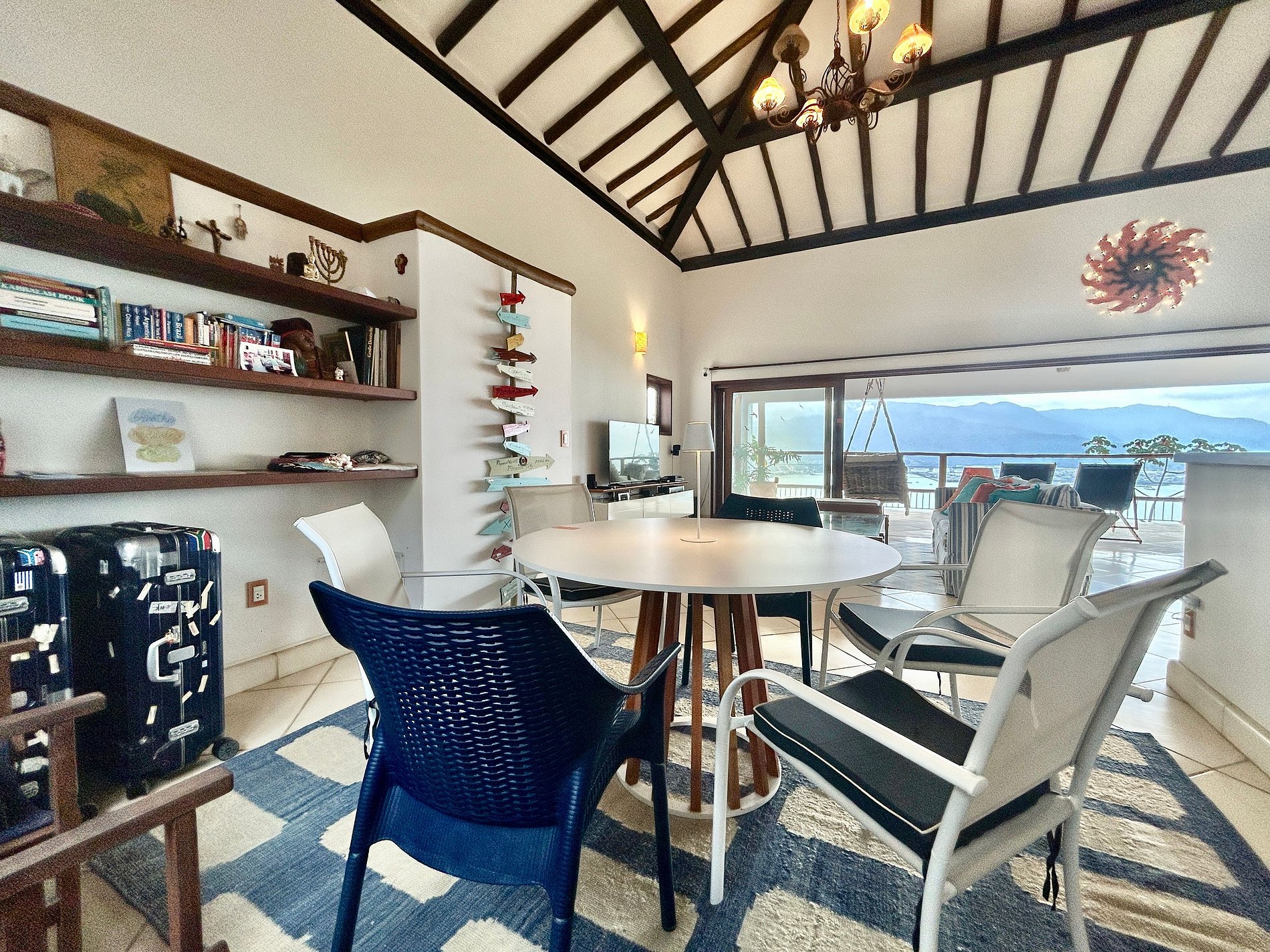 - Na parte superior há outra sala de estar, TV e jantar integradas à uma ampla varanda, com bela vista mar e montanha;