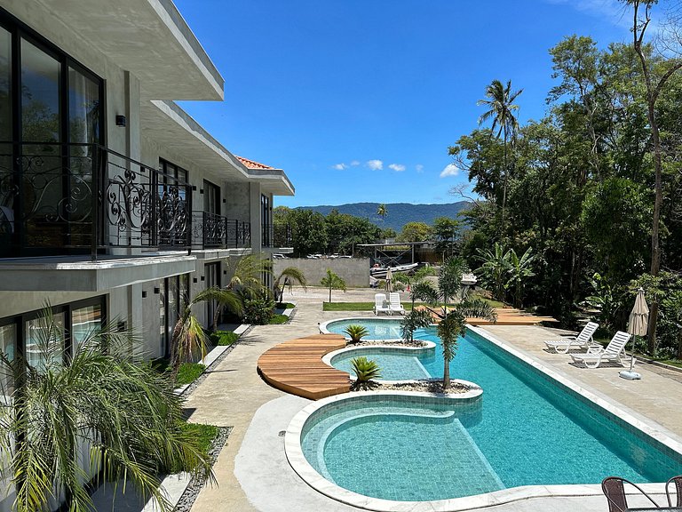 Desfrute de um refúgio à beira-mar no nosso moderno flat em Ilhabela, a poucos passos da Praia do Veloso. Projetado para casais, cada flat oferece uma cozinha compacta. Explore cachoeiras e trilhas nas proximidades, depois retorne e relaxe na piscina com espreguiçadeiras.