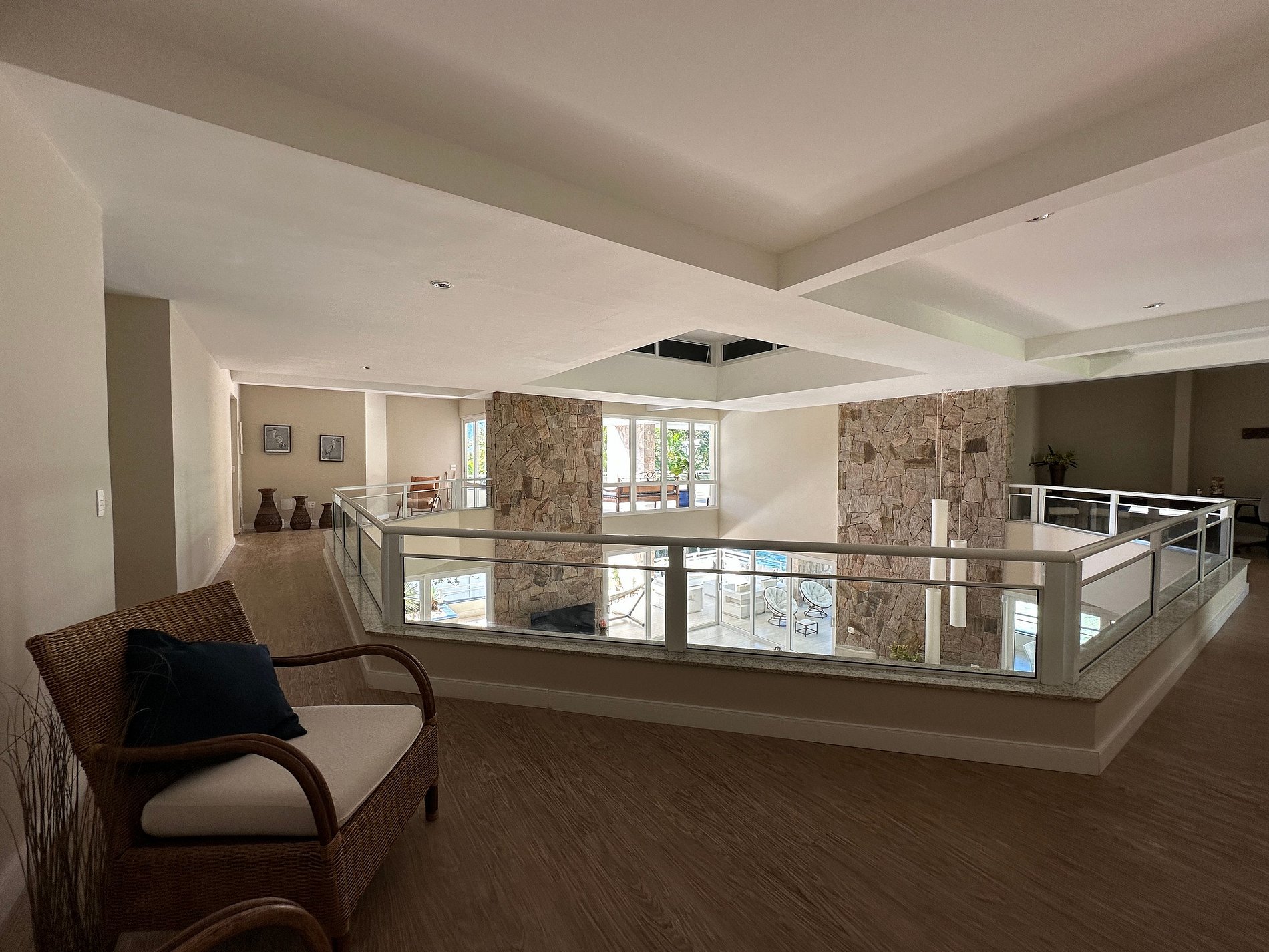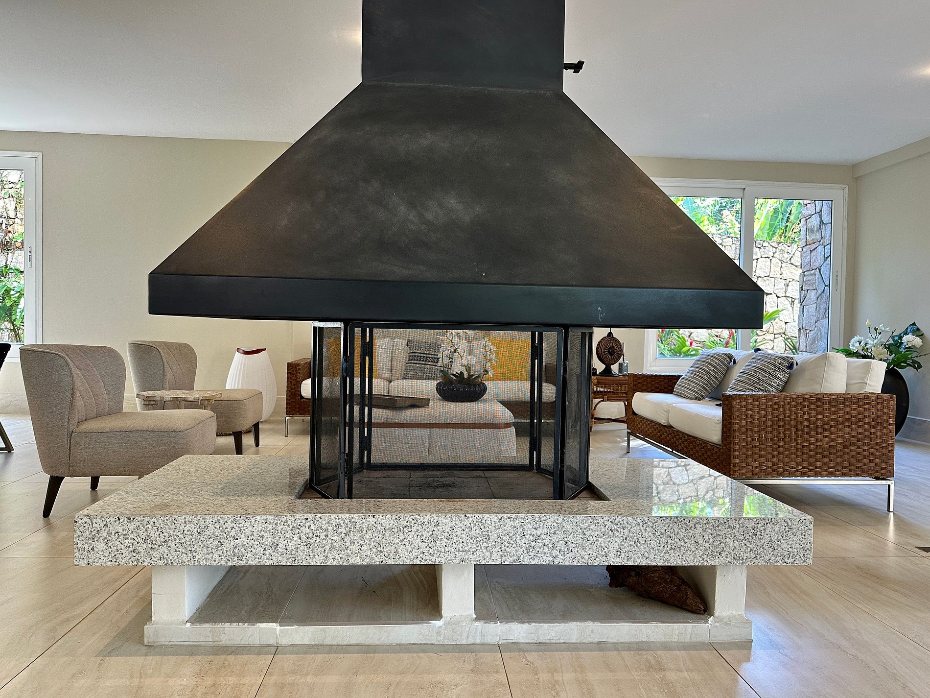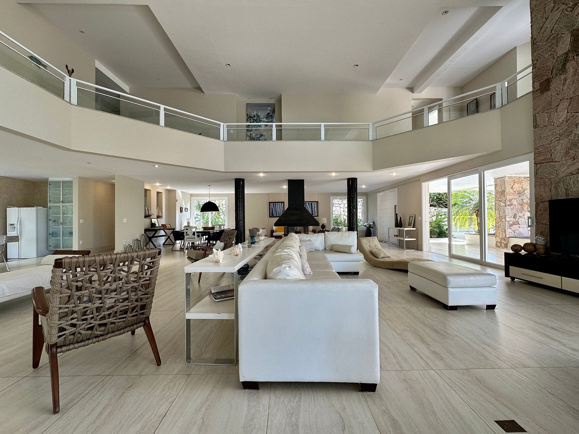 Amplas áreas sociais: salas de estar com lareira, sala de jantar, sala de TV