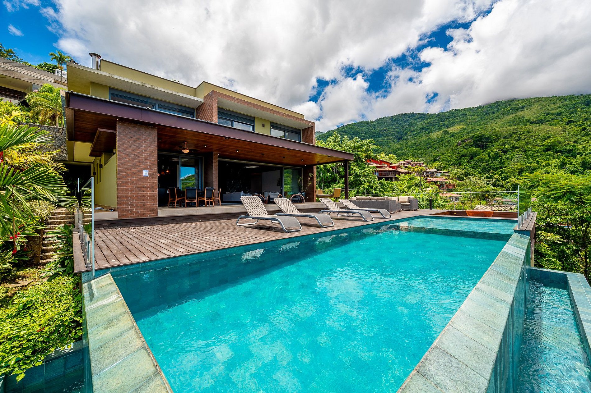 Casa moderna e luxuosa, no belo condomínio Sobreomar, próximo à Vila. Um refúgio com conforto e requinte, em meio à exuberante Mata Atlântica. São 4 suítes com ar-condicionado e TV, que acomodam 11 pessoas. Áreas sociais integradas, com incrível vista para o mar e montanha. Utensílios importados, sala de TV com Smart TV 65", Netflix, PlayStation 5 e Wi-fi. Área externa sensacional, com varanda gourmet, piscina aquecida com borda infinita, espaço para fogueira e belos móveis externos.