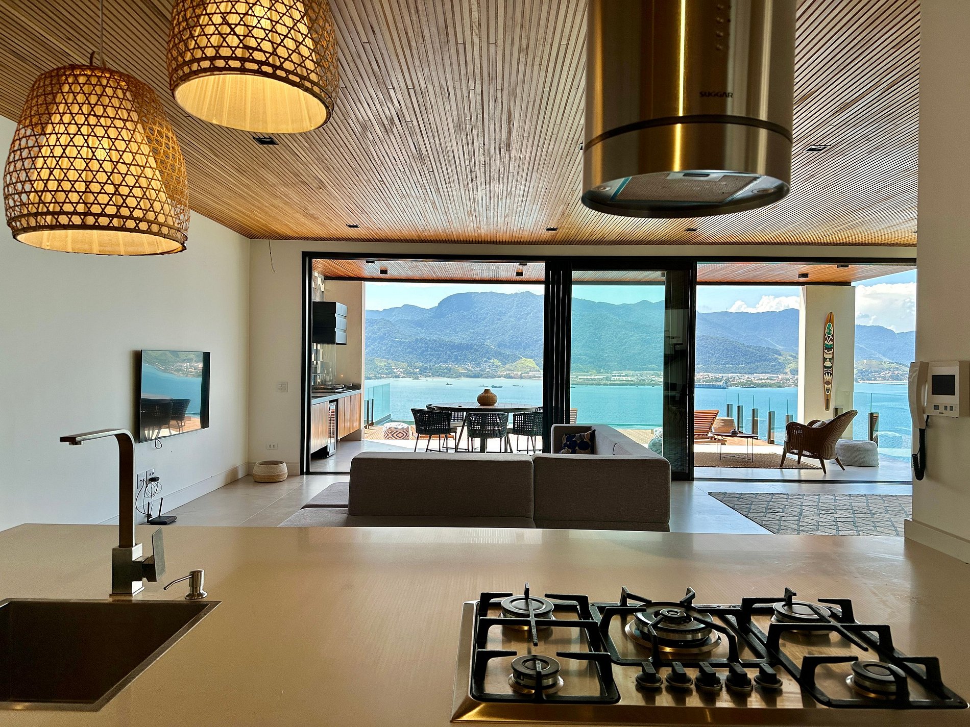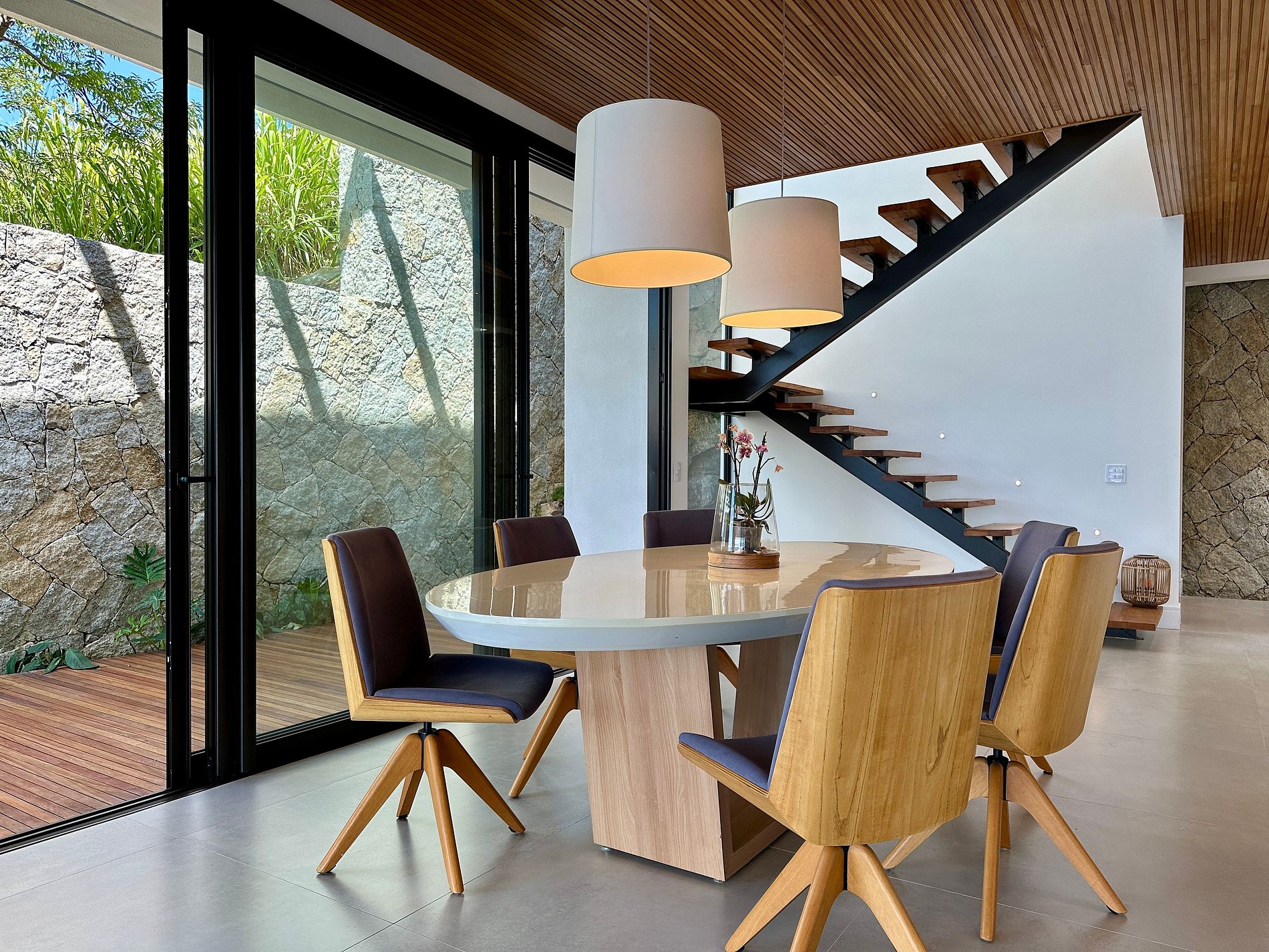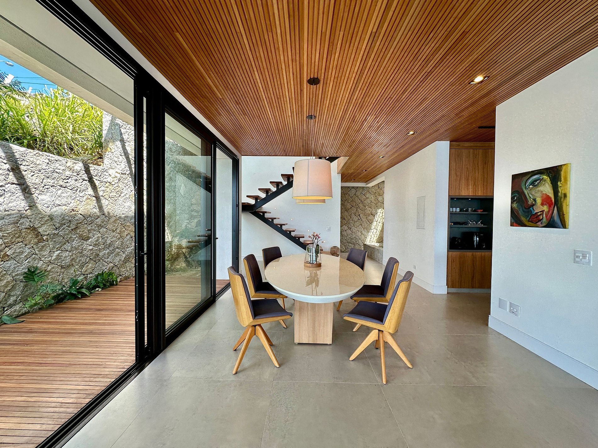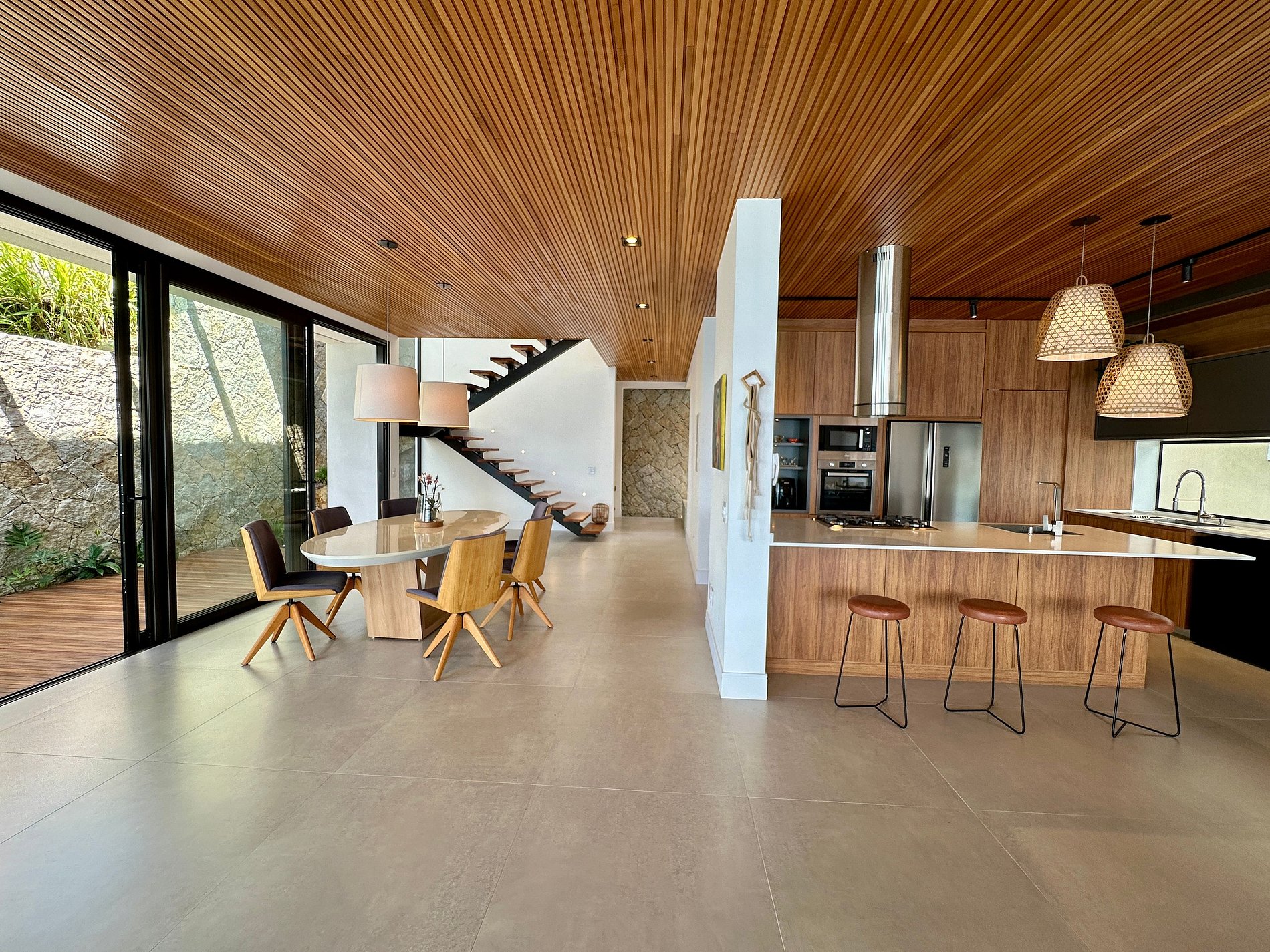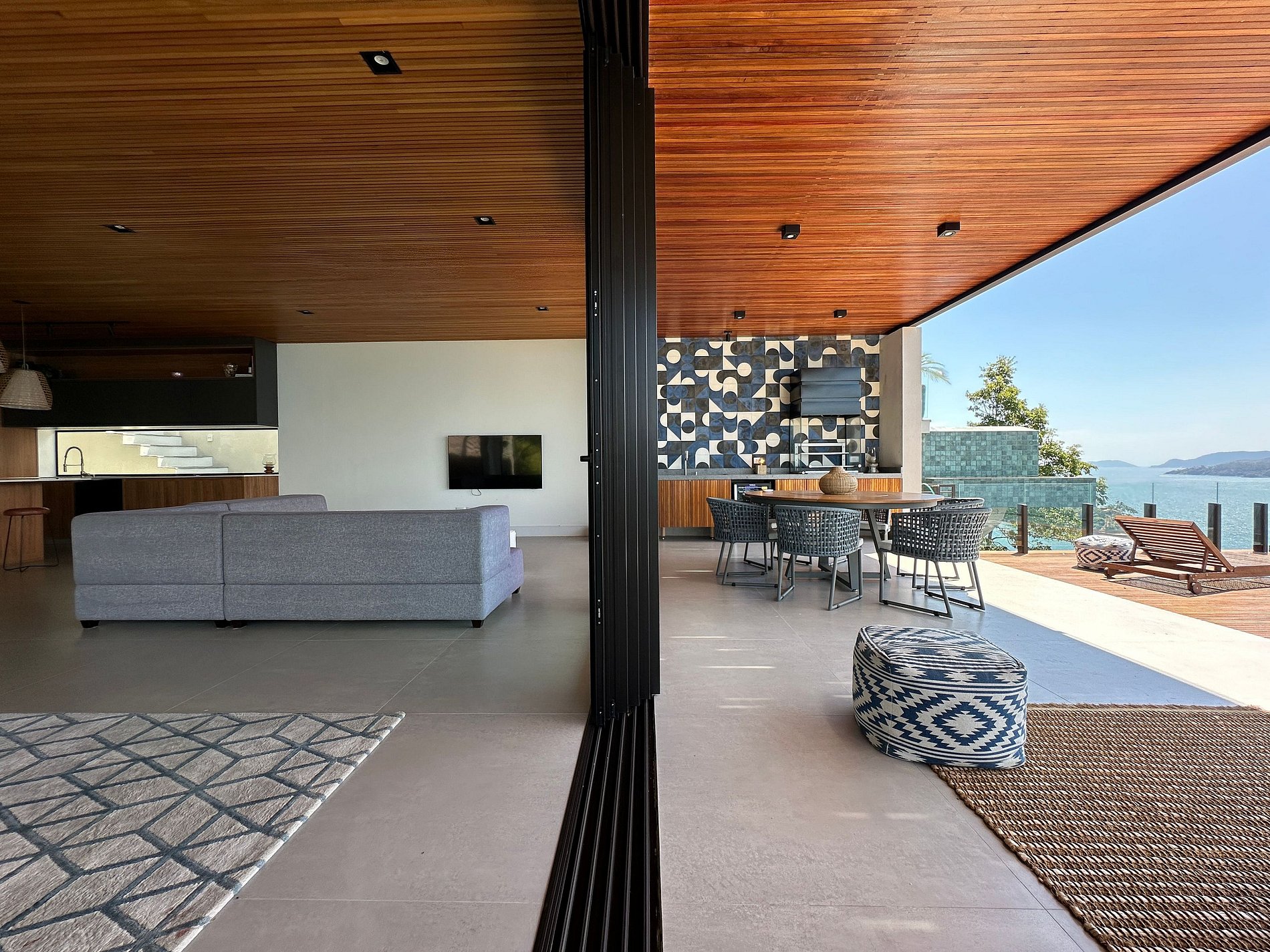 - Já no andar inferior está a parte social e externa da casa, ambas com uma vista deslumbrante para o mar. Nesta área, o hóspede irá usufruir de um ambiente totalmente integrado com salas de estar, jantar, lavabo, cozinha completa e uma varanda gourmet incrível, com Wi-fi disponível;