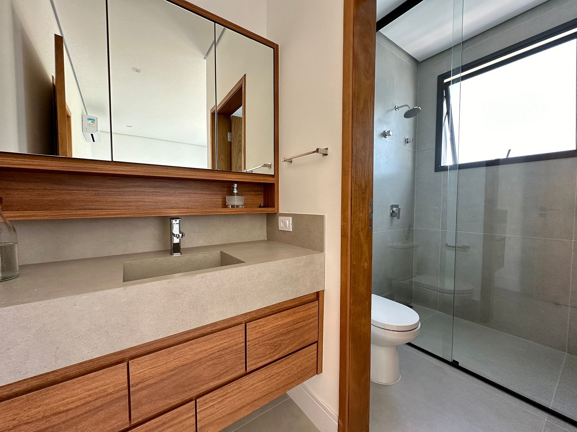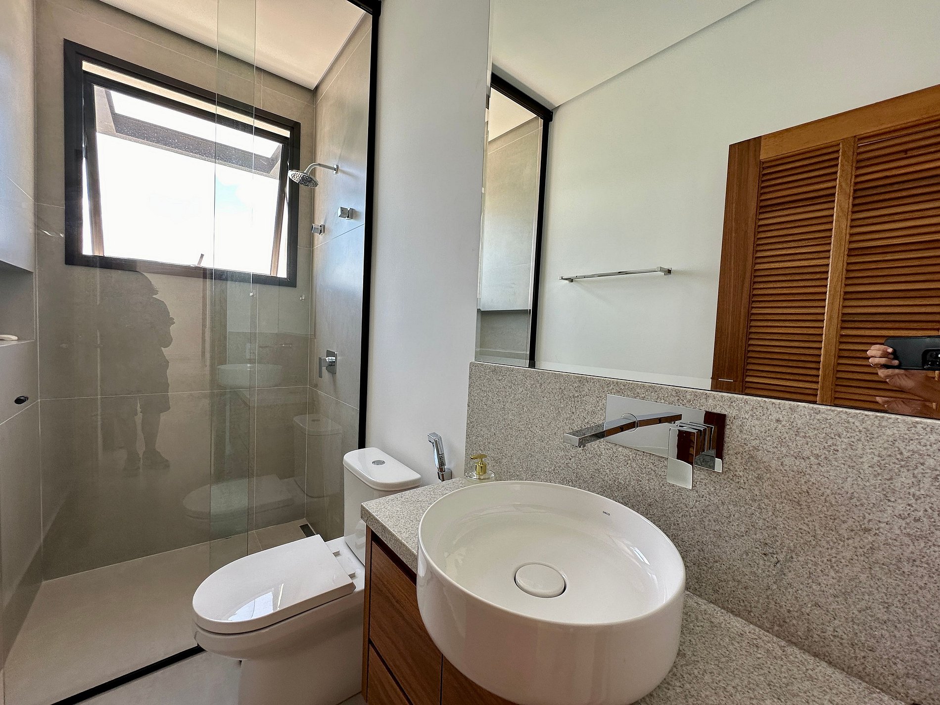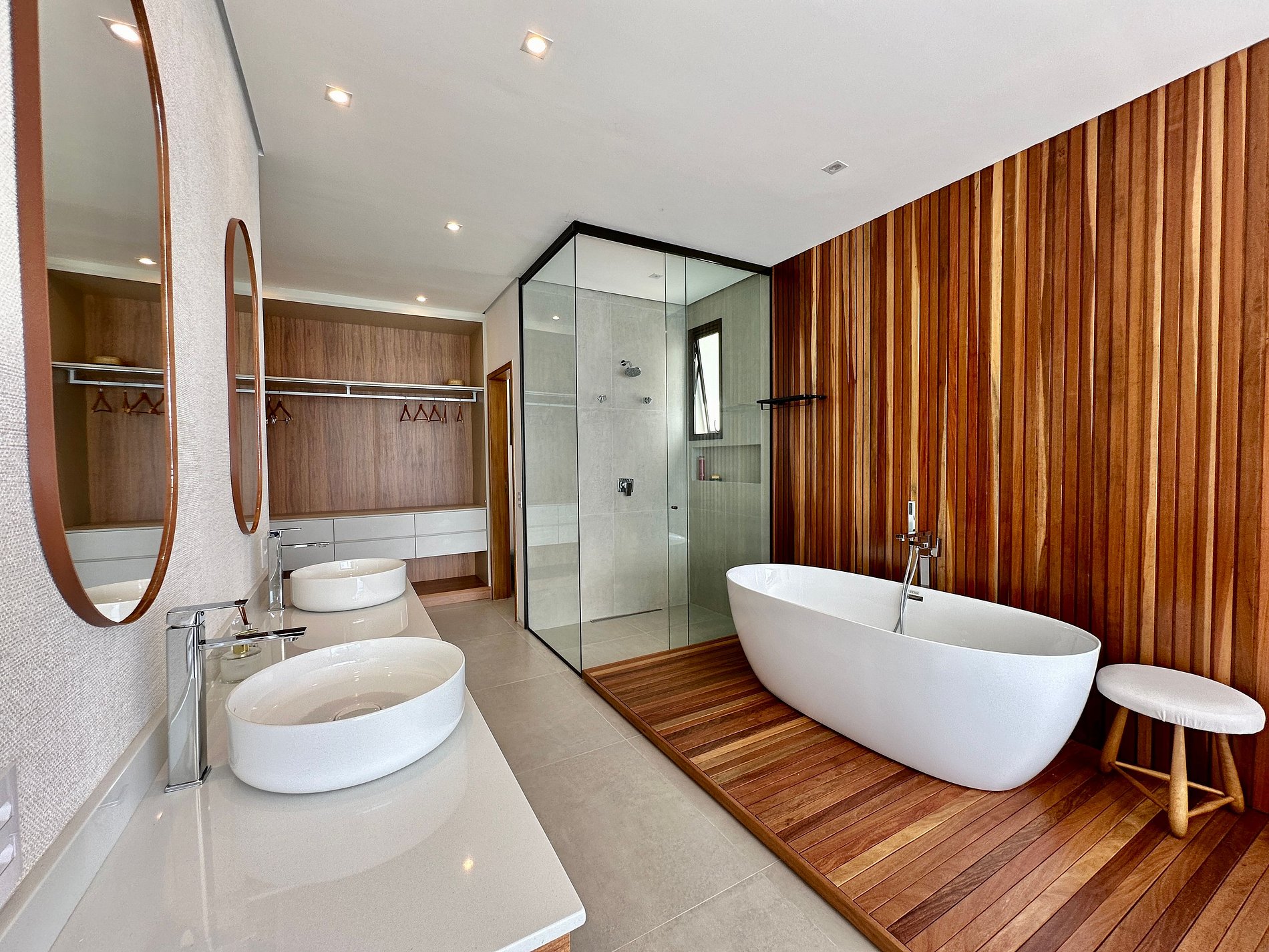 - Suíte 1: uma cama king e um banheiro integrado com banheira e duas pias (vaso sanitário em local privativo) e um frigobar;