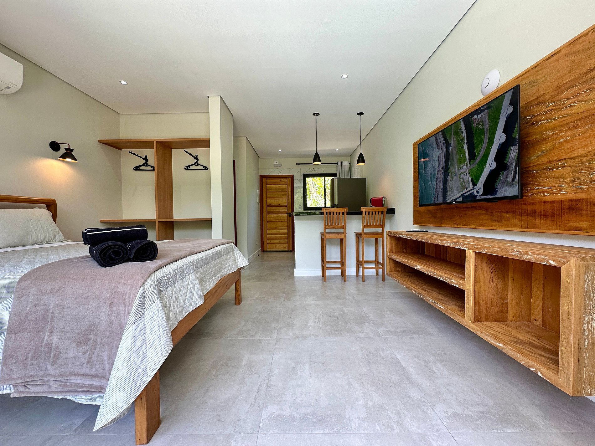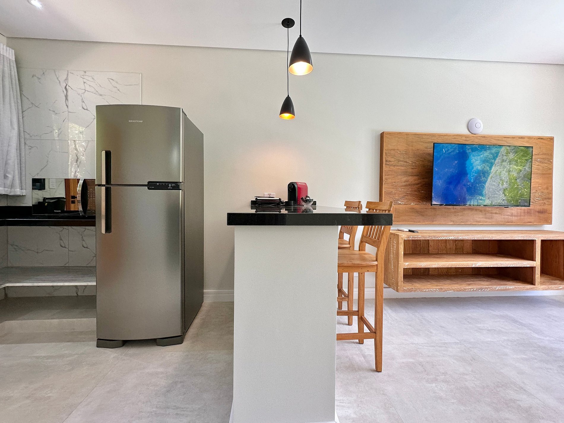 - Área interna do flat conta com cama queen, TV, ar-condicionado (24.000Btus), cozinha compacta, mesa e banheiro;