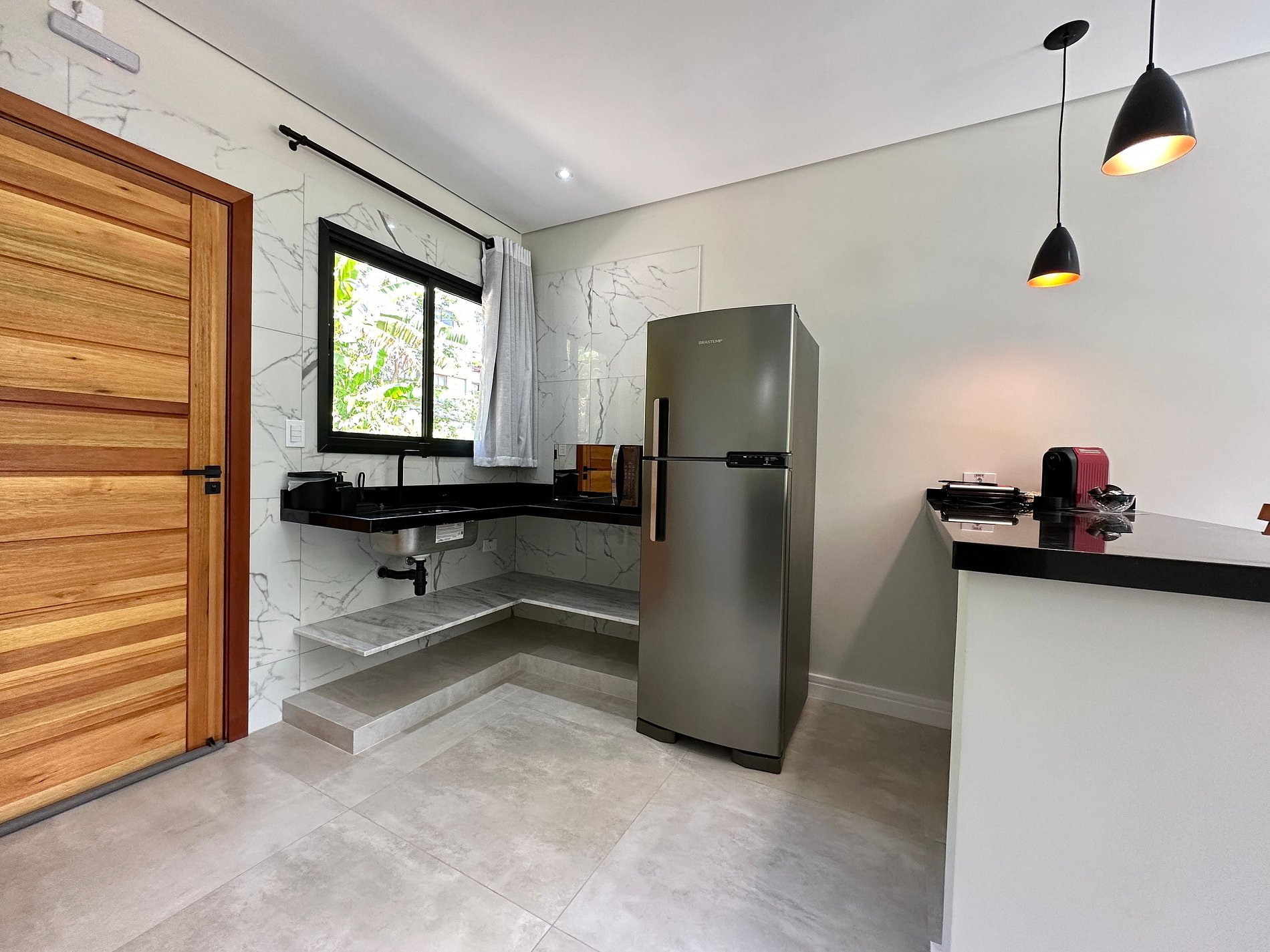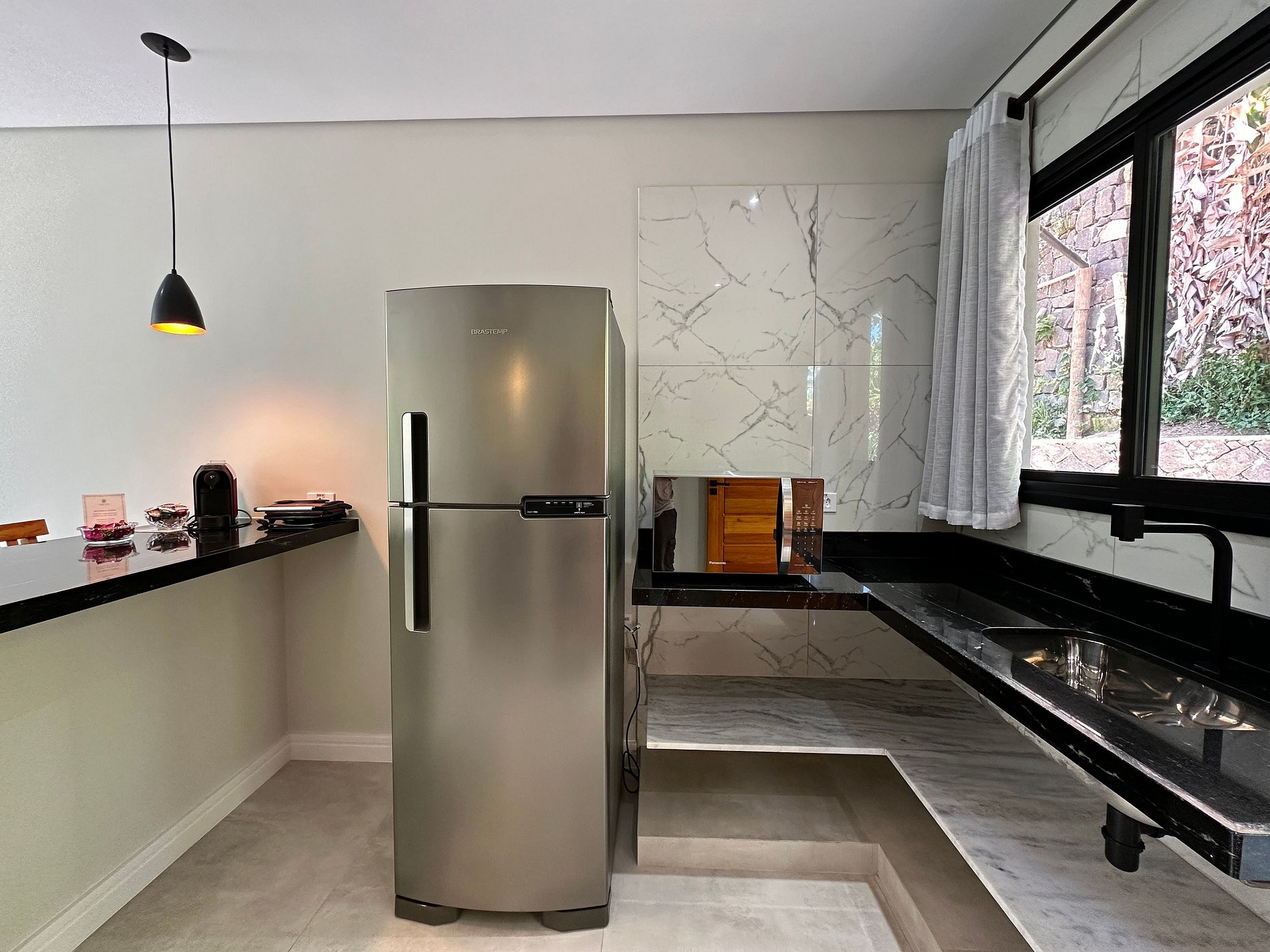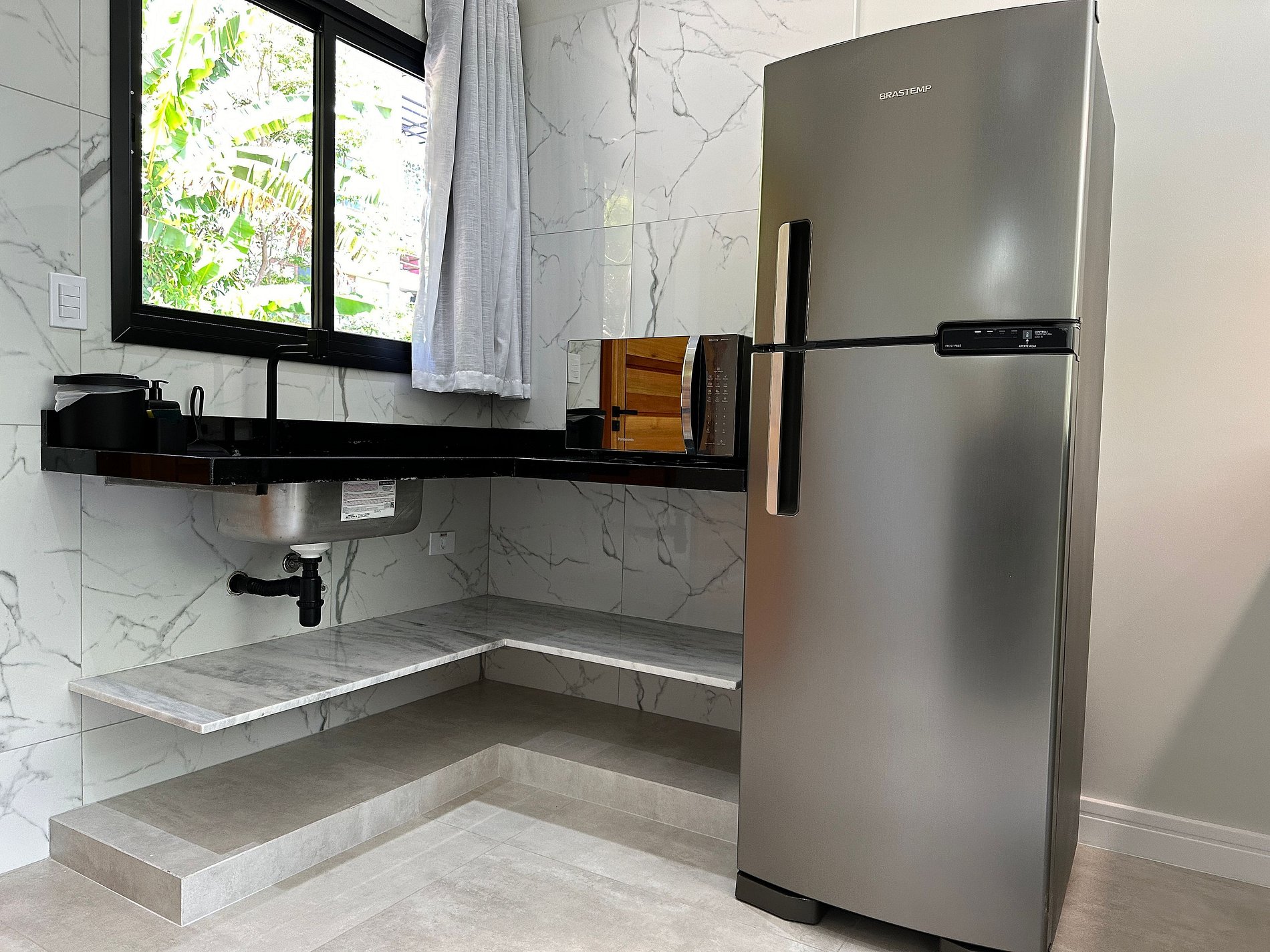 - Cozinha compacta com geladeira, micro-ondas, cafeteira Três Corações, sanduicheira, talheres e copos.