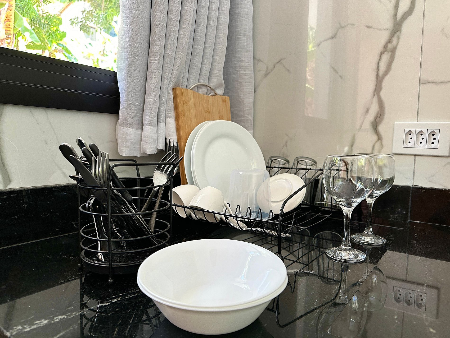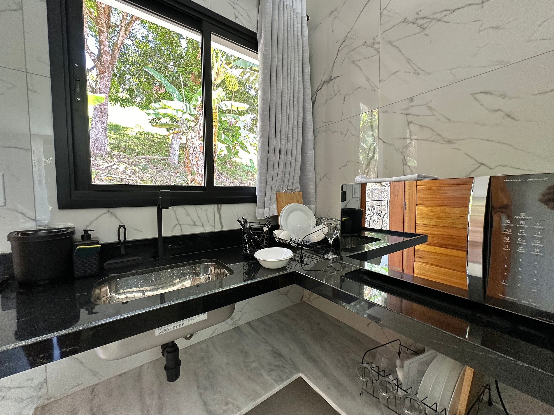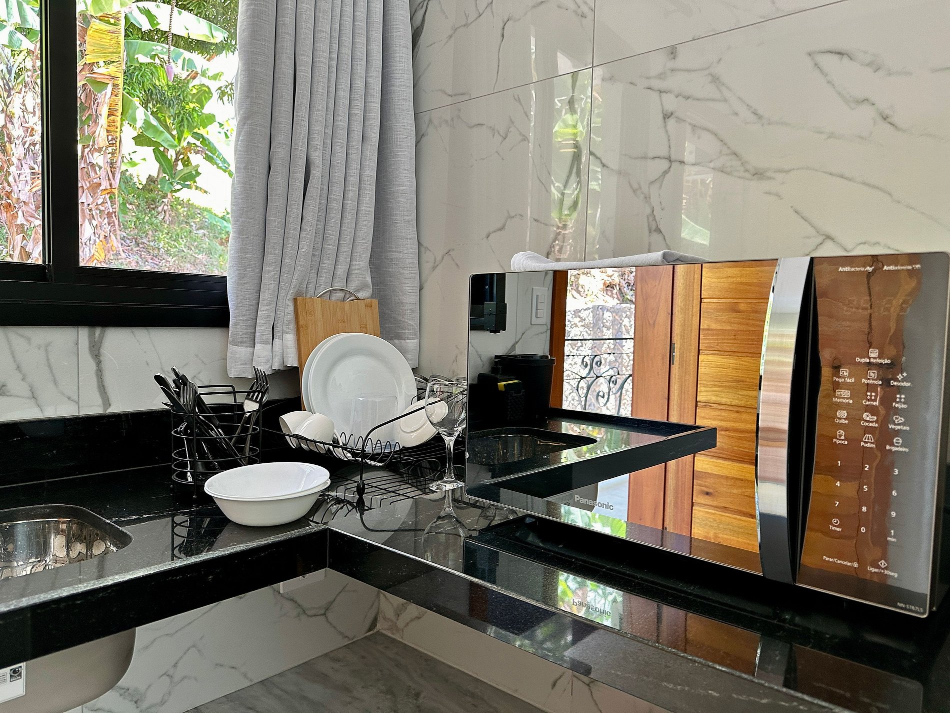 - Cozinha compacta com geladeira, micro-ondas, cafeteira Três Corações, sanduicheira, talheres e copos.
