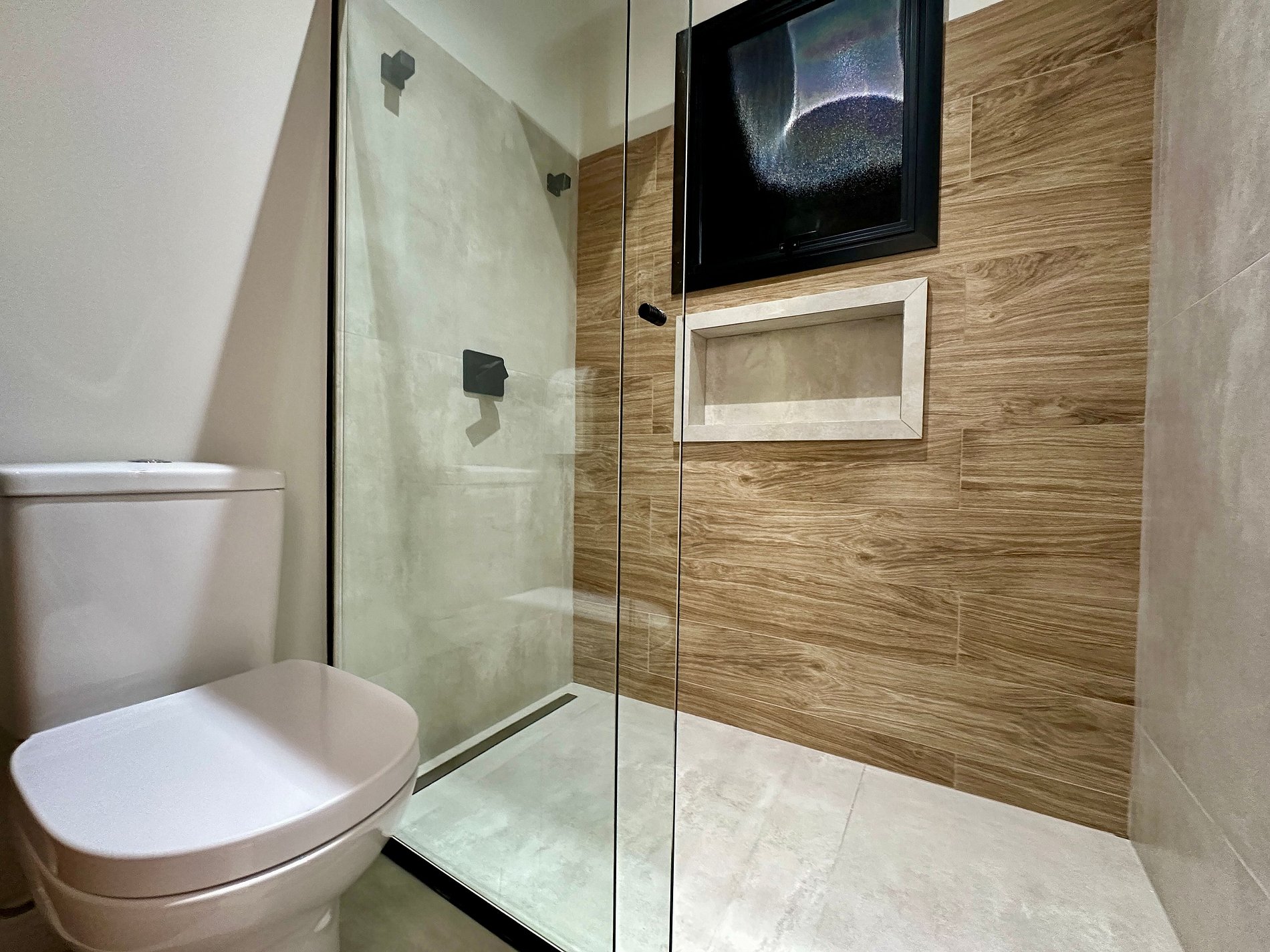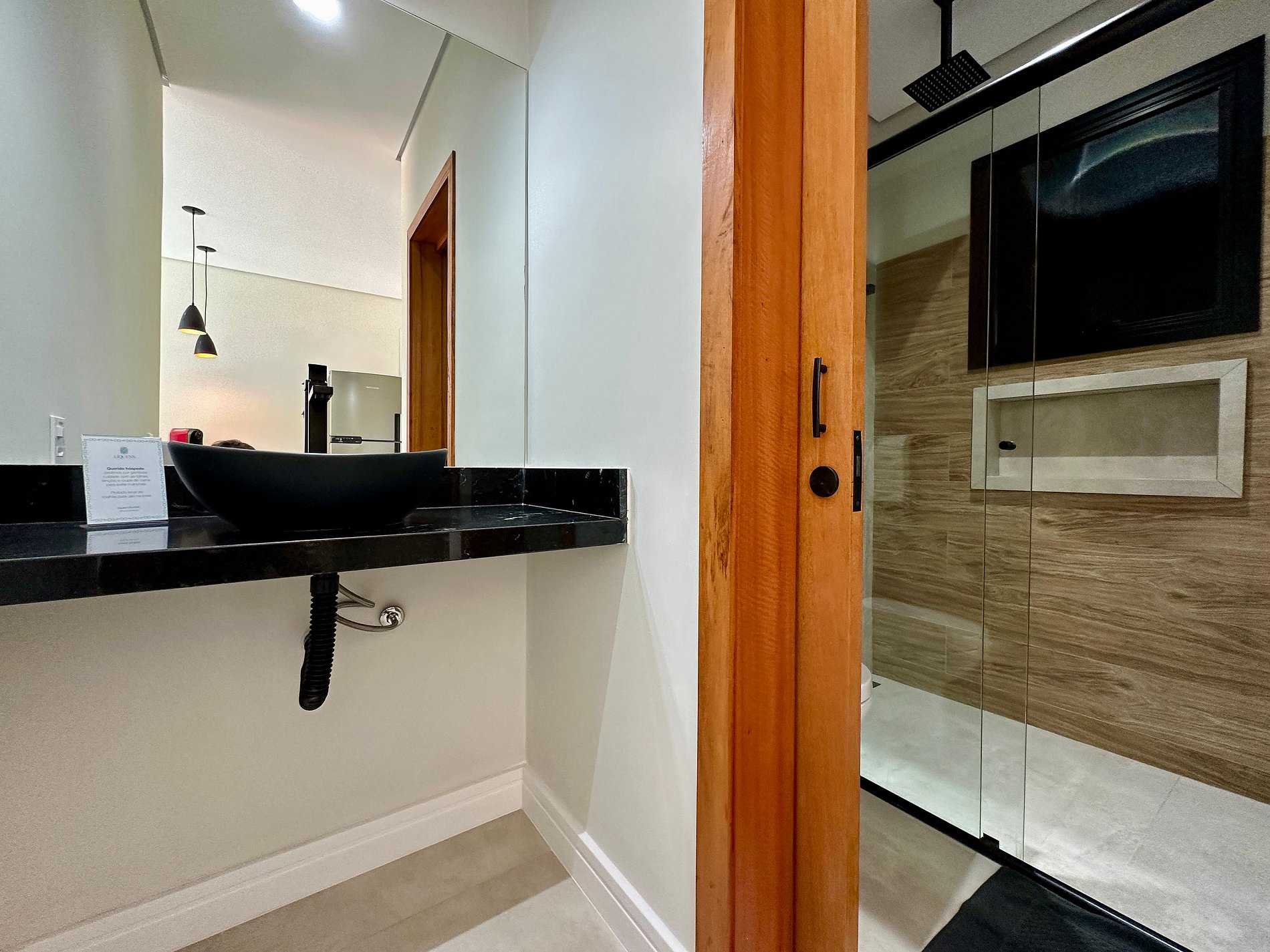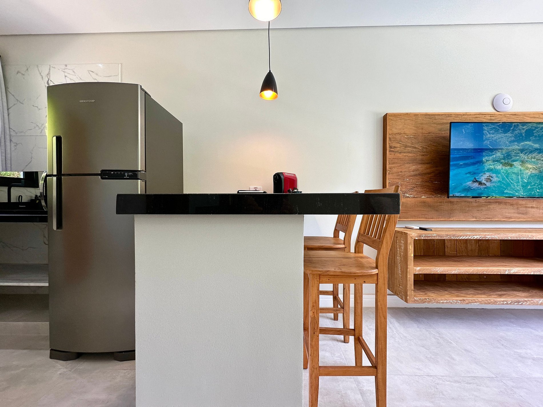 - Área interna do flat conta com cama queen, TV, ar-condicionado (24.000Btus), cozinha compacta, mesa e banheiro;