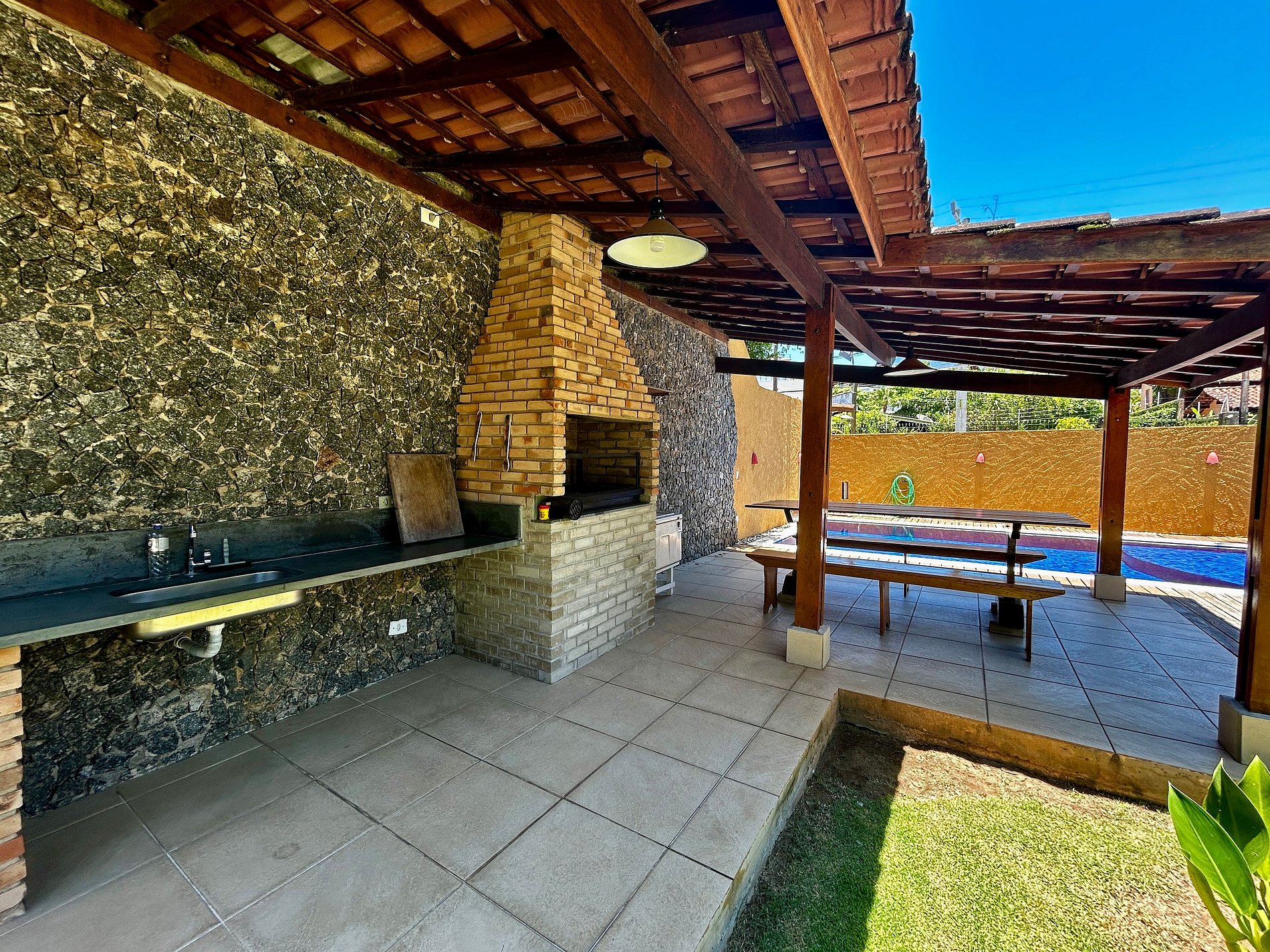 - Área interna com salas de estar, TV, jantar e cozinha completa;