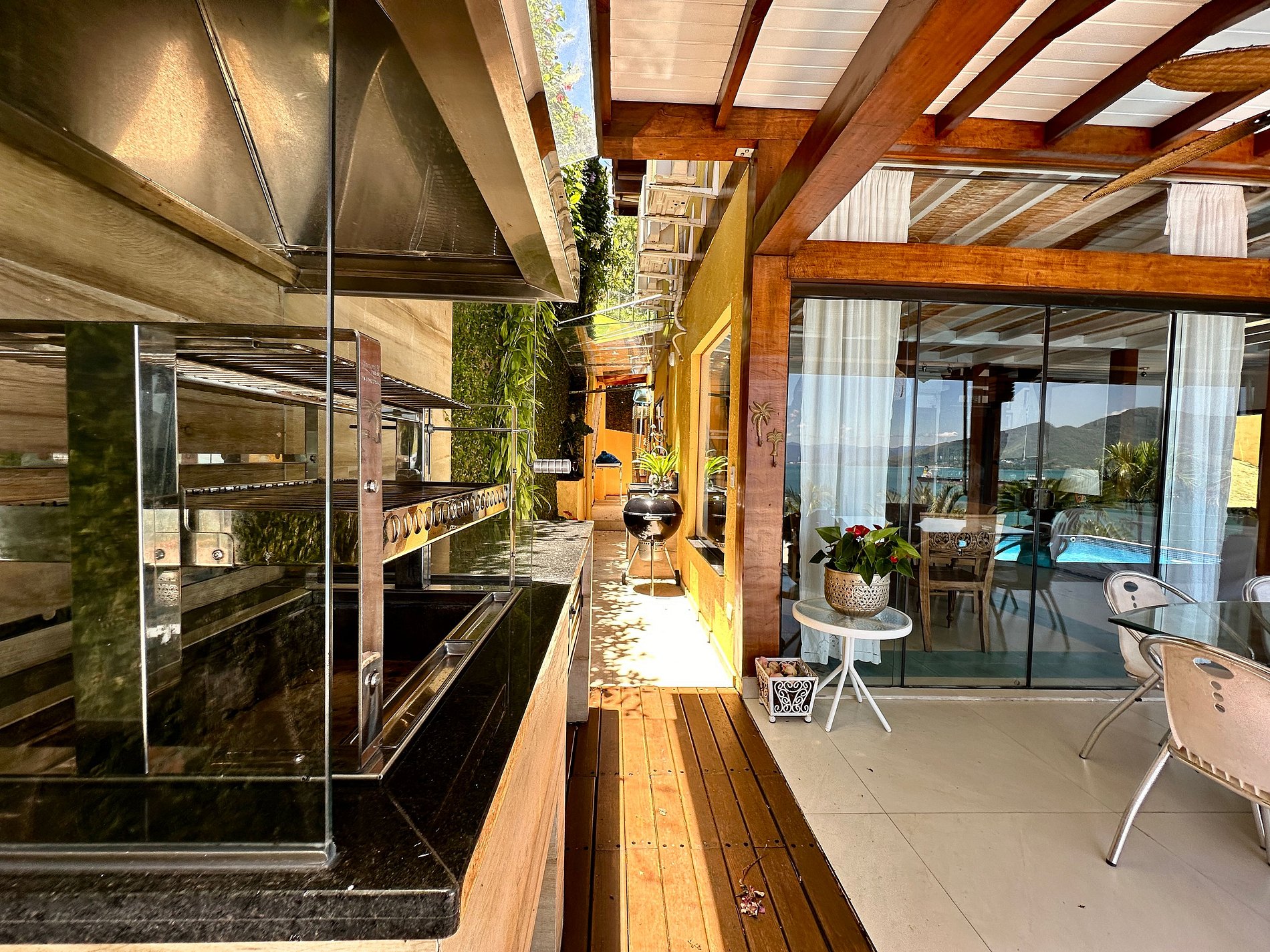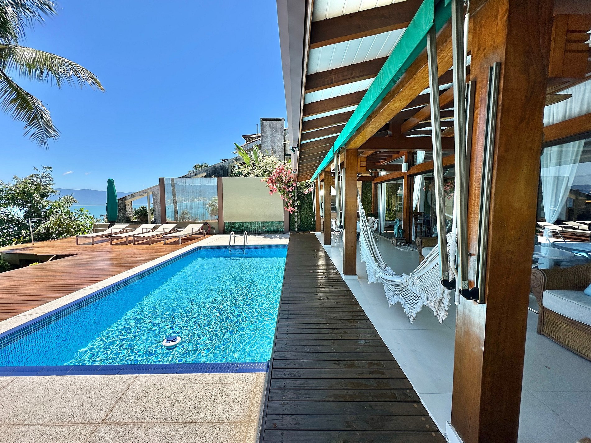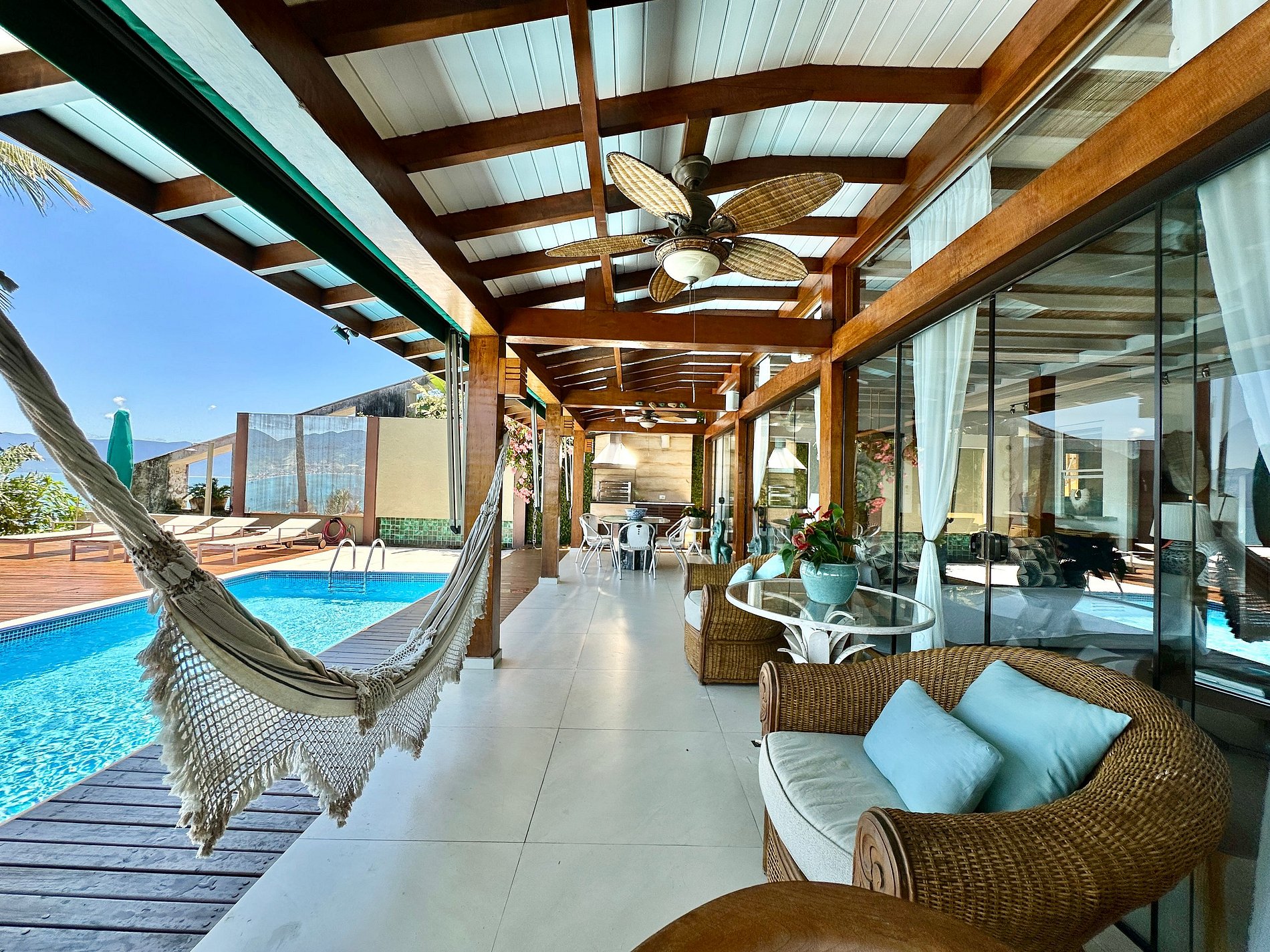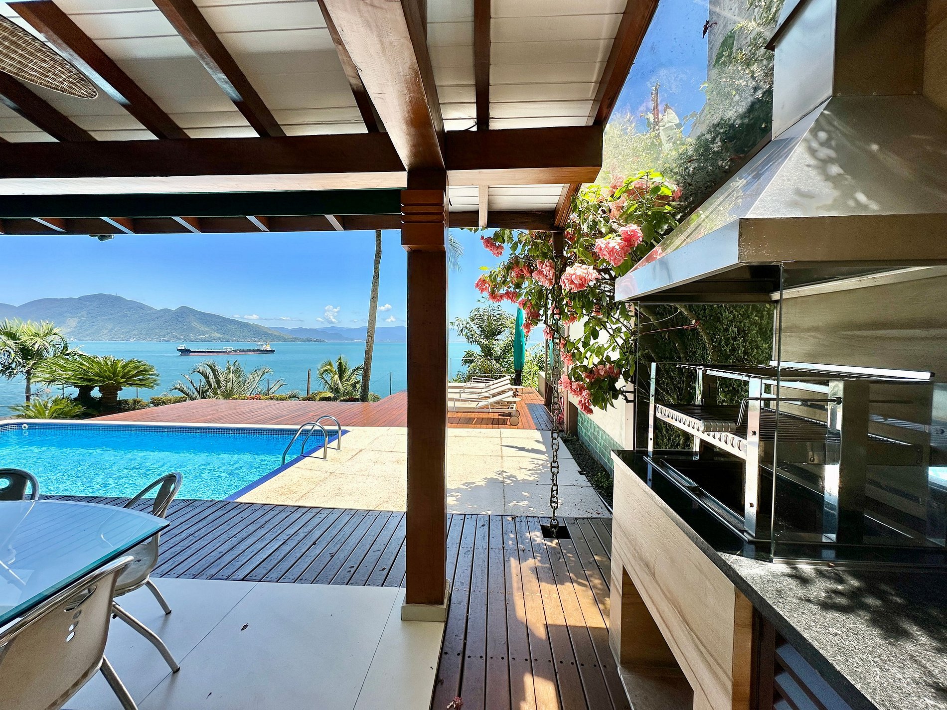 - Área externa com ampla varanda com móveis, espaço gourmet com churrasqueira e uma piscina com uma vista incrível para o mar;
