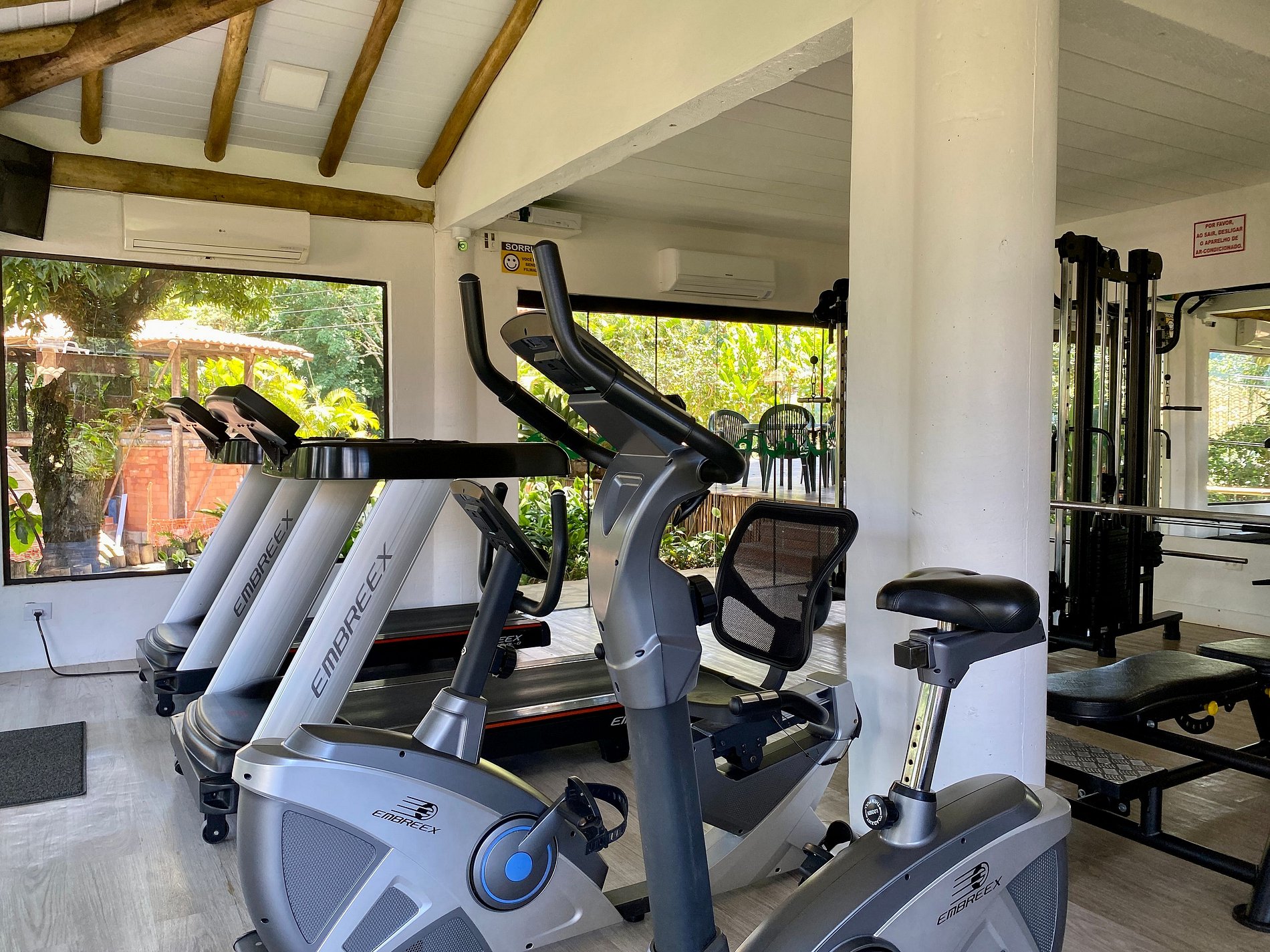 - Ambiente interno todo integrado e climatizado, com banheiro completo, salas de estar, TV, jantar e cozinha completa;