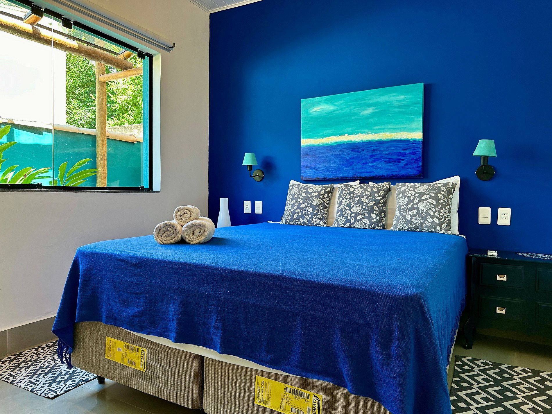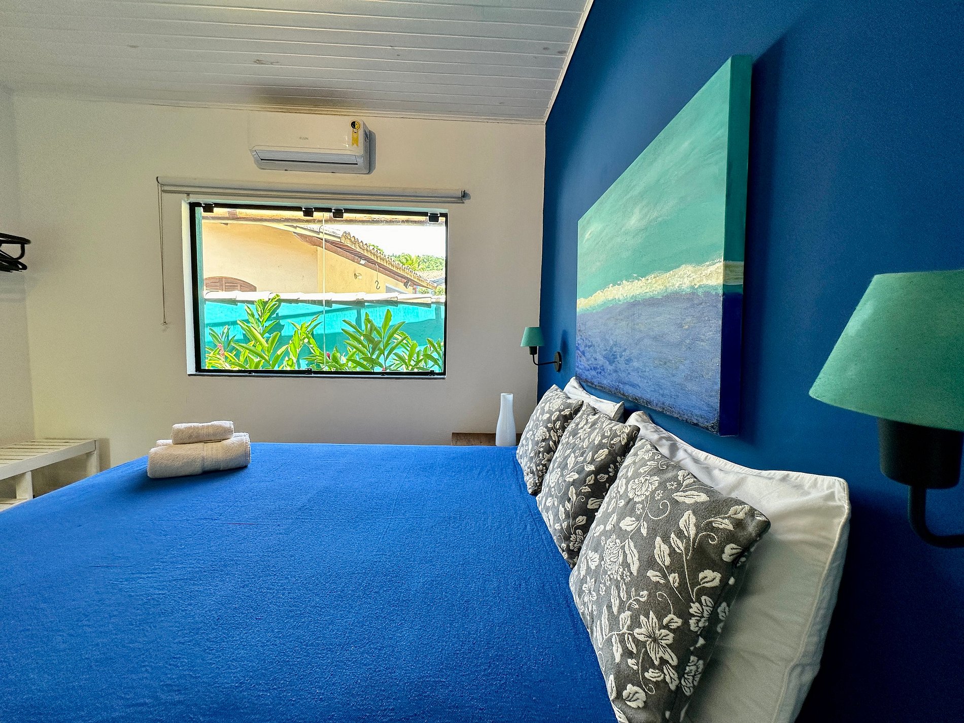 São 4 suítes, todas com ar-condicionado e enxoval completo, na seguinte configuração: