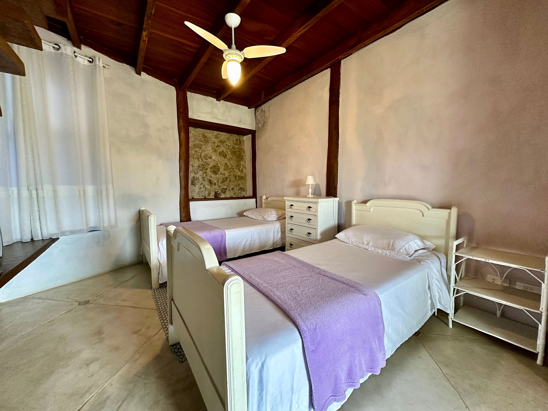 Localizada no charmoso bairro de Santa Tereza, a 12 minutos a pé da praia e 15 minutos da Vila Histórica. Ambiente familiar e tranquilo, perfeito para grupos familiares. Ideal para 10 pessoas. São 3 suítes e 1 quarto, todos com ar-condicionado. Área externa incrível, com ampla varanda, vista para o mar, piscina e espaço gourmet com churrasqueira e forno de pizza e a lenha. Salas de estar, TV e jantar integradas. Cozinha muito bem equipada. Smart TV, canais a cabo e Wi-fi.