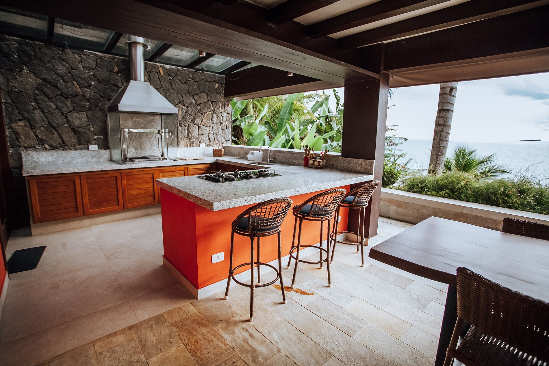 Toda a área de lazer está neste pavimento e o acesso se dá por uma escada. Um espaço integrado e muito agradável, que concentra uma bela piscina de borda infinita, de frente para o mar, com muitas espreguiçadeiras e guarda-sóis, banheiro completo e uma área gourmet incrível, com uma churrasqueira também com vista para o mar e uma mesa para refeições ao ar-livre. Local ideal para viver e compartilhar experiências inesquecíveis.