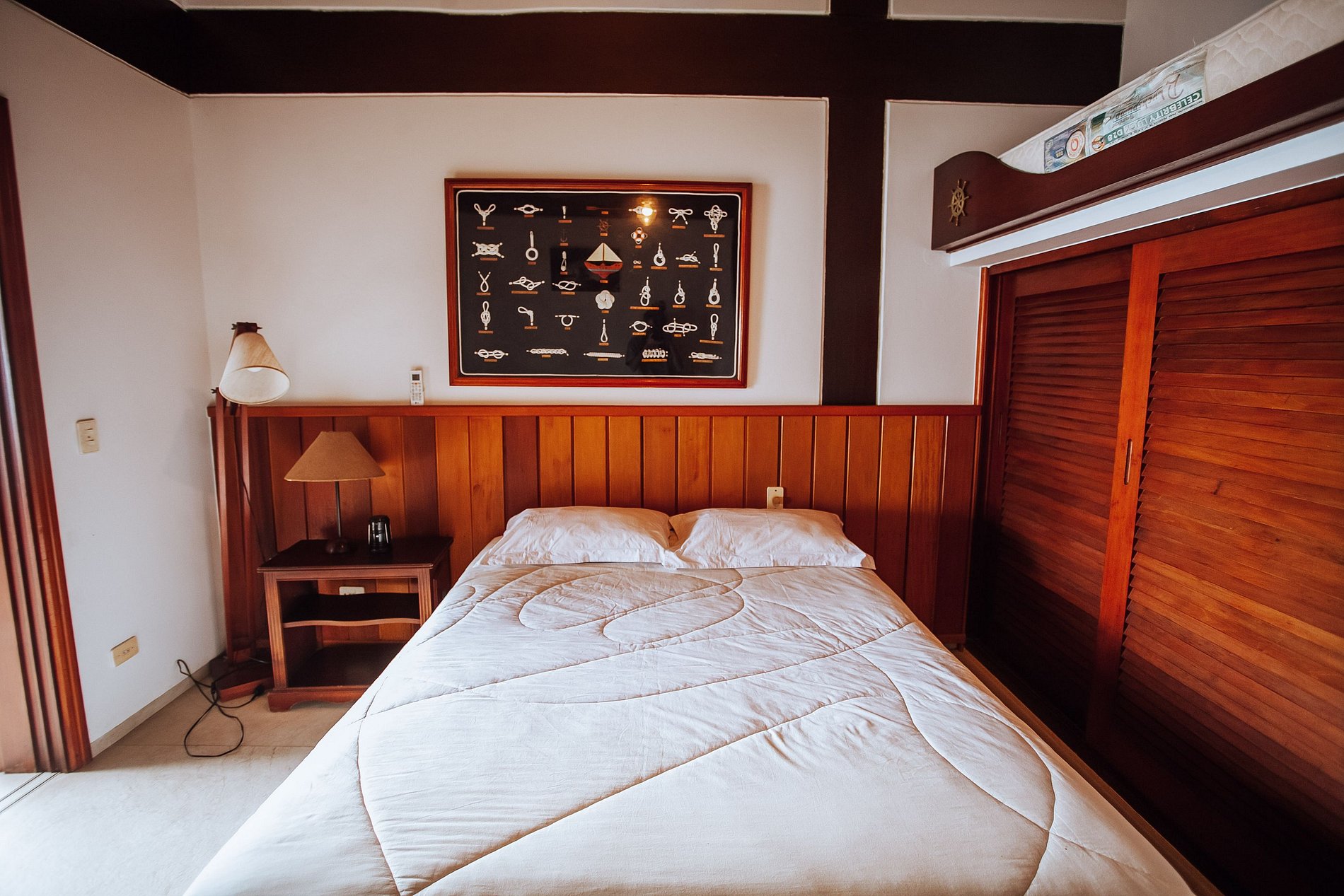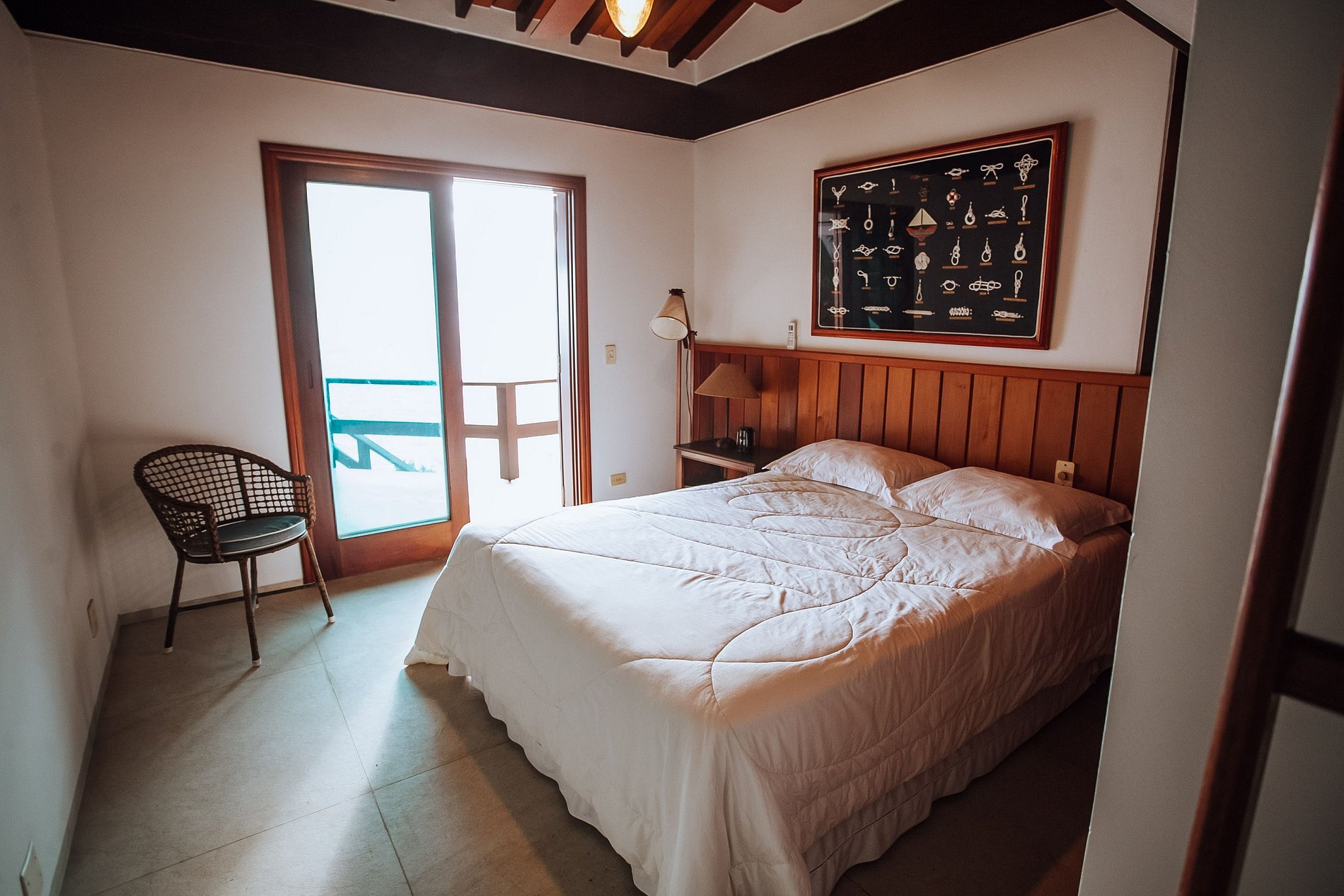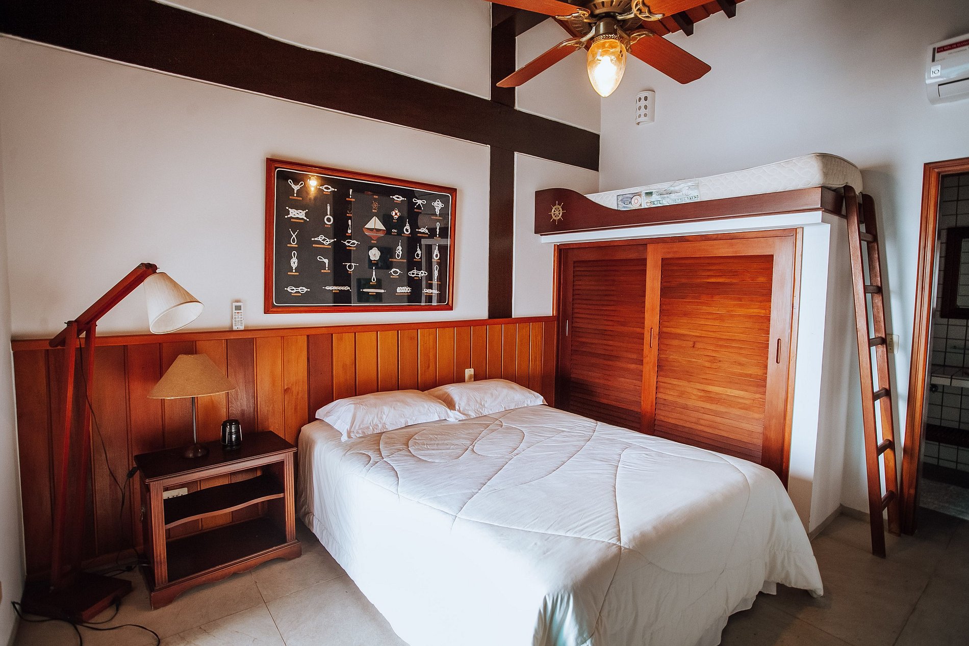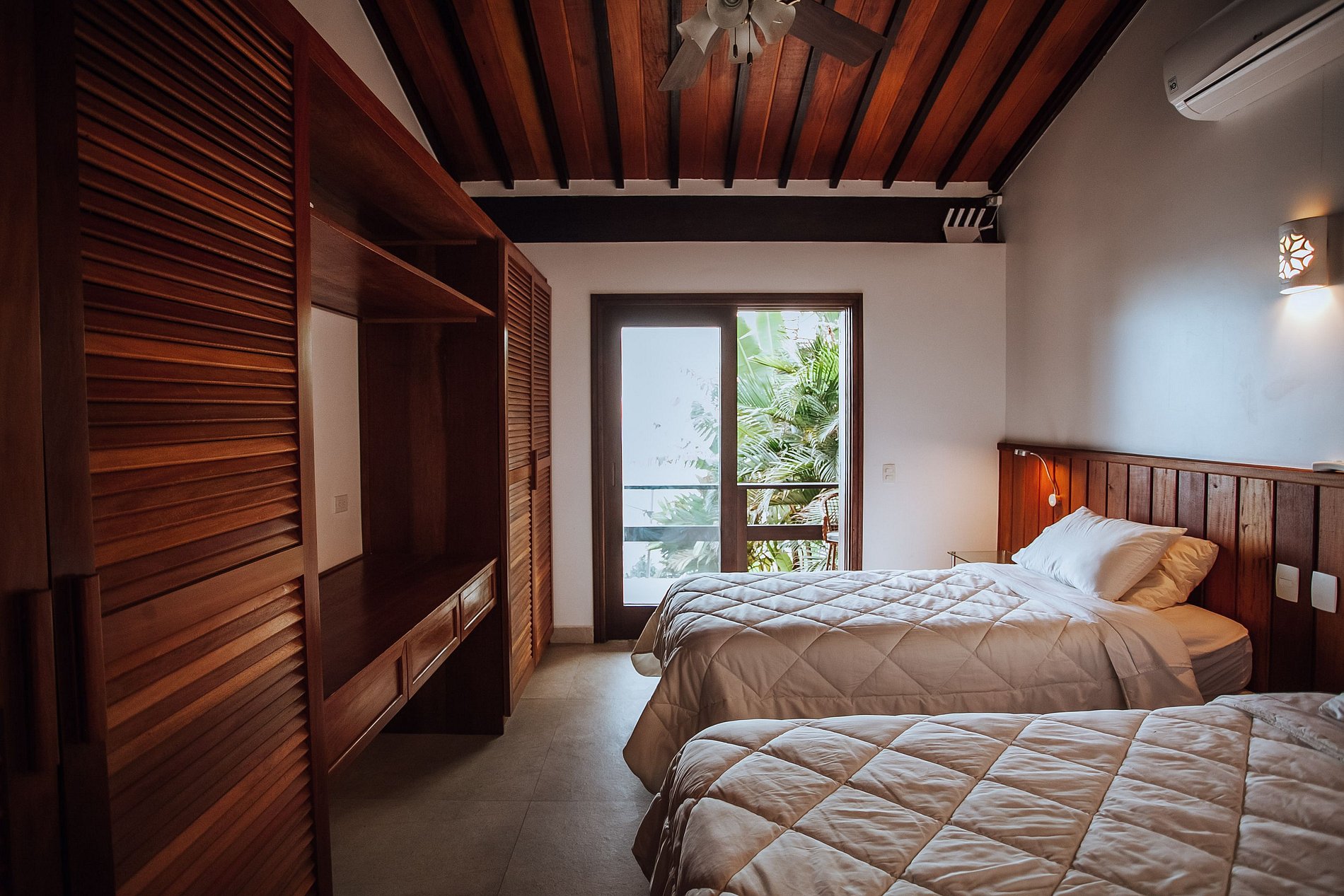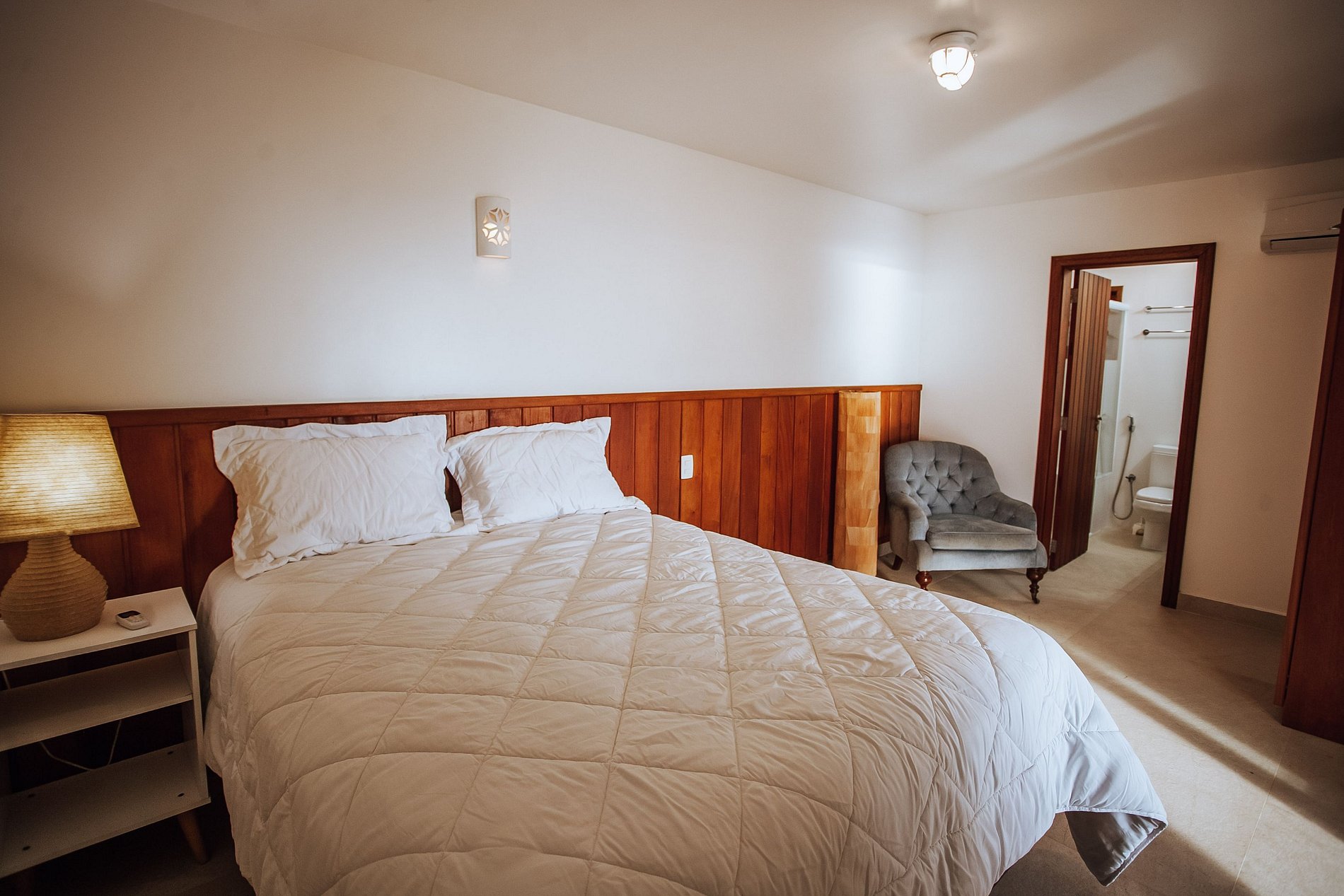 Suíte 4 - cama de casal queen; ar-condicionado, ventiladores, varanda e enxoval completo, com roupas de cama, banho e cobertores.