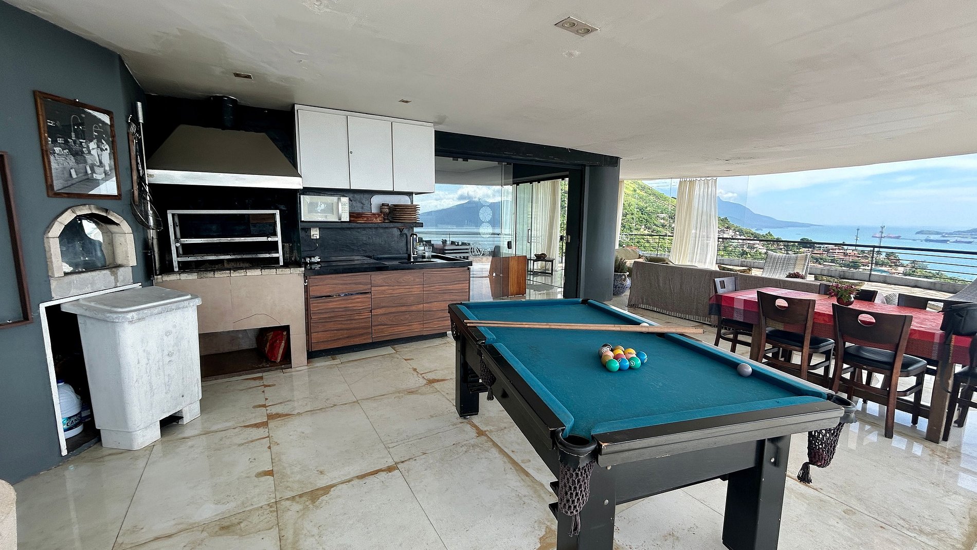 - Área externa com ampla varanda mobiliada, espaço gourmet com churrasqueira, forno de pizza, pia de apoio, mesa de sinuca, piscina com vista mar e espreguiçadeiras;