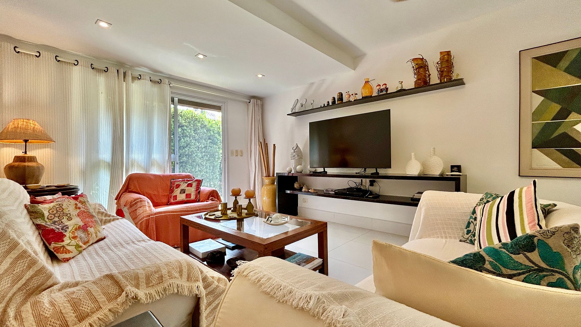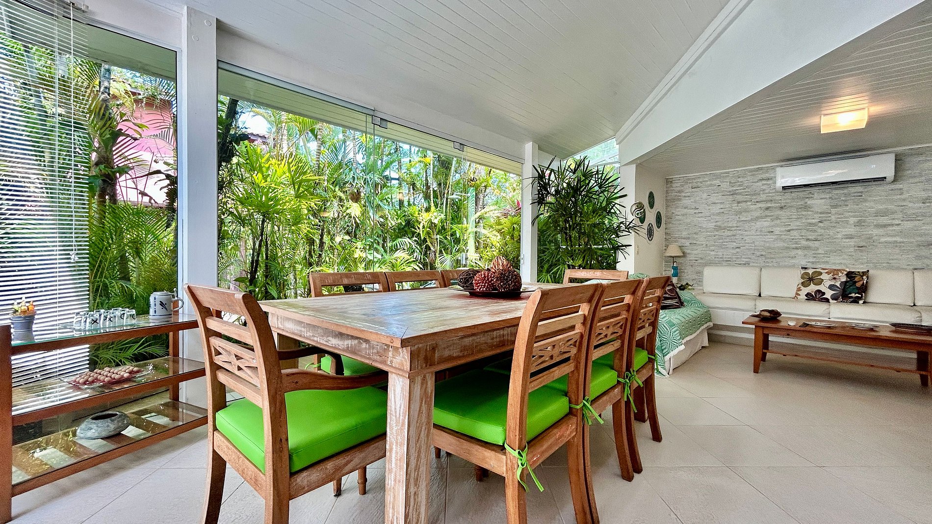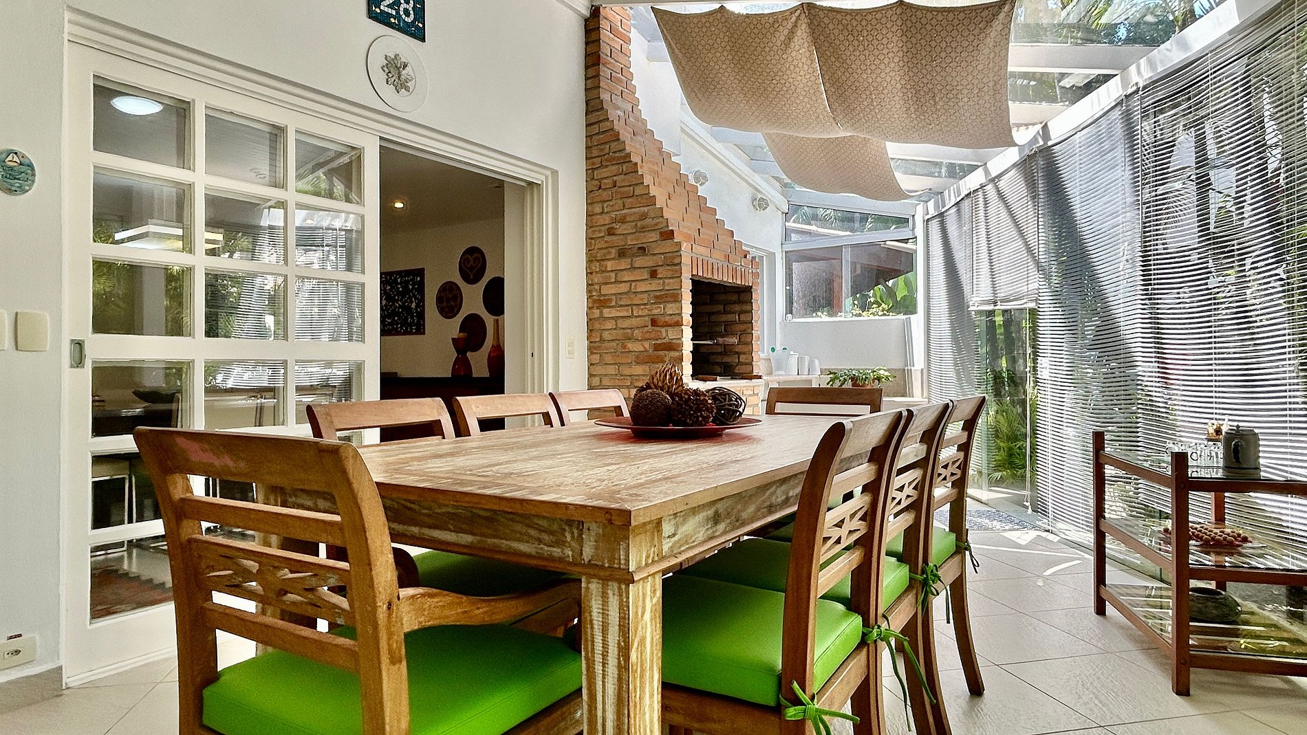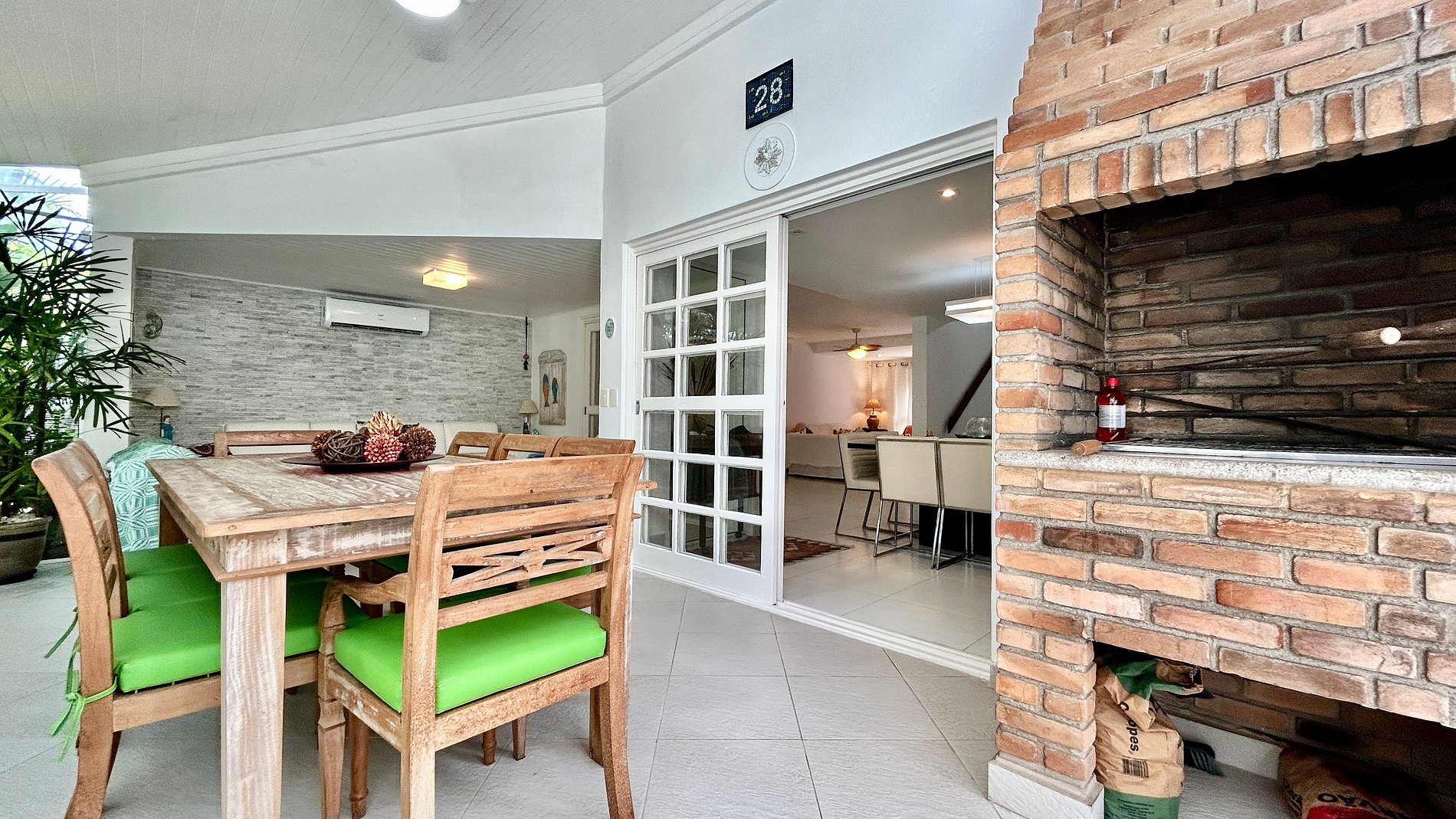 - Área interna com salas de estar, TV, jantar integradas, cozinha completa e um lavabo de apoio;