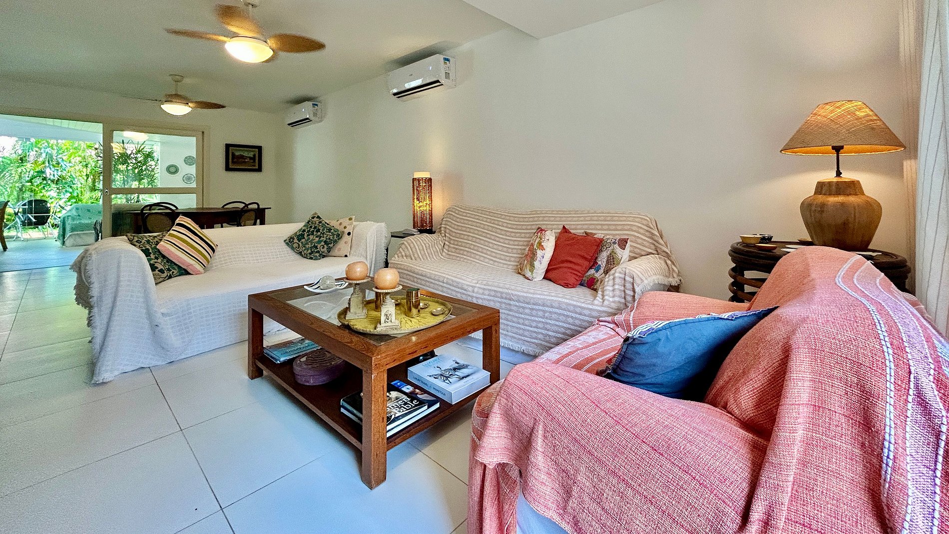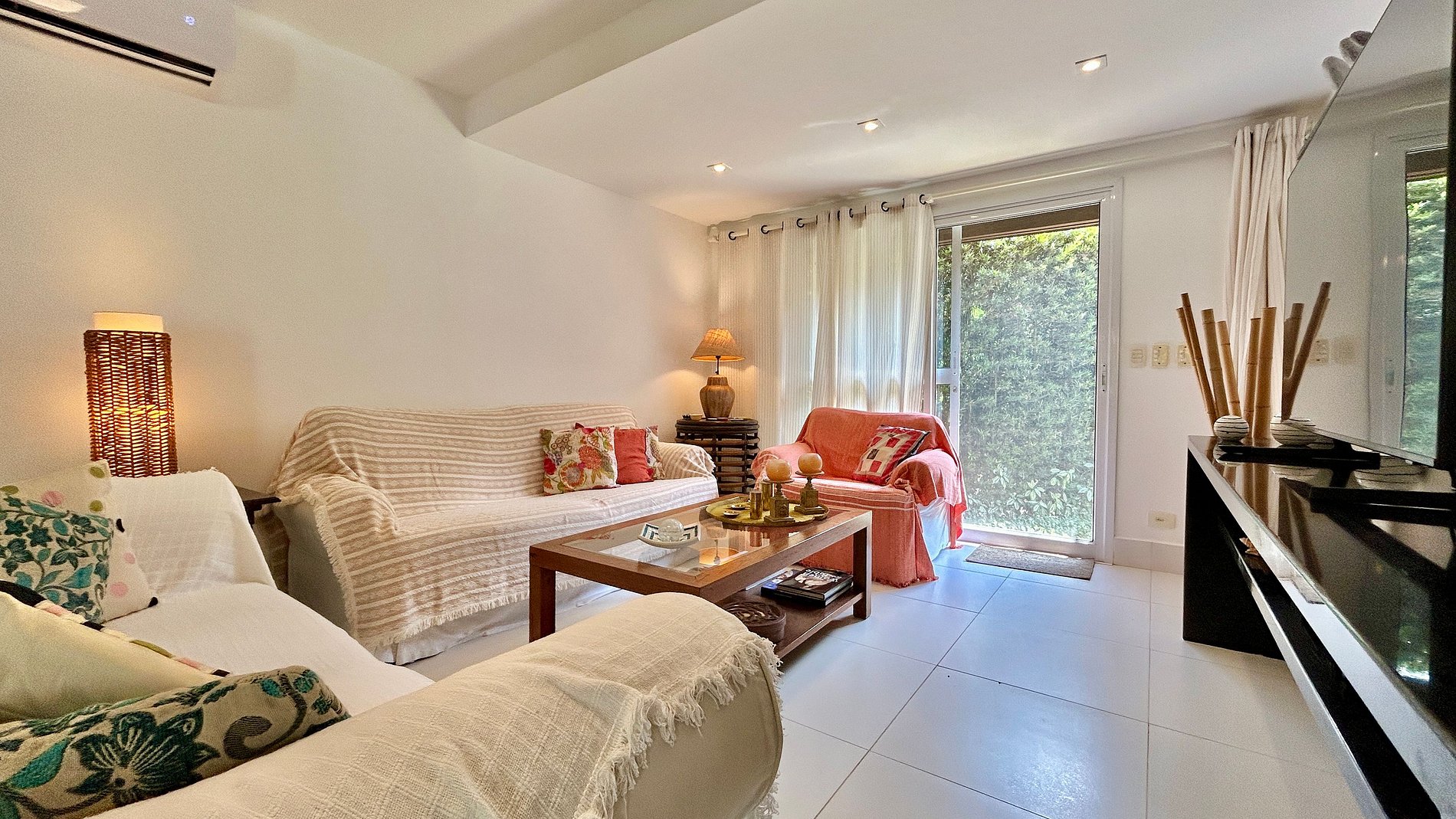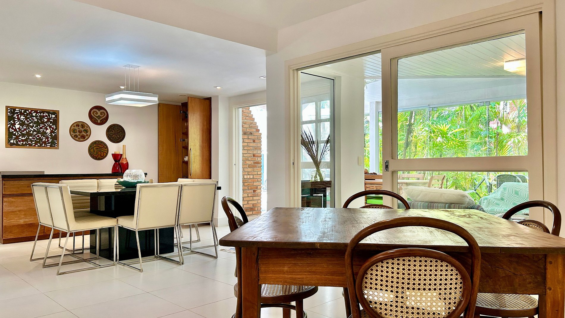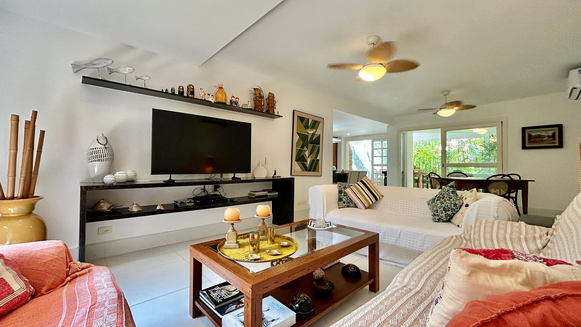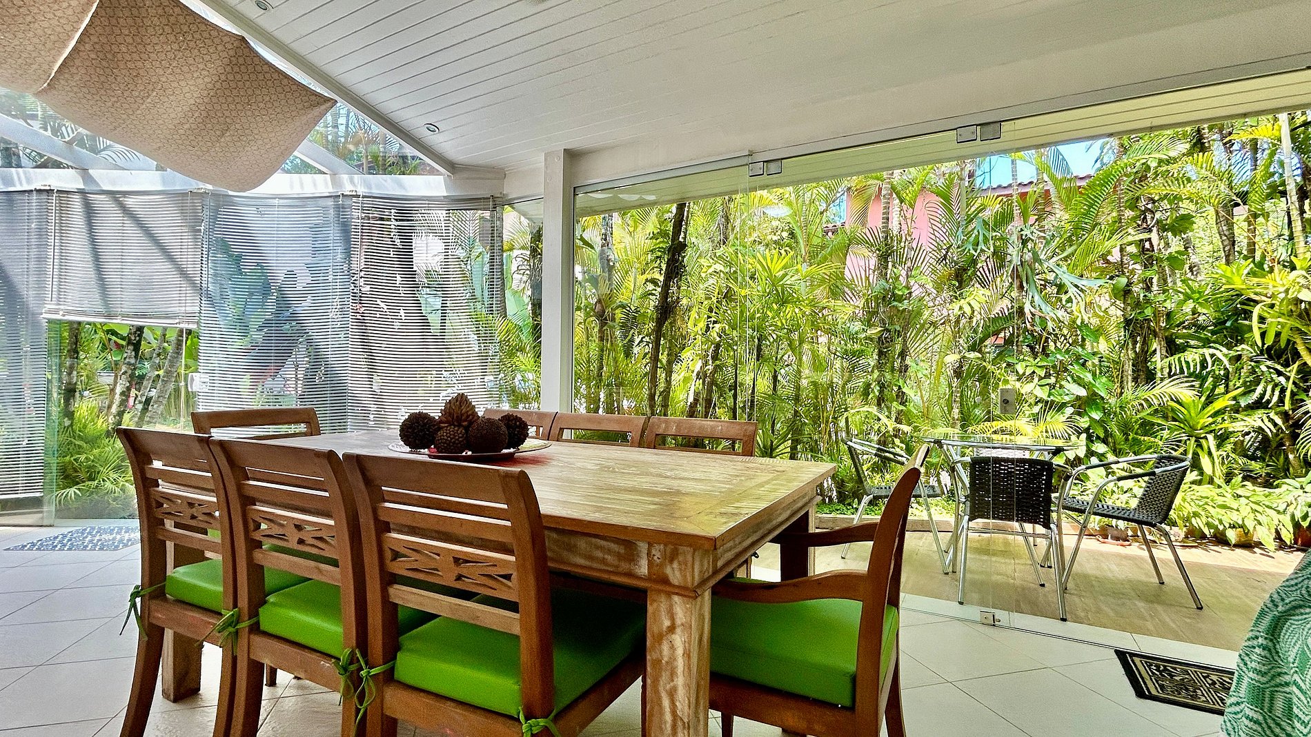 - Área interna com salas de estar, TV, jantar integradas, cozinha completa e um lavabo de apoio;