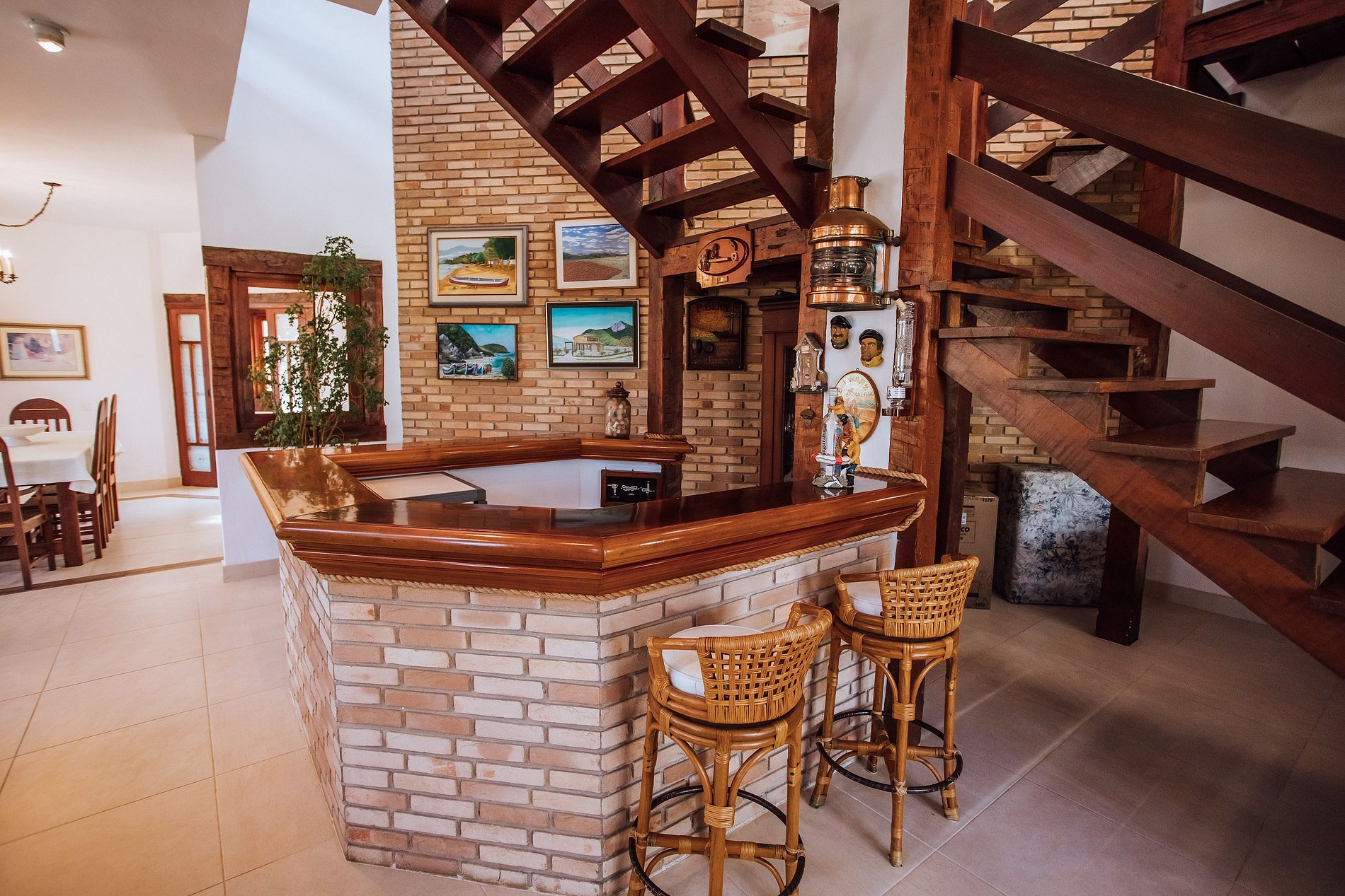 - O pavimento térreo concentra dois quartos externos (chalé ao lado da casa) e toda a parte social da casa, que é toda integrada: sala de estar, Smart TV com canais a cabo e Netflix, lareira, lavabo, sala de jogos, bar e sala de jantar, com acesso à uma varanda muito agradável, com rede, espaço gourmet com churrasqueira, forno a lenha e uma vista incrível para o mar e para a piscina.