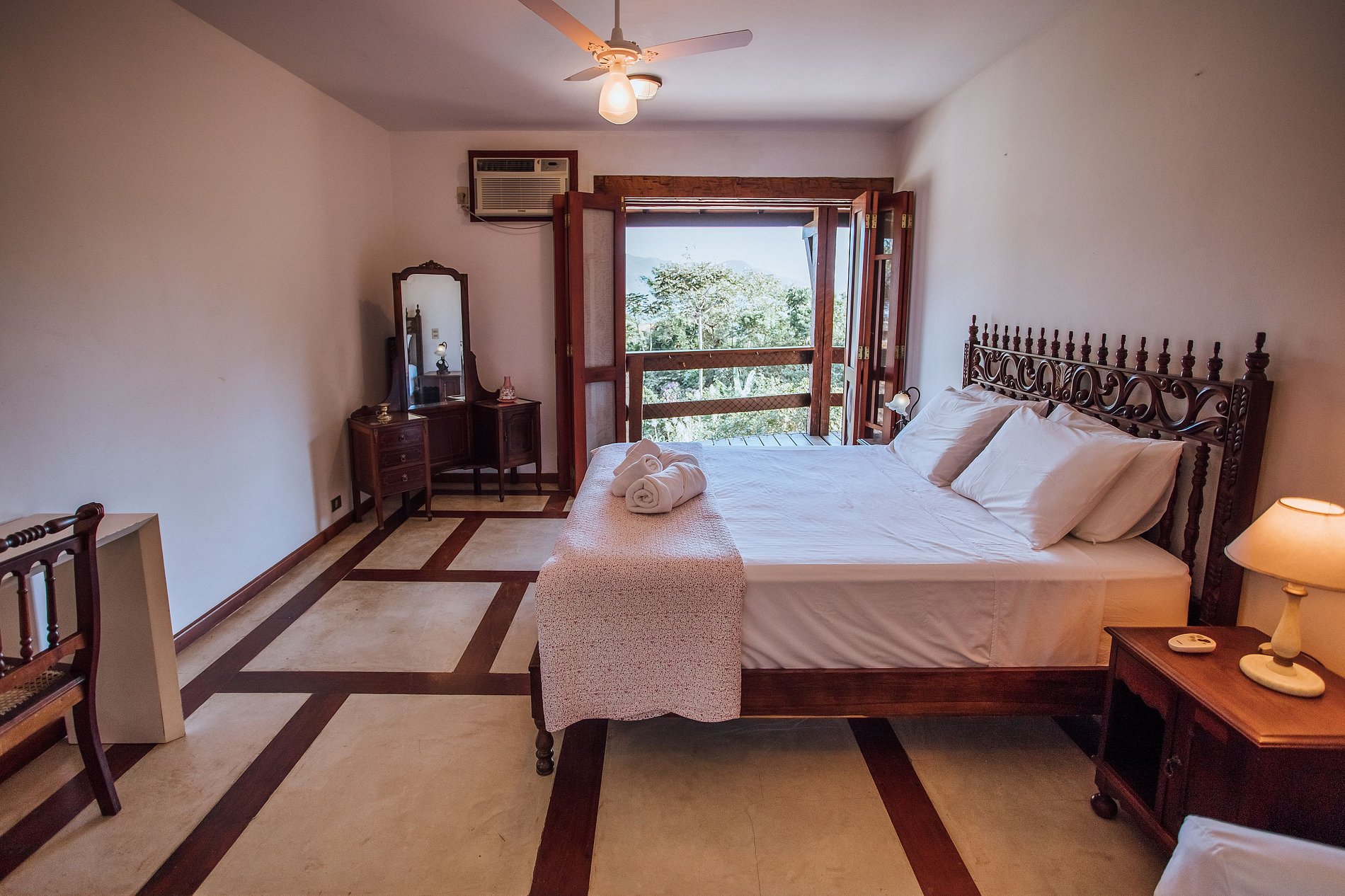 Suíte 4 - 1 cama de casal queen, vista para o jardim, ventilador, ar-condicionado, hidromassagem e enxoval completo.