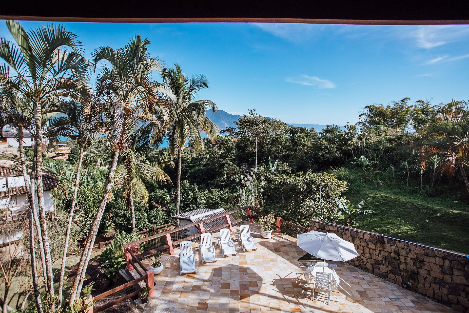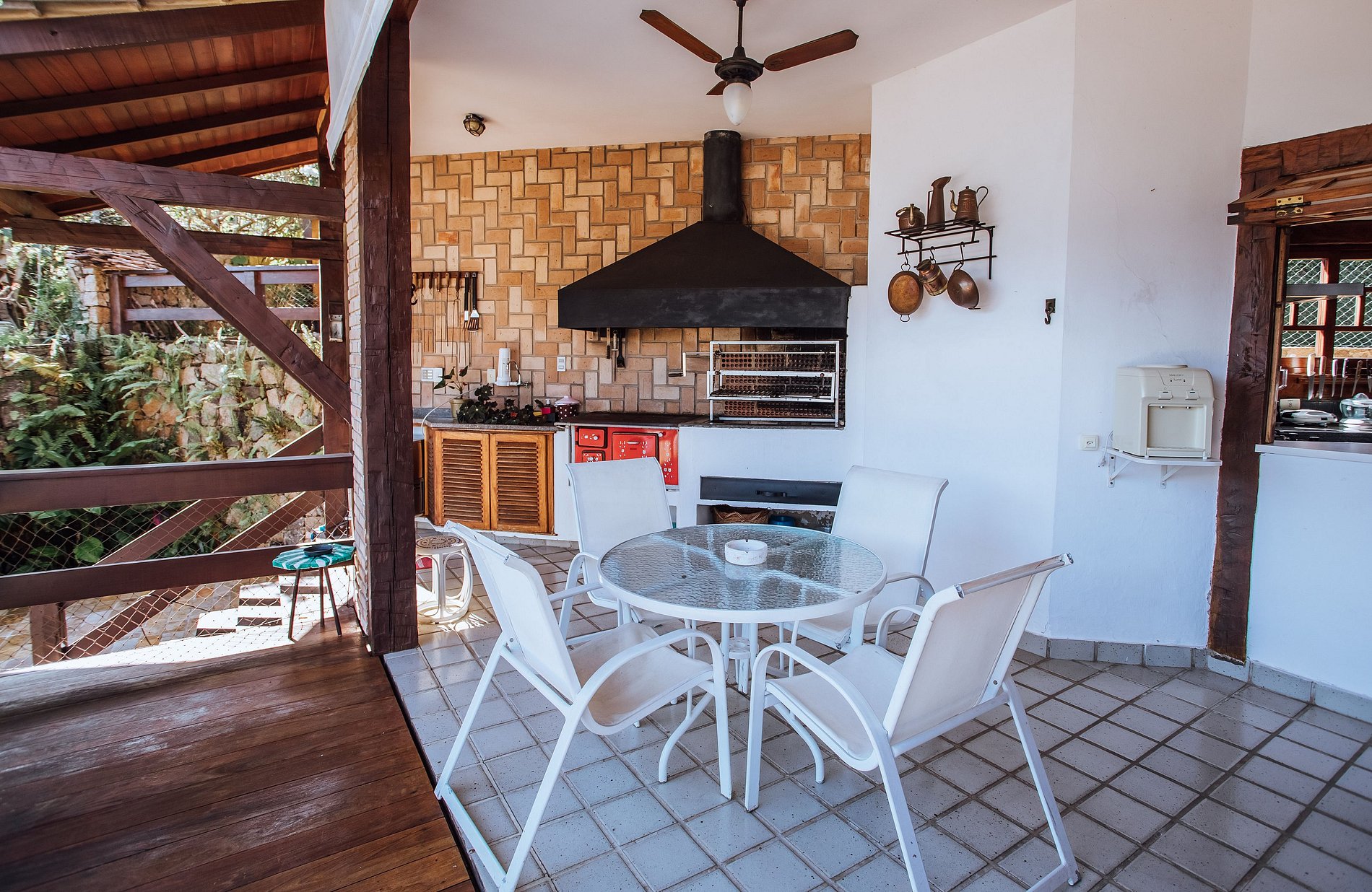- A parte externa fica alguns degraus abaixo e é um show, com um lindo jardim, piscina com mesas, cadeiras, guarda-sol, espreguiçadeiras e ducha, ideal para reunir familiares e amigos num encontro memorável.