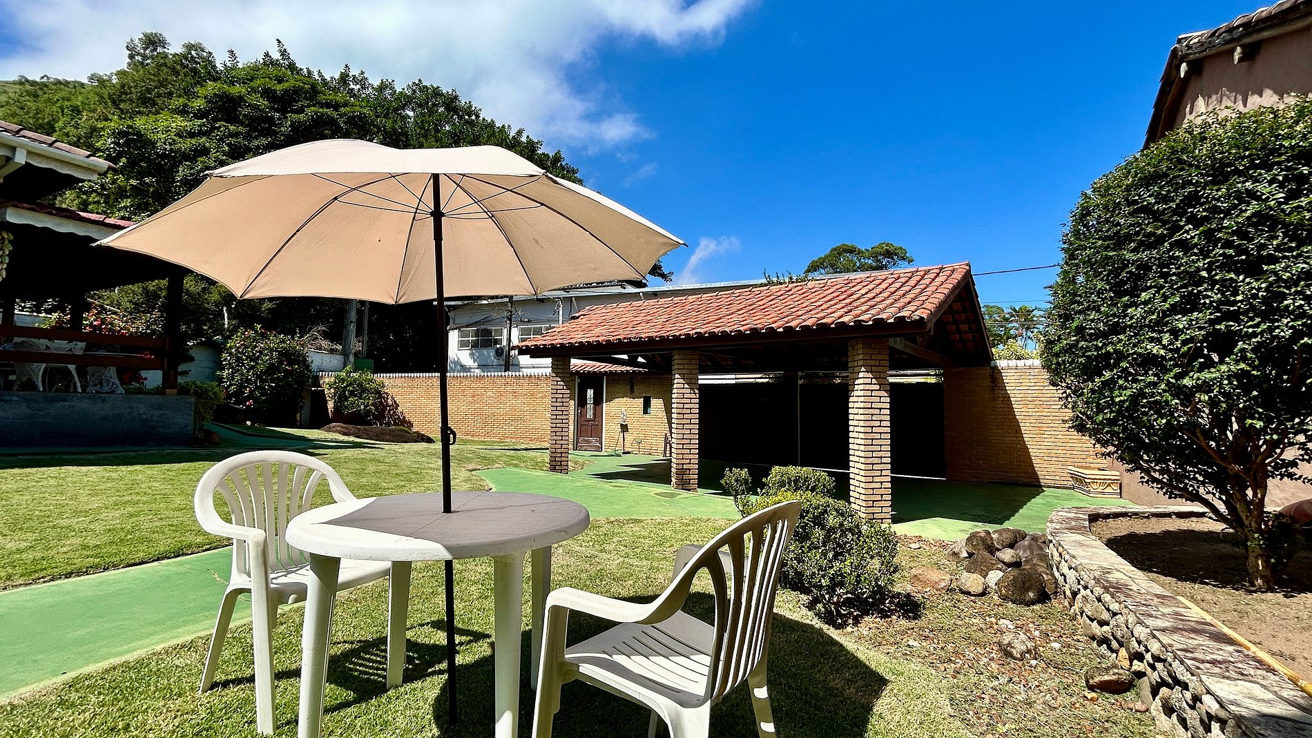 - Conta com jardim com árvores frutíferas (banana, pitanga, jabuticaba) e um espaço gourmet com churrasqueira, banheiro de apoio e mesa para refeições ao ar livre;