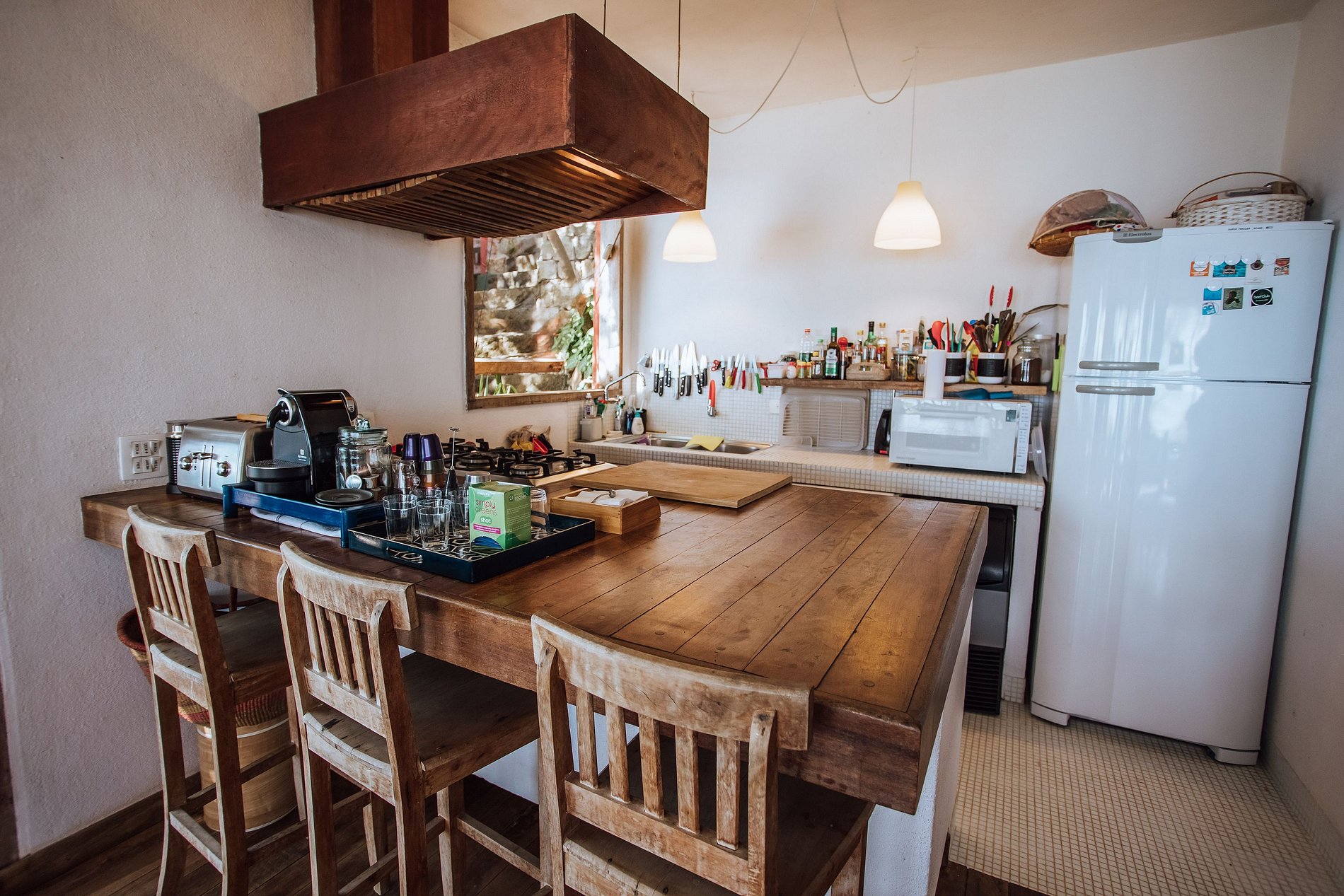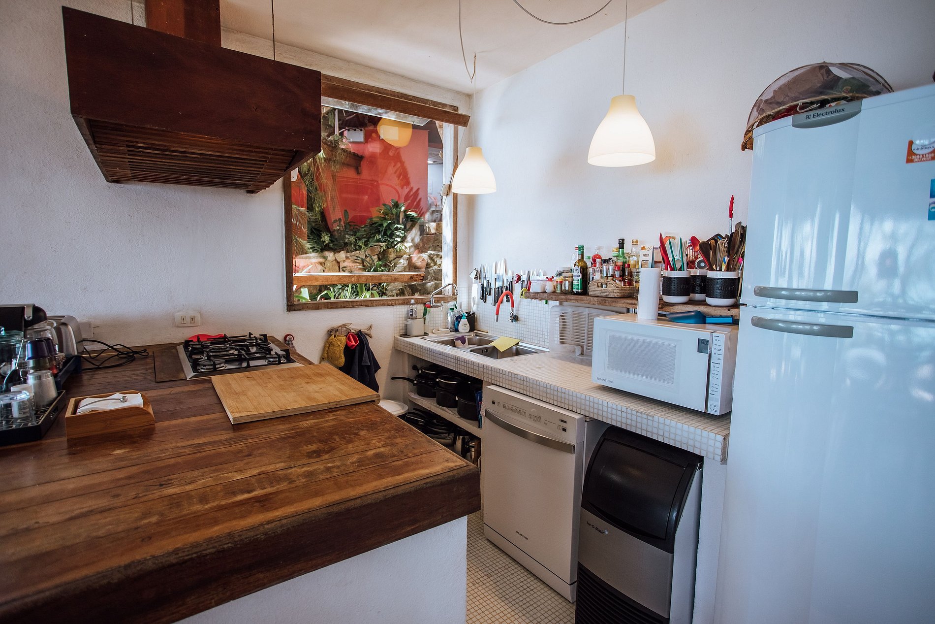 A cozinha é muito bem equipada e tem cafeteira com coador, cafeteira Nespresso, filtro de água, fogão, forno, geladeira com freezer, máquina de gelo, lava louça, liquidificador, torradeira, micro-ondas, louças, talheres e todos os utensílios necessários para uma estadia perfeita. Na lavanderia tem uma máquina de lavar e secar roupas e ferro de passar.