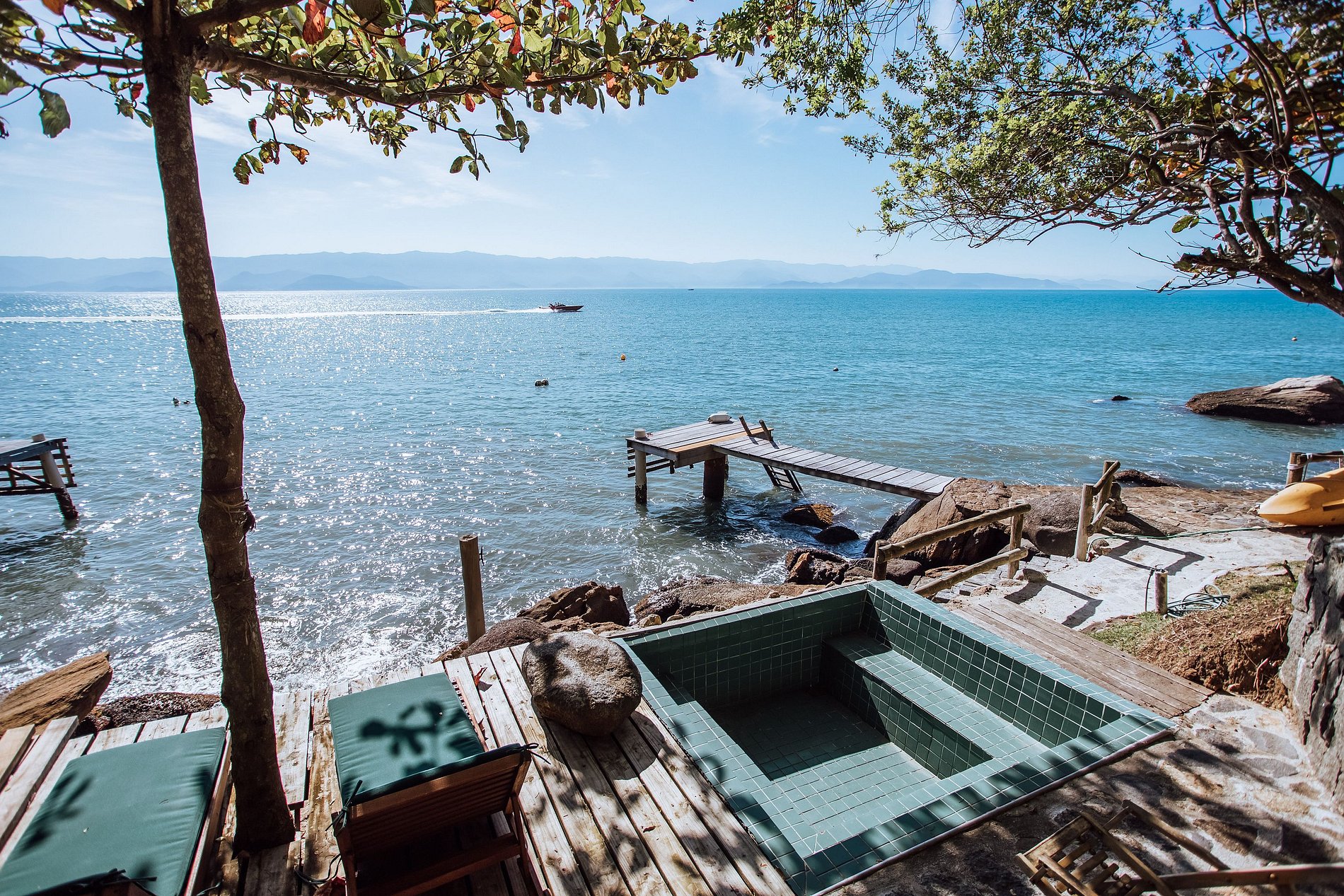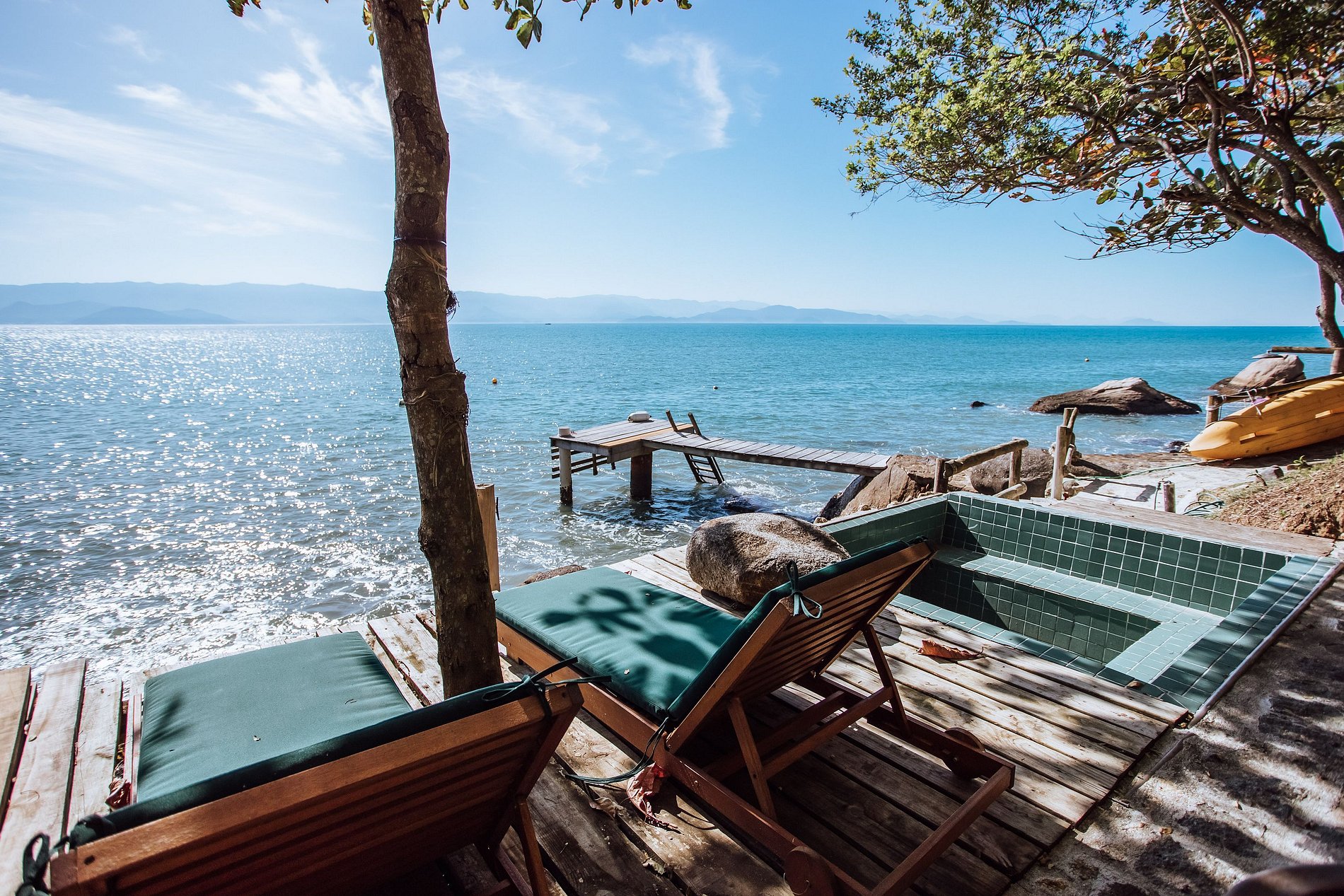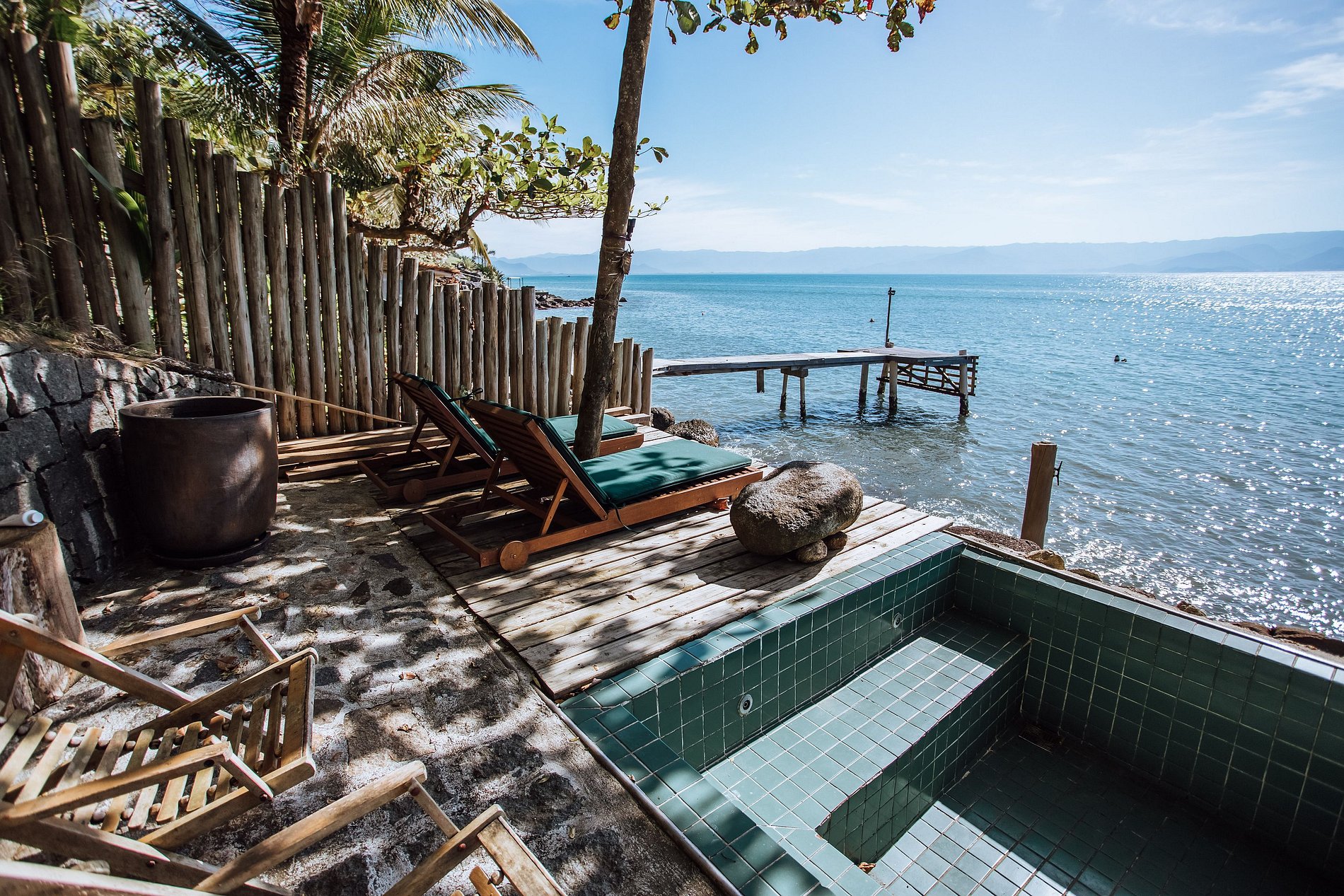 Na costeira o hóspede tem de um lado a área da piscina com confortáveis espreguiçadeiras e do outro o espaço gourmet com churrasqueira e um maravilhoso lounge. Um píer de madeira permite acesso ao mar, para mergulho, nado, prática de canoagem e stand up paddle. Um convite ao relaxamento!