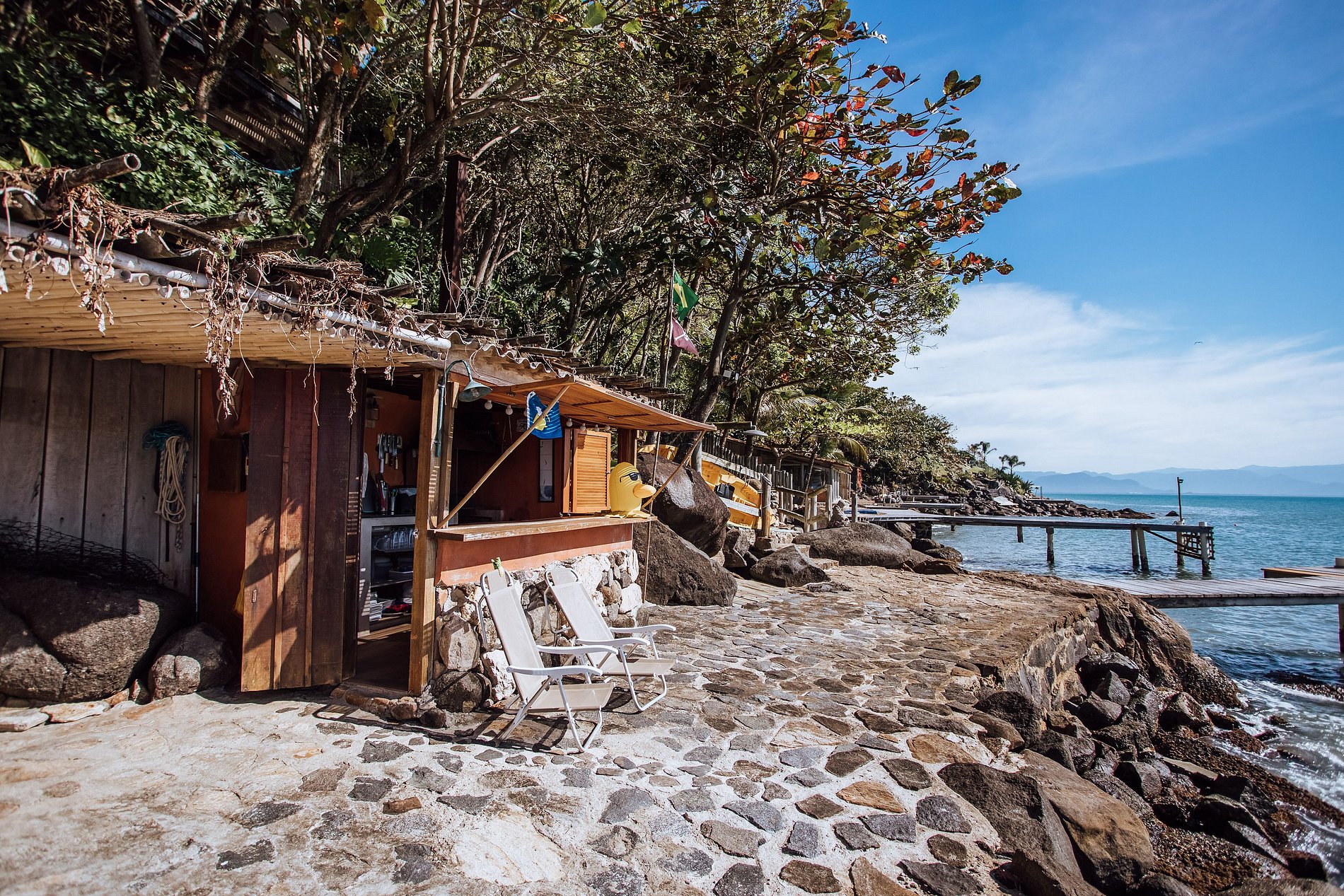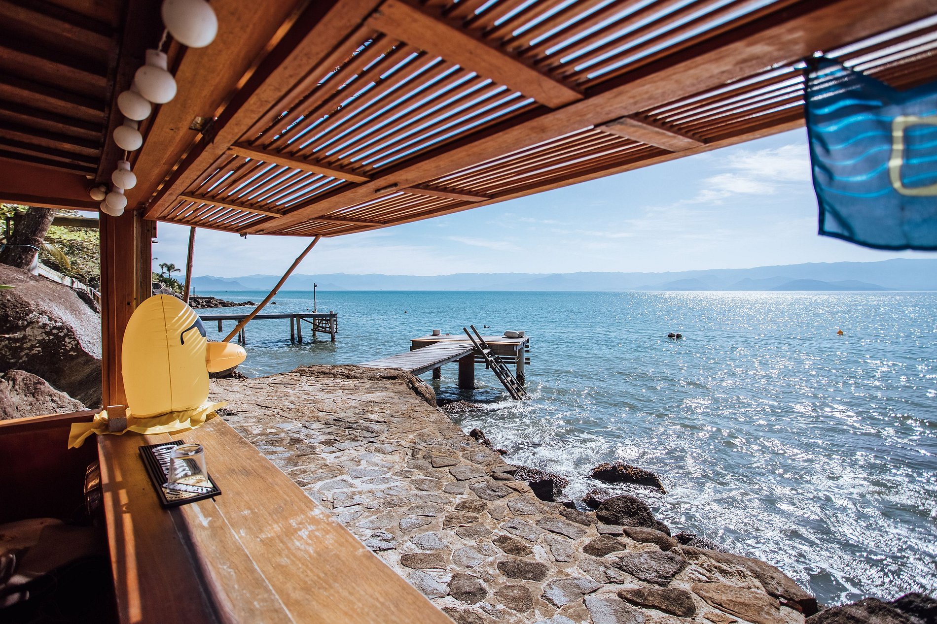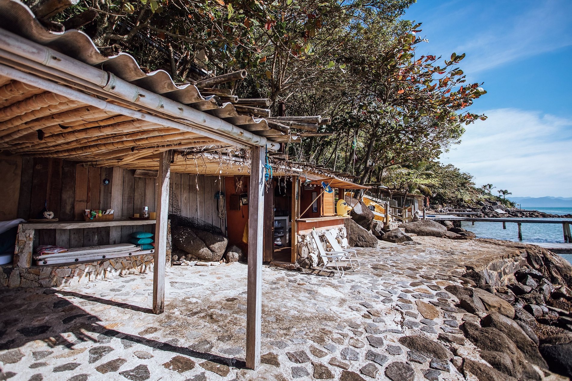 Na costeira o hóspede tem de um lado a área da piscina com confortáveis espreguiçadeiras e do outro o espaço gourmet com churrasqueira e um maravilhoso lounge. Um píer de madeira permite acesso ao mar, para mergulho, nado, prática de canoagem e stand up paddle. Um convite ao relaxamento!