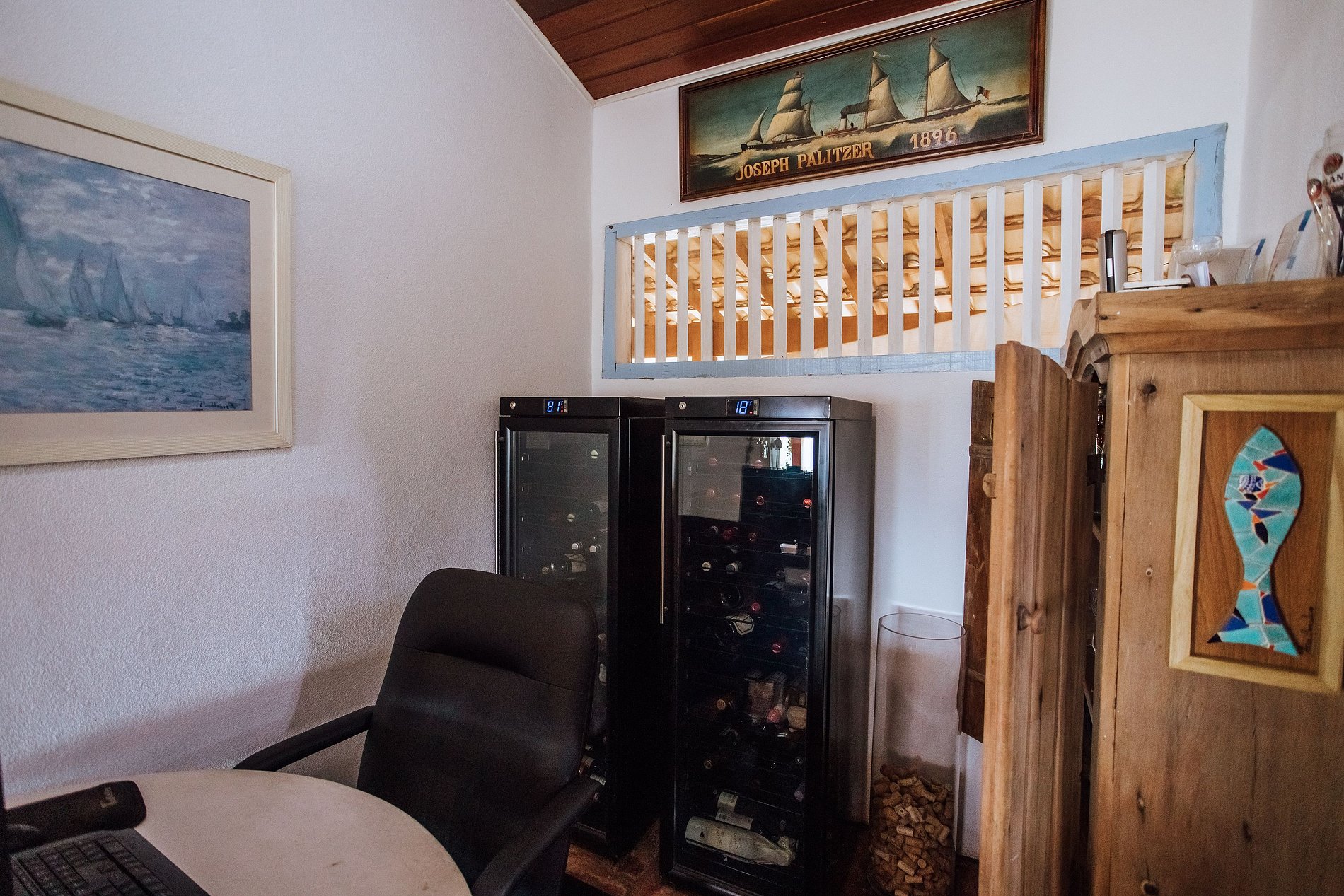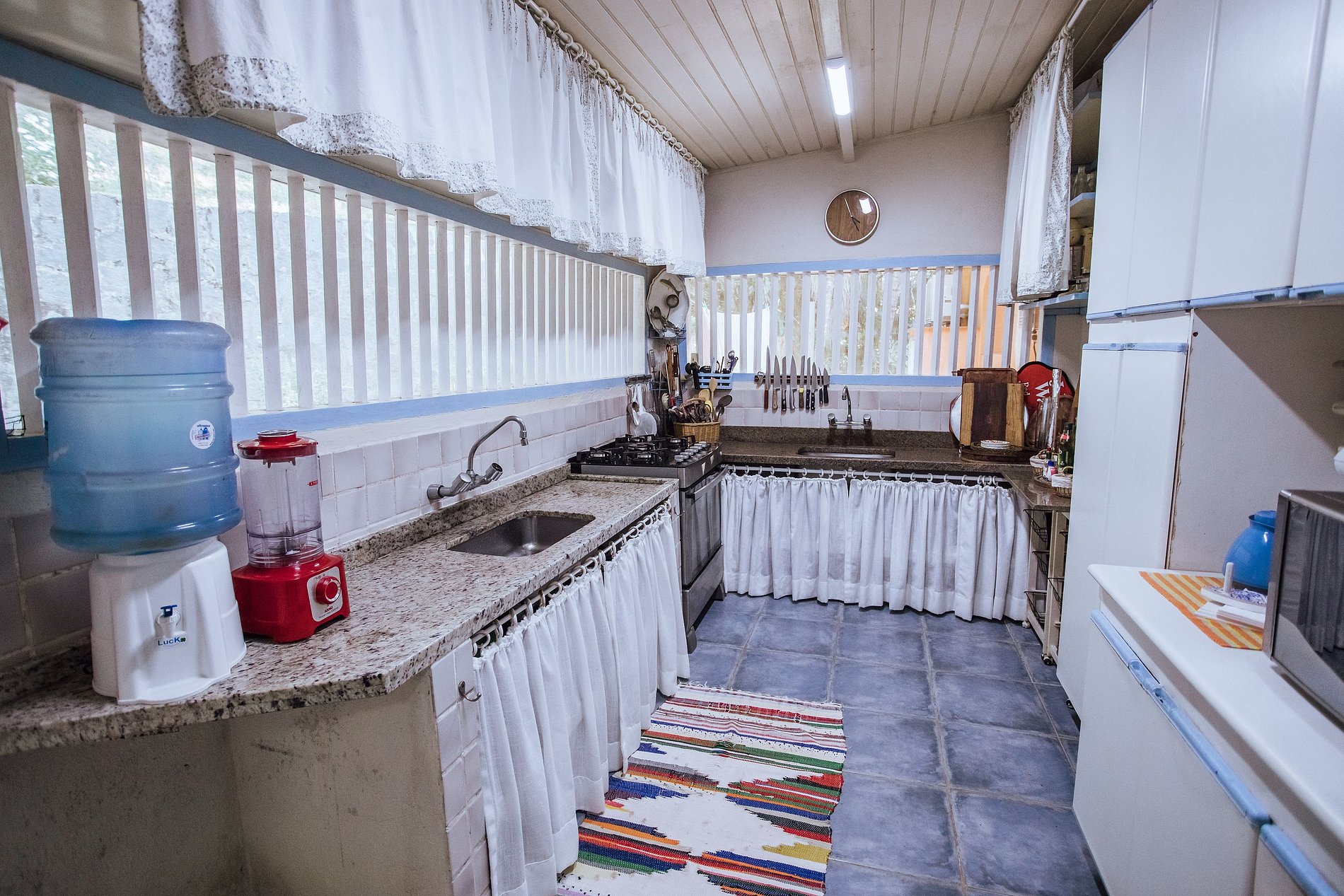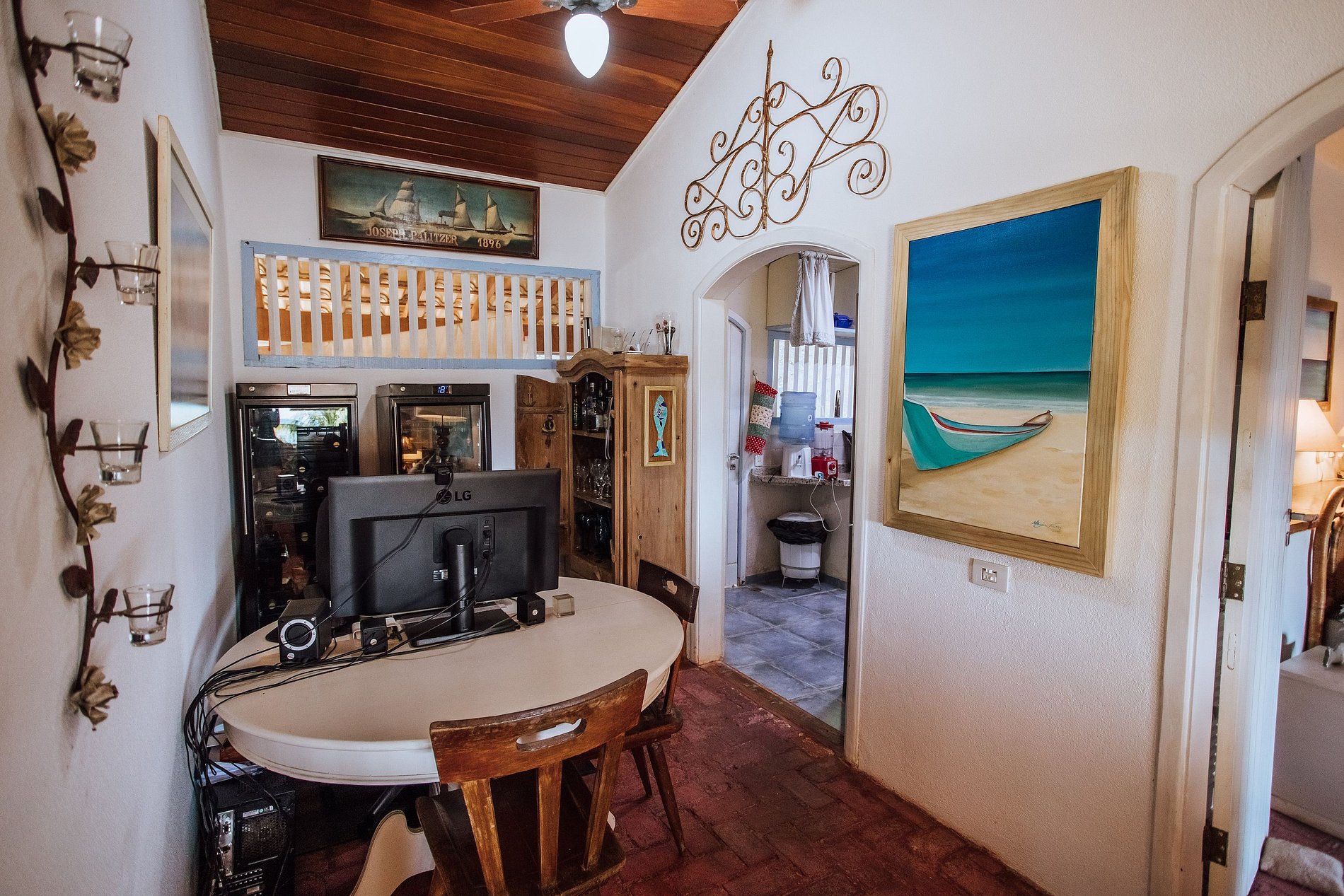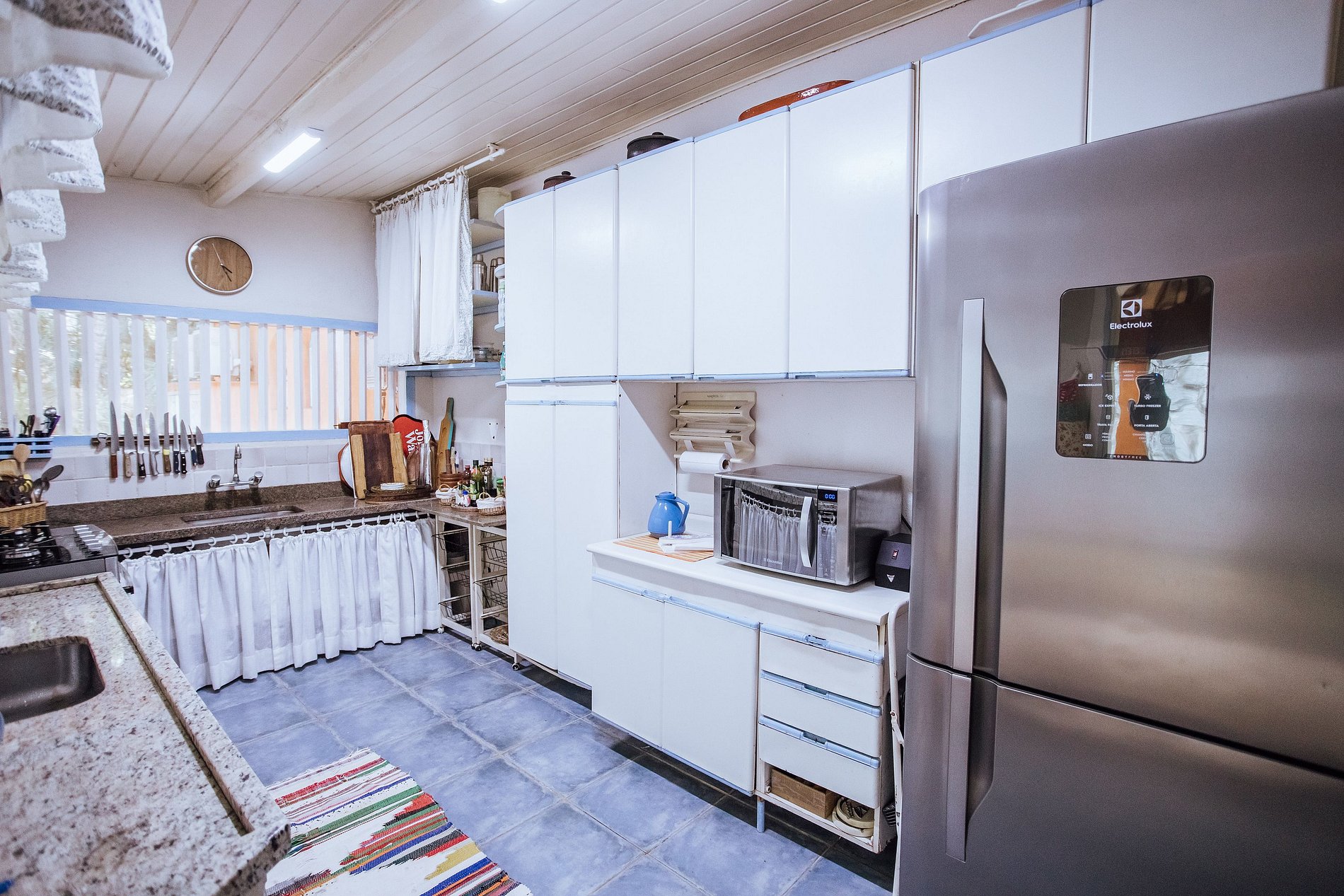 A área interna tem uma sala de estar (sem TV), uma mesa para trabalho, cervejeiras e uma cozinha bem equipada com fogão, forno, geladeira com freezer, micro-ondas, filtro de água, liquidificador, torradeira, louças e talheres e todos os itens necessários para uma perfeita estadia. E na lavanderia há uma máquina de lavar roupas.
