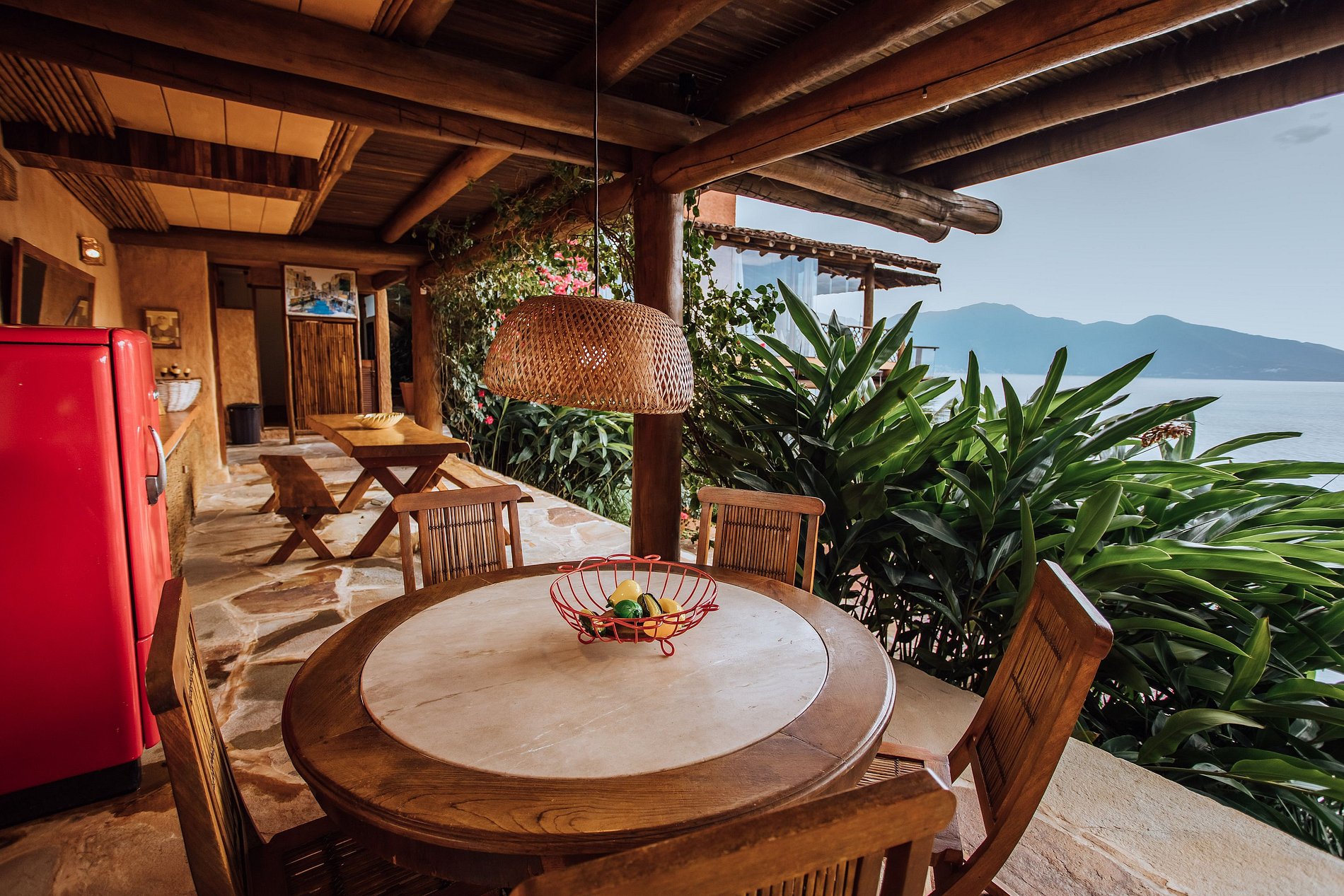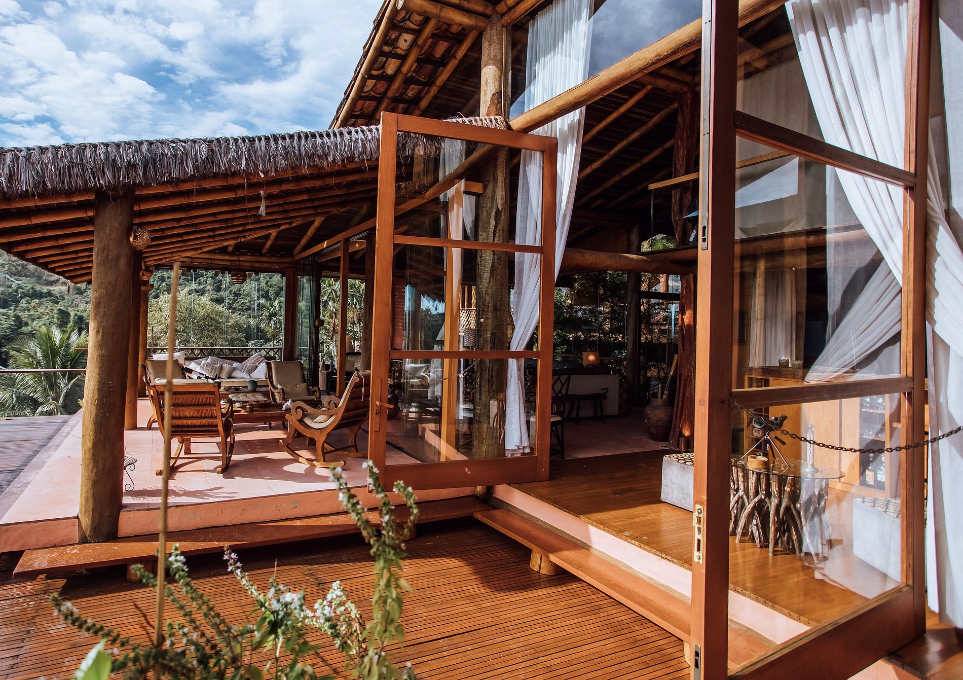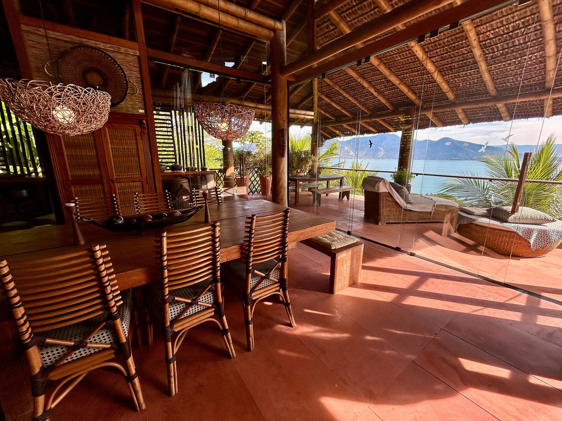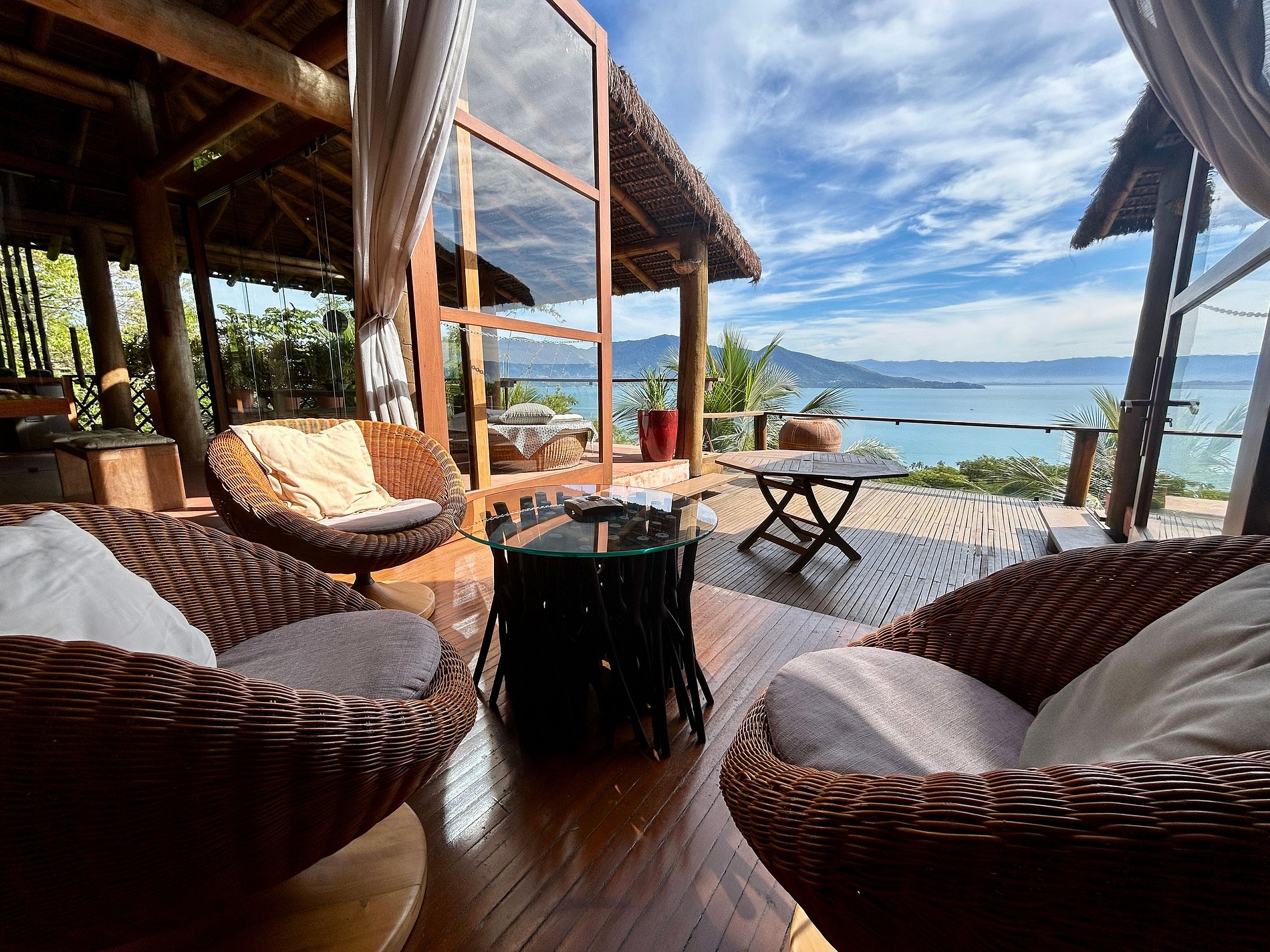 É totalmente voltada para o mar com varandas enormes em madeira e vidros, o que permite uma bela vista do mar e das montanhas.