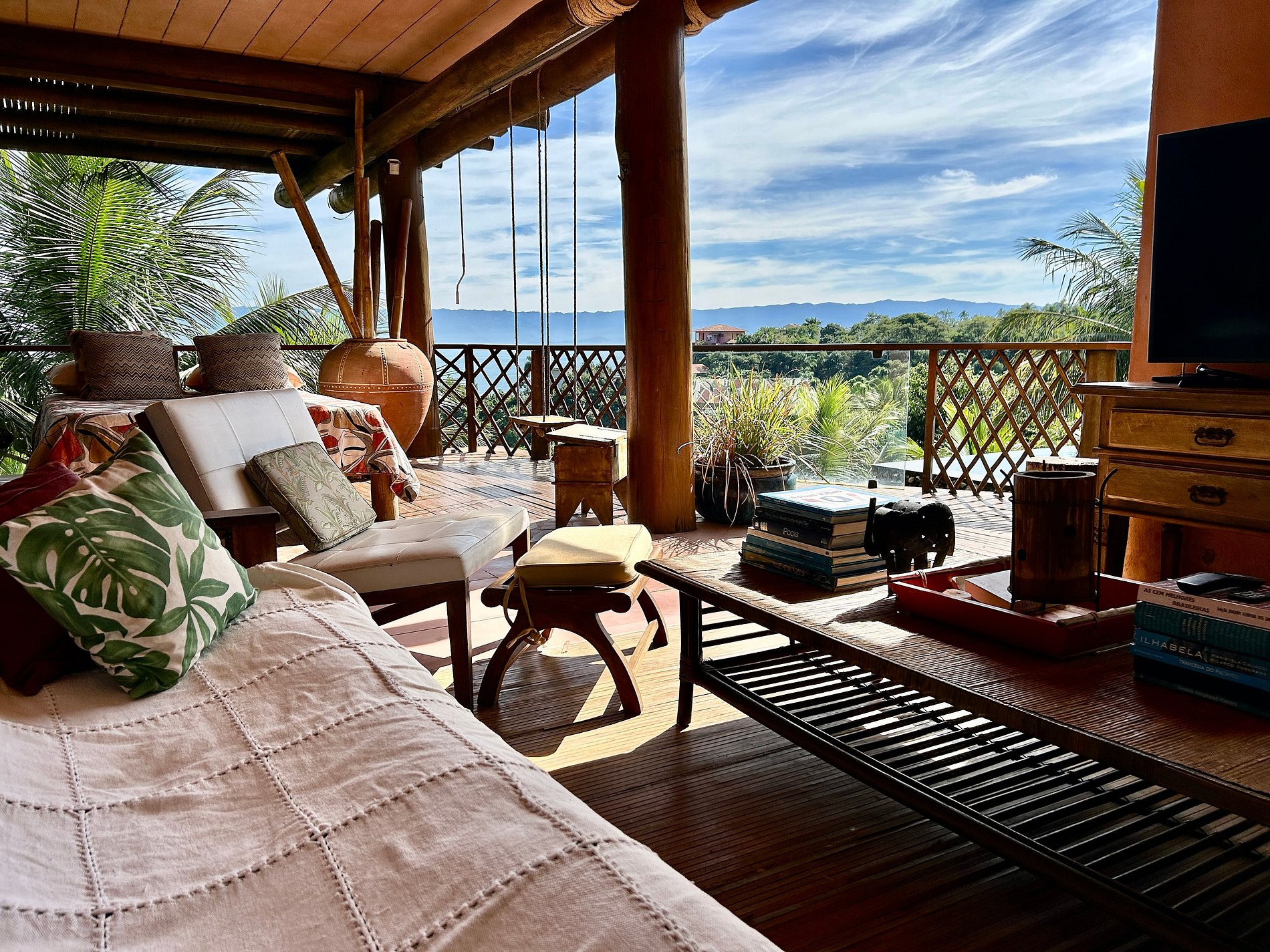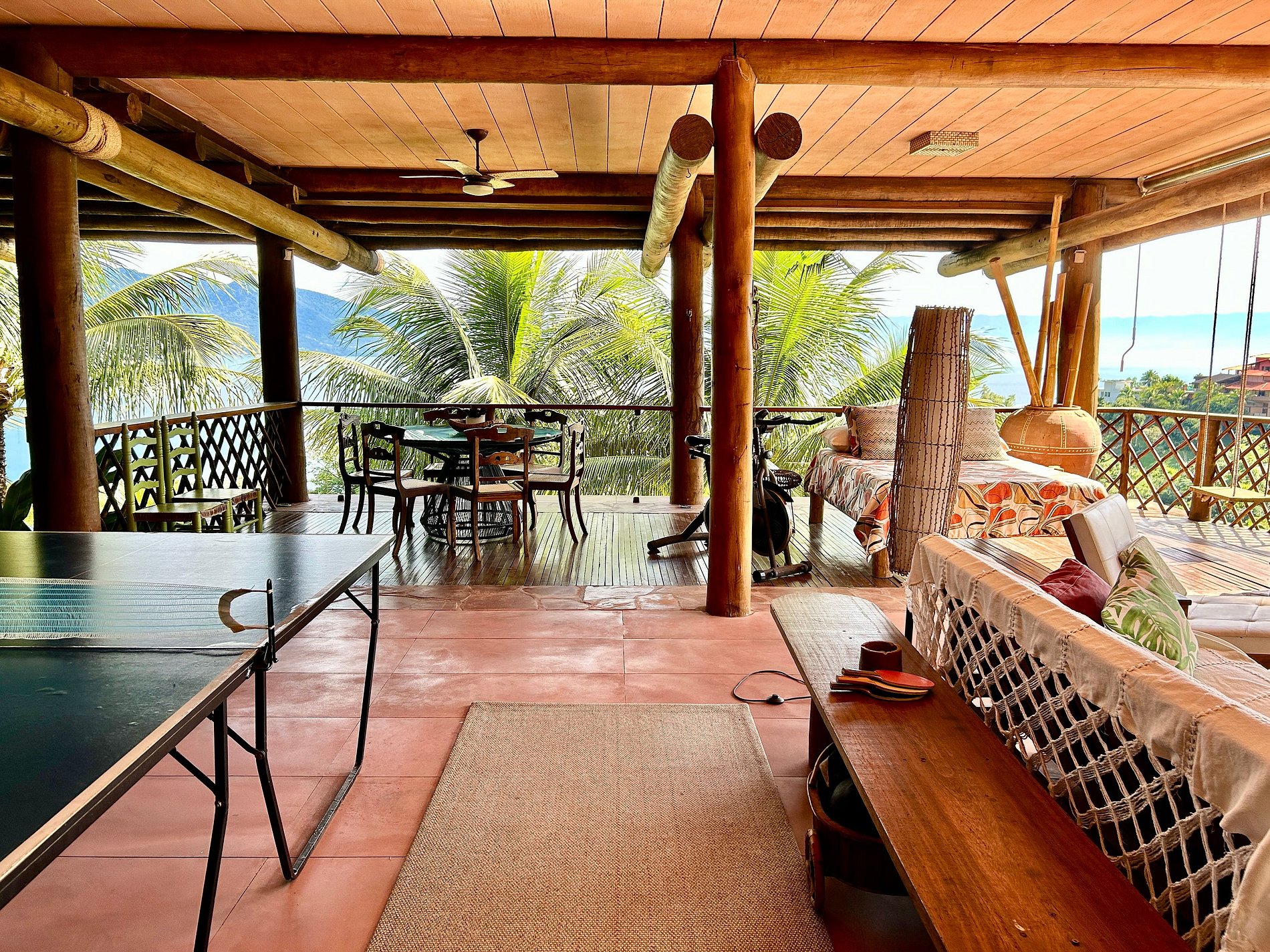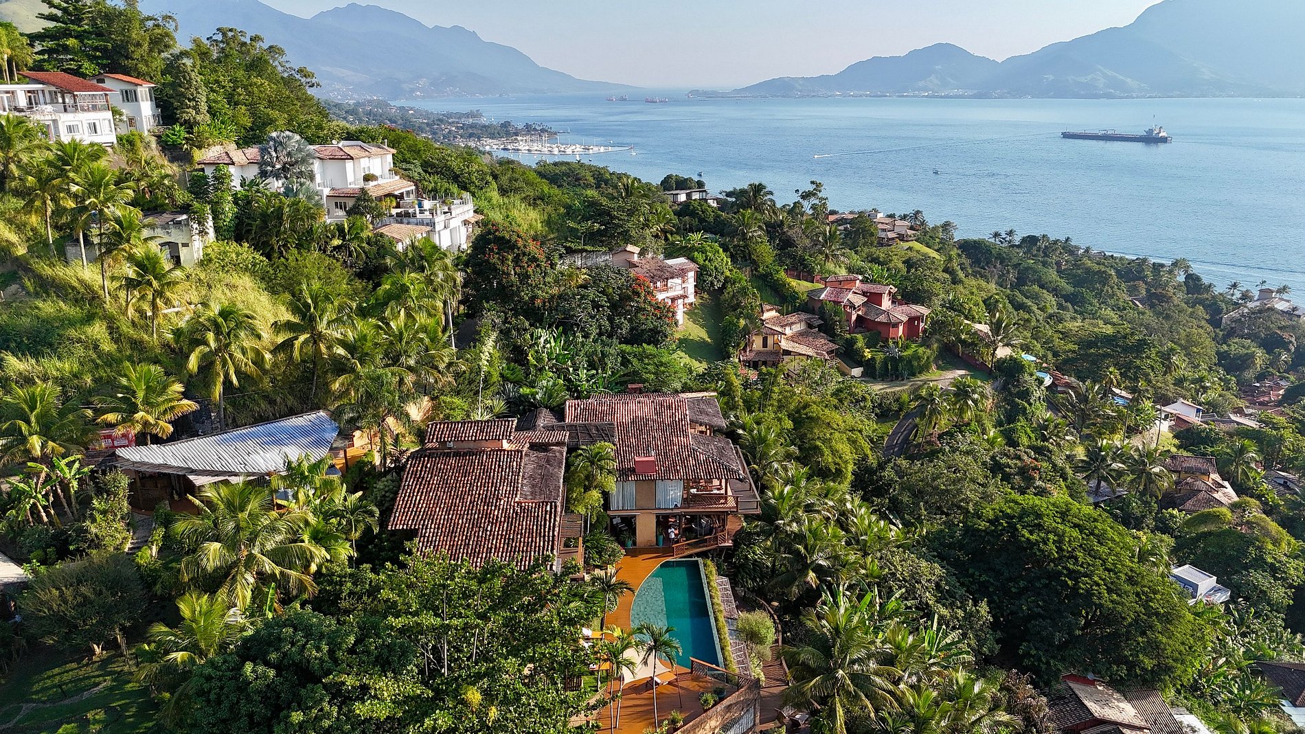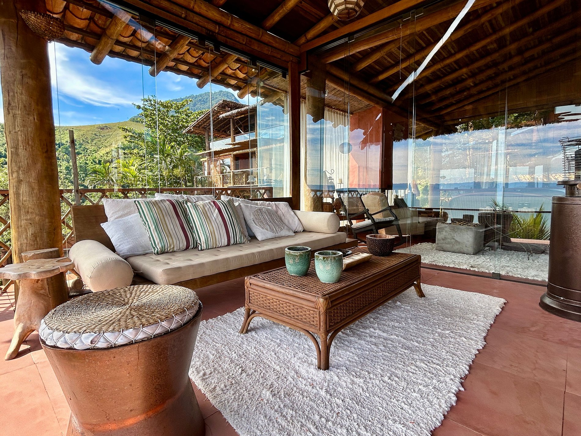 É totalmente voltada para o mar com varandas enormes em madeira e vidros, o que permite uma bela vista do mar e das montanhas.
