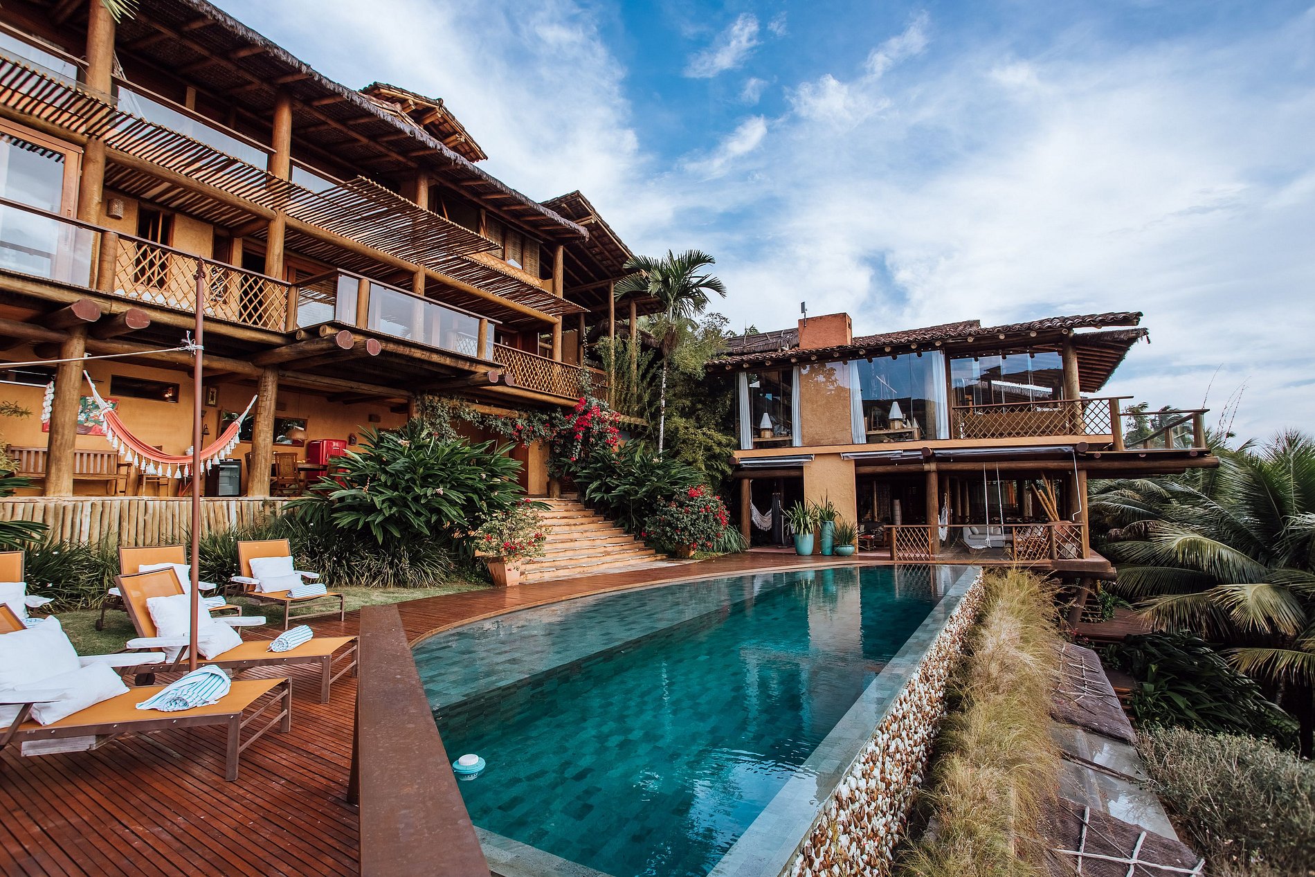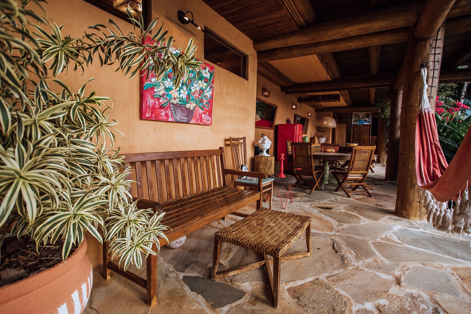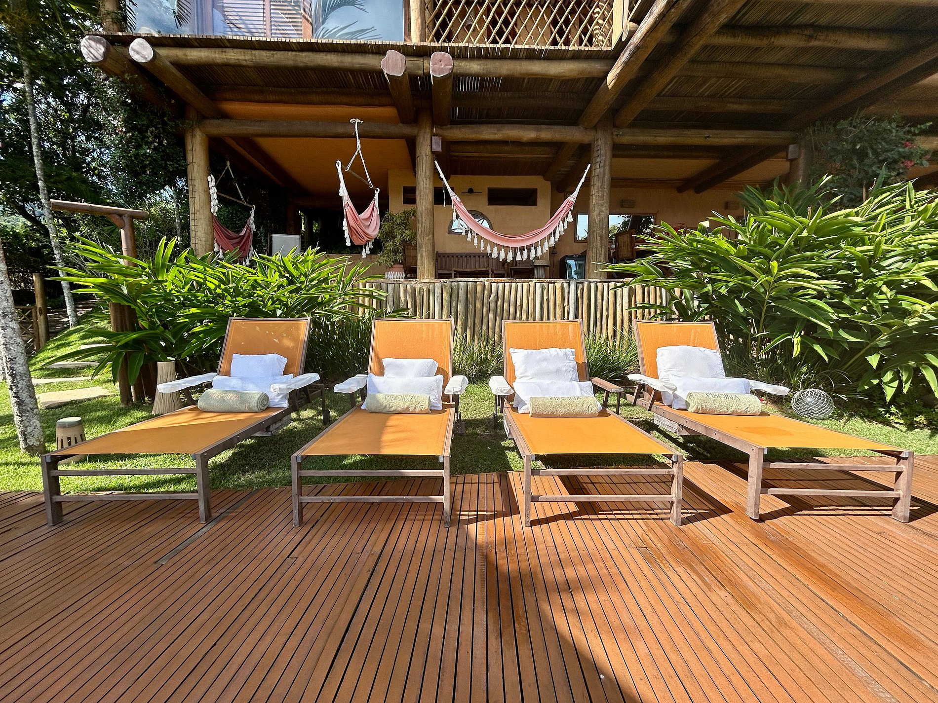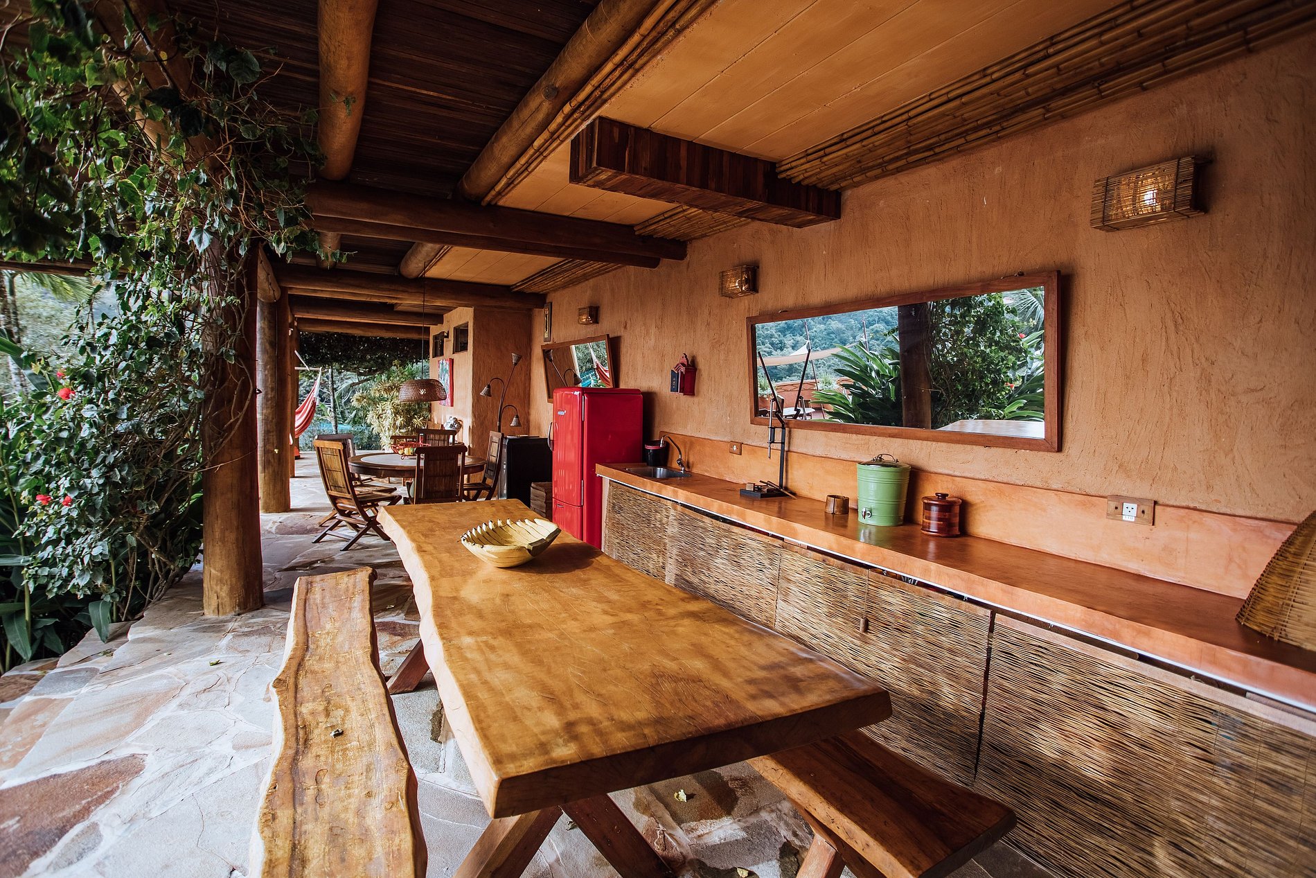 Em uma das varandas da casa, próximo à piscina, há um delicioso espaço com mesas, cadeiras, pia com balcão de apoio, geladeiras e redes, de frente para um lindo jardim.