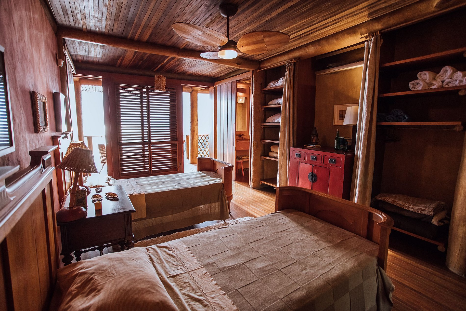 Opção 2) 1 suíte e 2 quartos compartilhando 1 banheiro - 1 suíte com cama de casal; e quartos com 2 camas de solteiro cada; **Todos têm enxoval completo e armários, ar-condicionado e ventilador de teto.