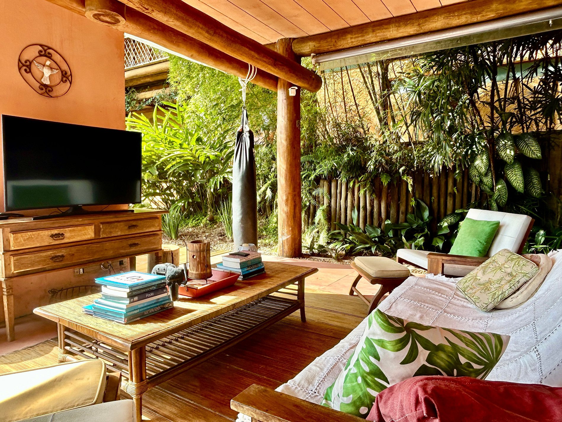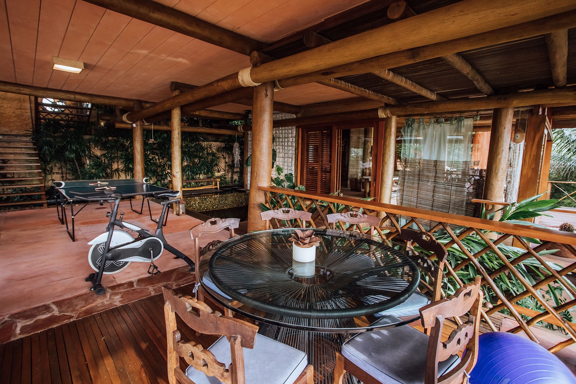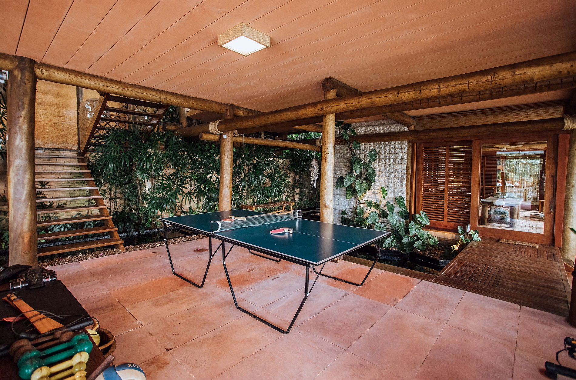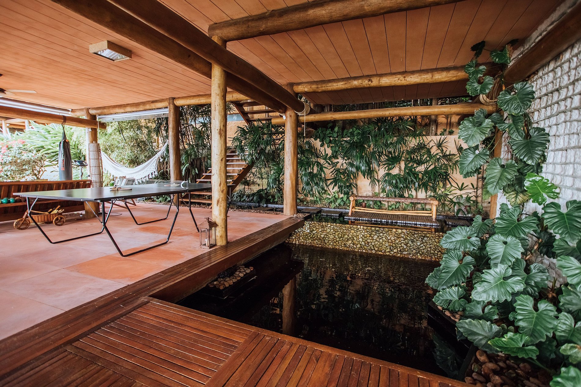 Ao lado da piscina, há outra sala de estar, com TV, sofás, equipamentos de ginástica, mesa de jogos, mesa de ping pong e rede. Uma bela fonte decora o espaço e se pode caminhar sobre suas águas por uma pequena ponte de madeira que dá acesso ao espaço zen da casa.