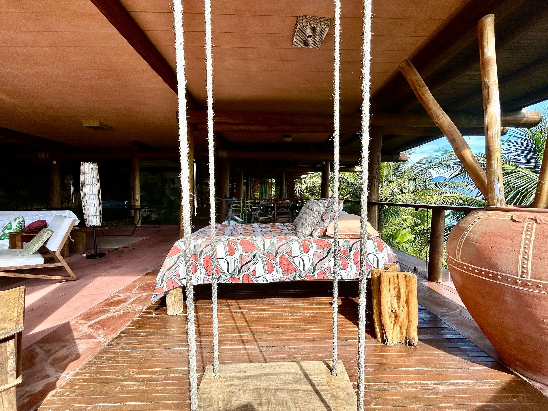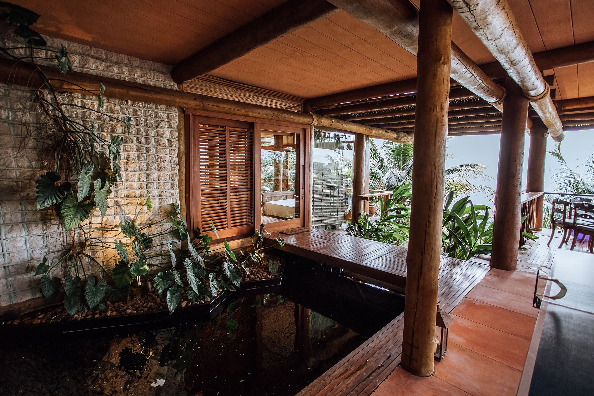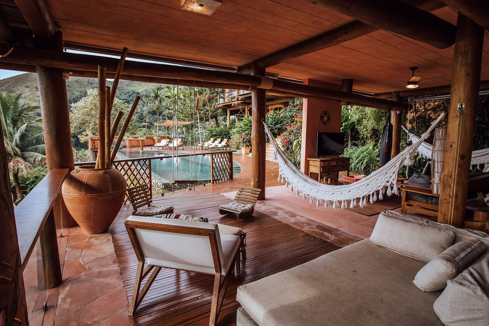 Ao lado da piscina, há outra sala de estar, com TV, sofás, equipamentos de ginástica, mesa de jogos, mesa de ping pong e rede. Uma bela fonte decora o espaço e se pode caminhar sobre suas águas por uma pequena ponte de madeira que dá acesso ao espaço zen da casa.