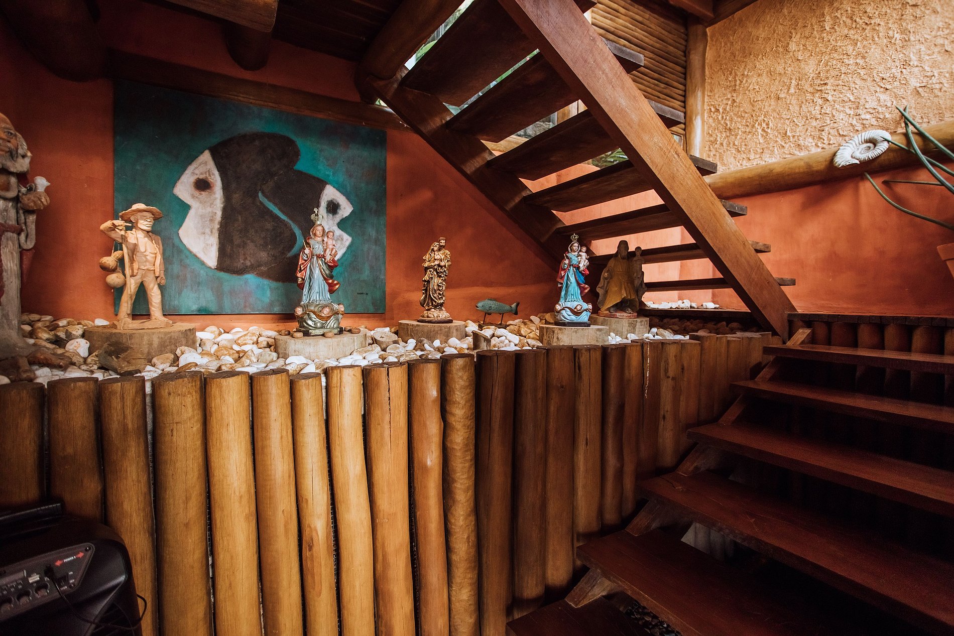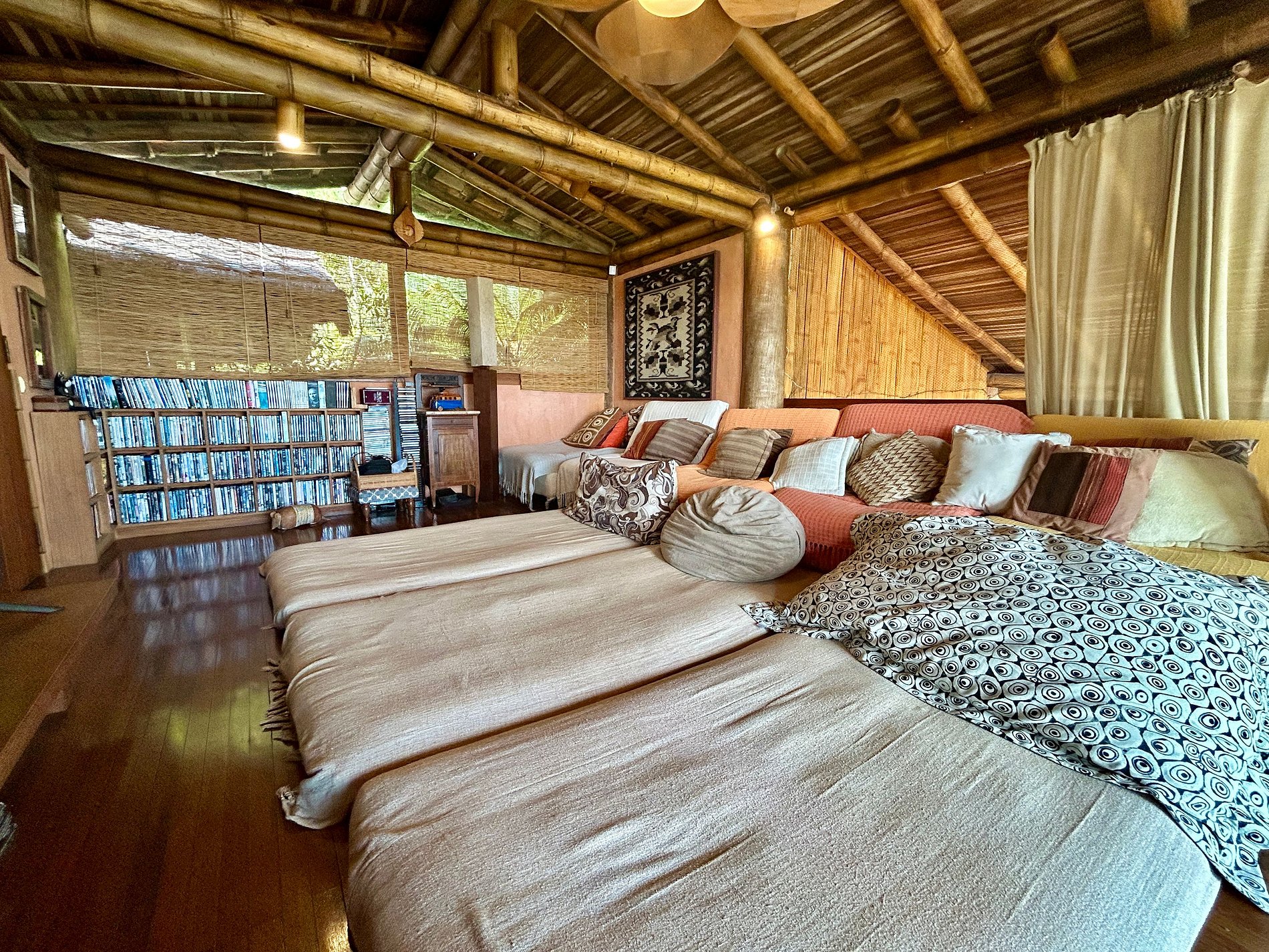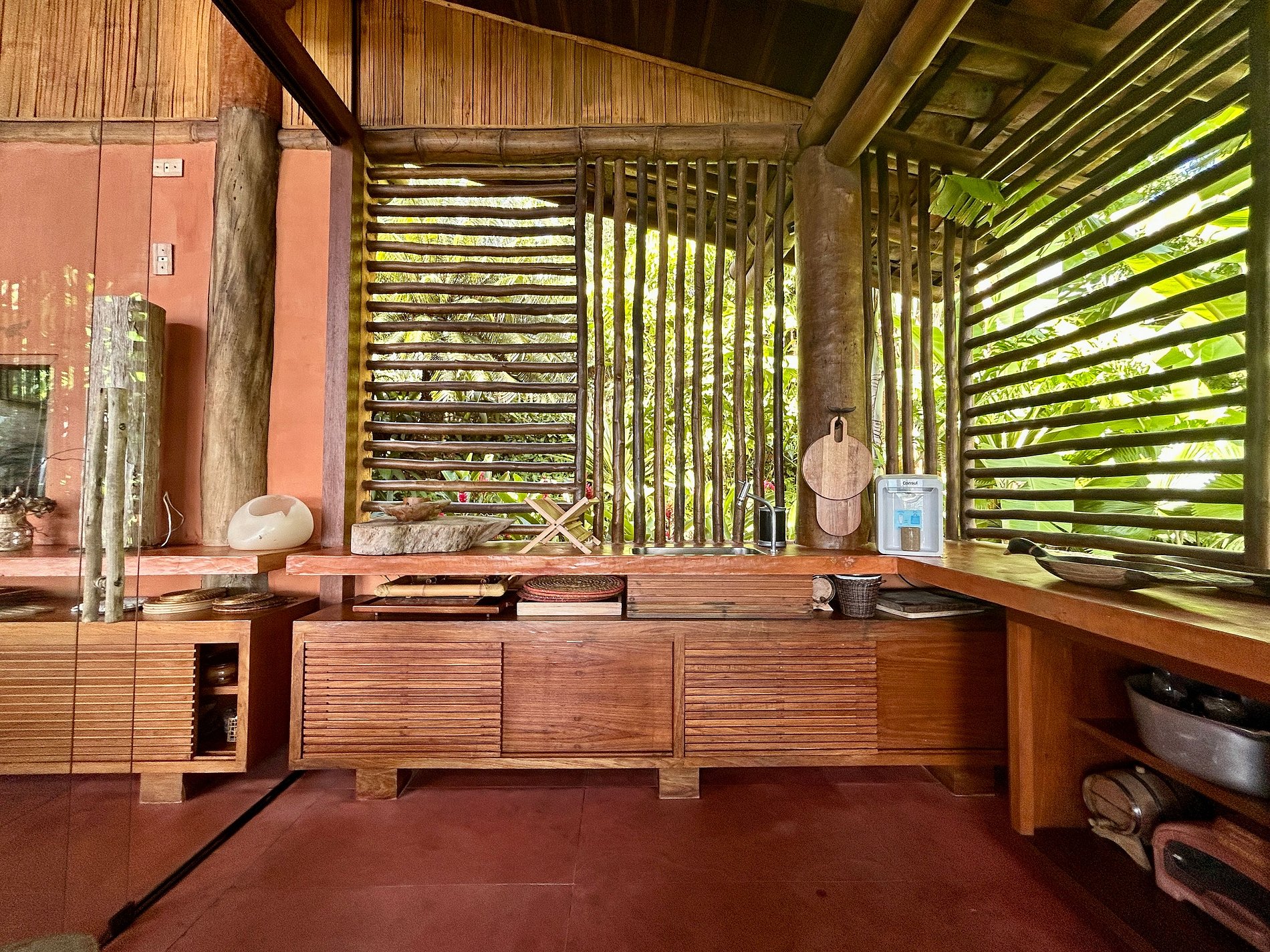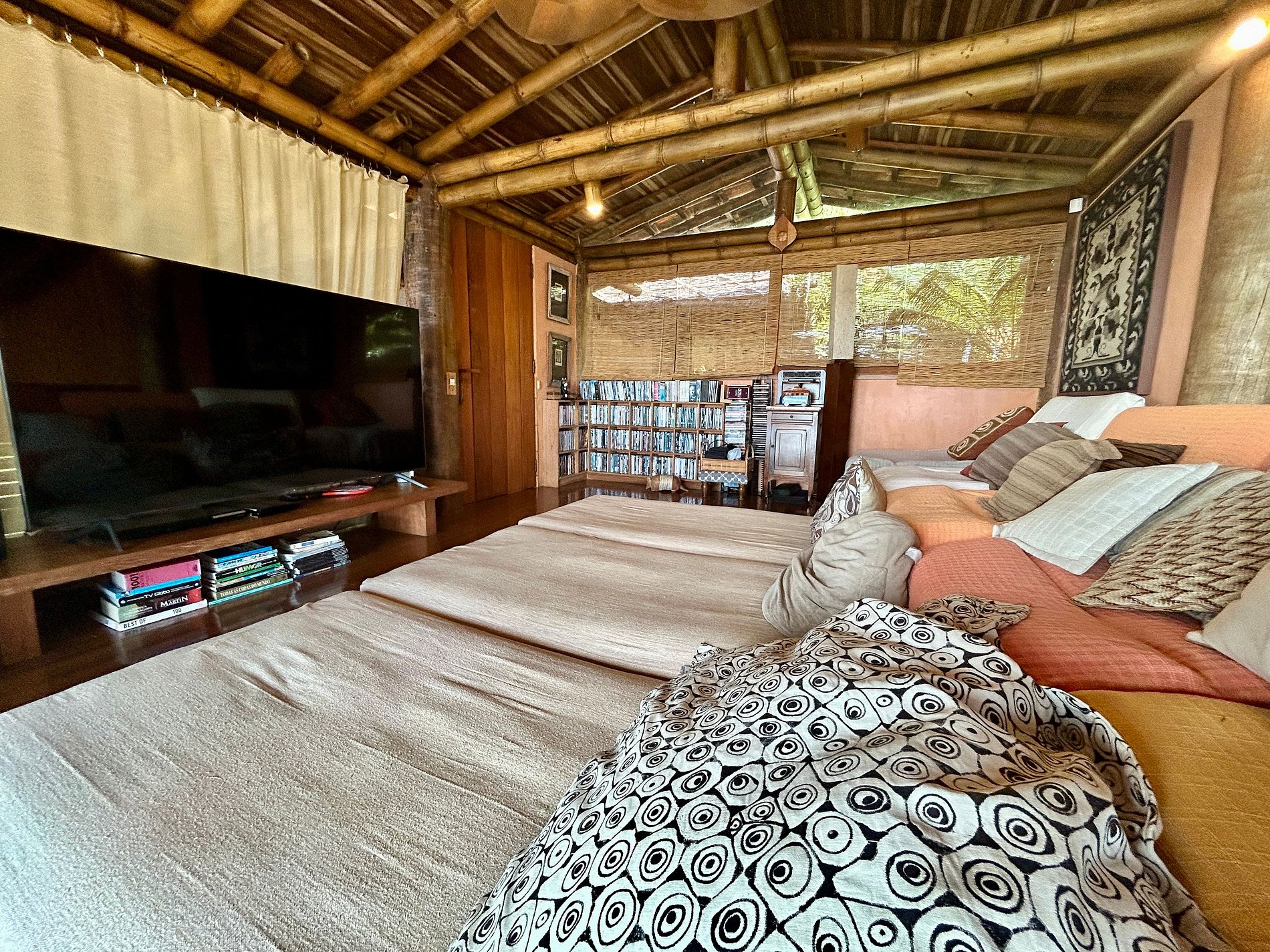 Ao lado da piscina, há outra sala de estar, com TV, sofás, equipamentos de ginástica, mesa de jogos, mesa de ping pong e rede. Uma bela fonte decora o espaço e se pode caminhar sobre suas águas por uma pequena ponte de madeira que dá acesso ao espaço zen da casa.