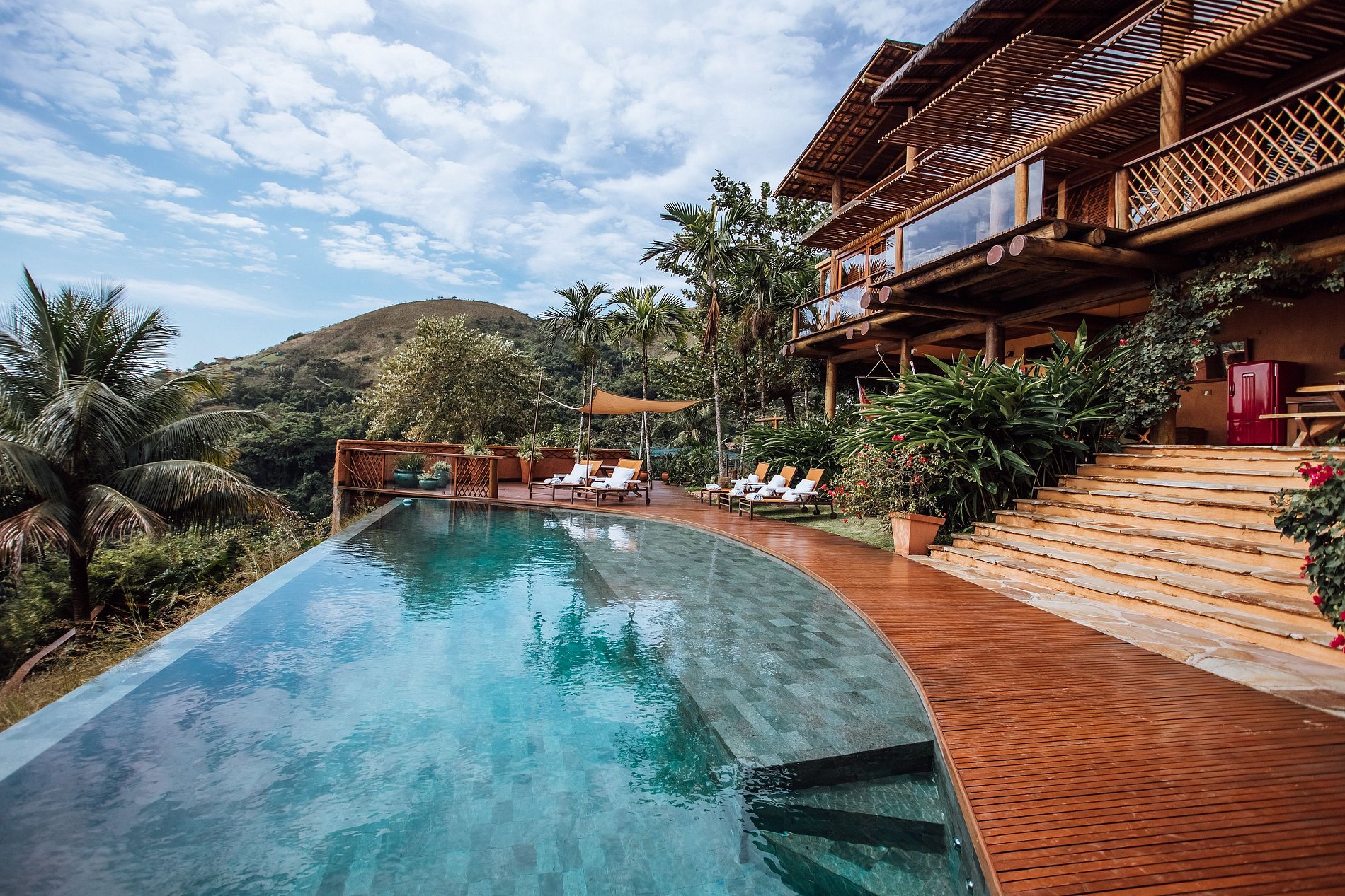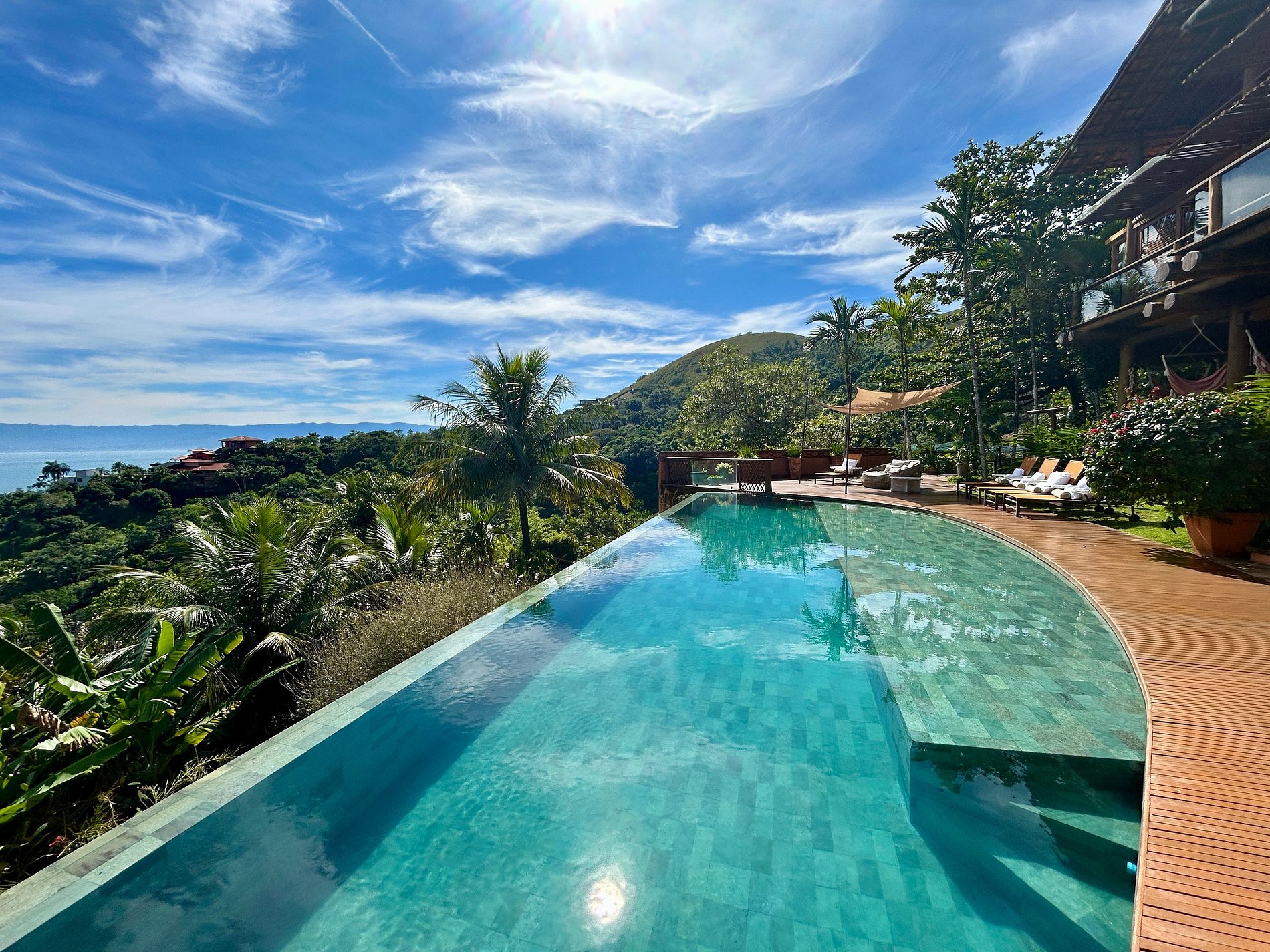 Imensa piscina em pedra hijau de borda infinita e prainha, rodeada por deck, em espaço muito confortável, com espreguiçadeiras mesa, cadeiras e guarda-sol.