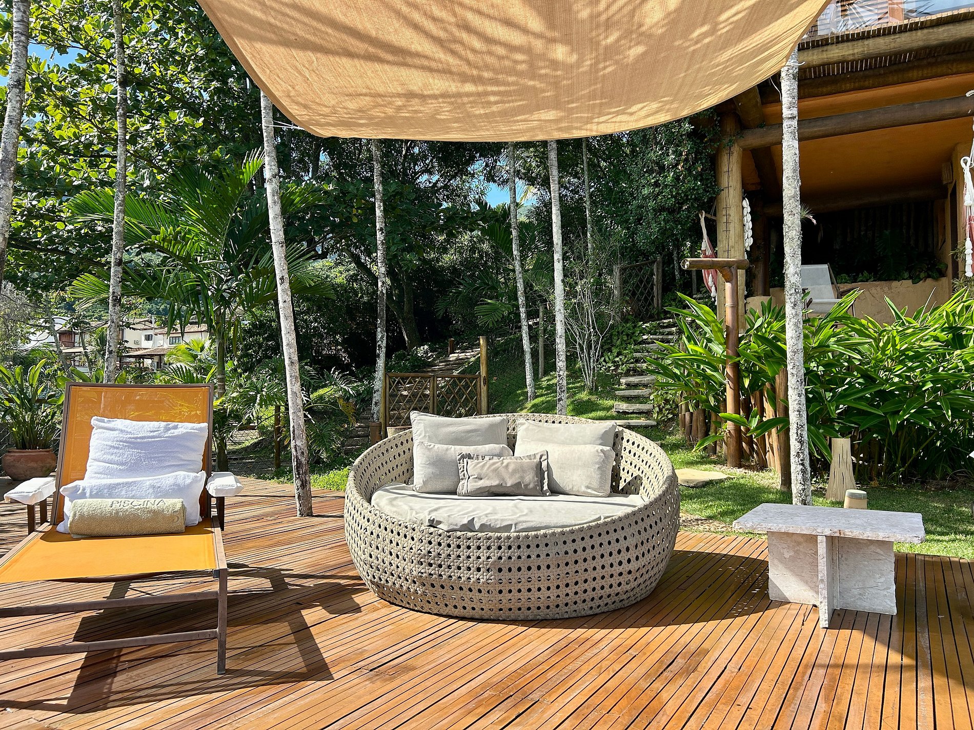 Este espaço incrível, conta com sauna seca, maca para massagem, espaço de relaxamento em meio ao jardim e área para fogueira.