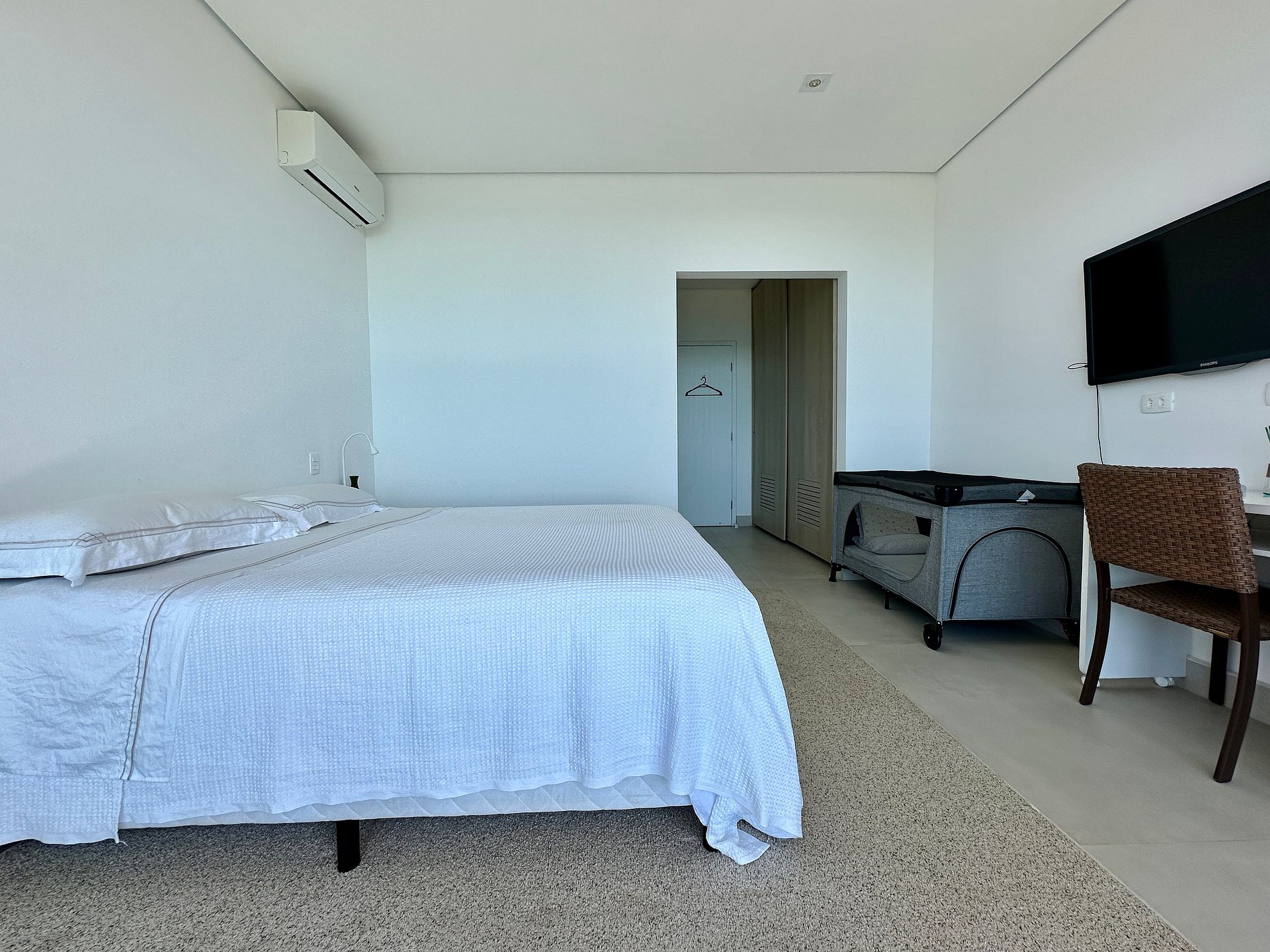Suíte 1 - 1 cama de casal queen e berço portátil, com acesso à varanda;