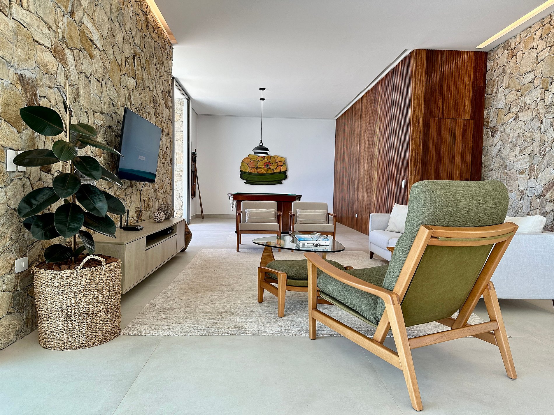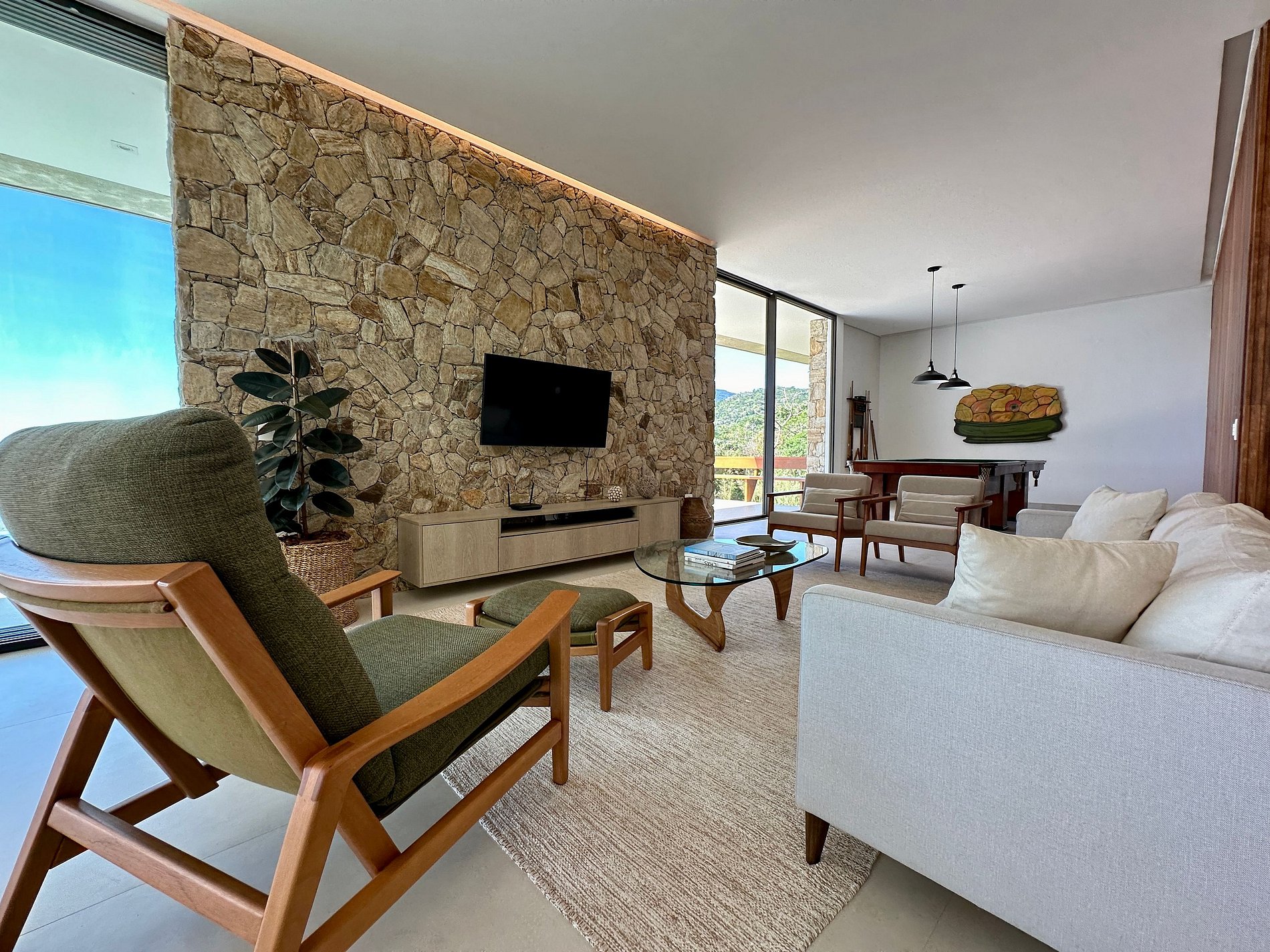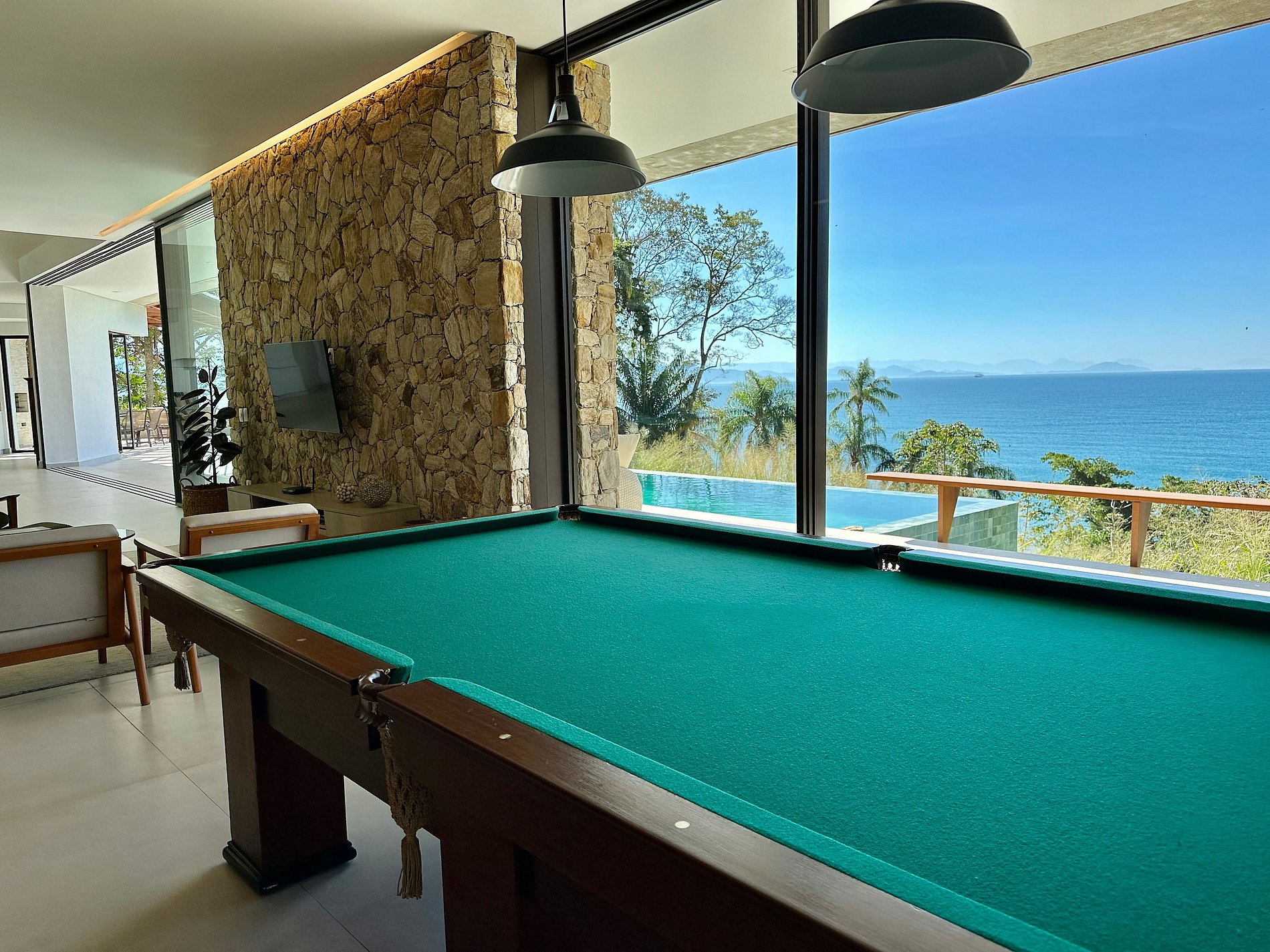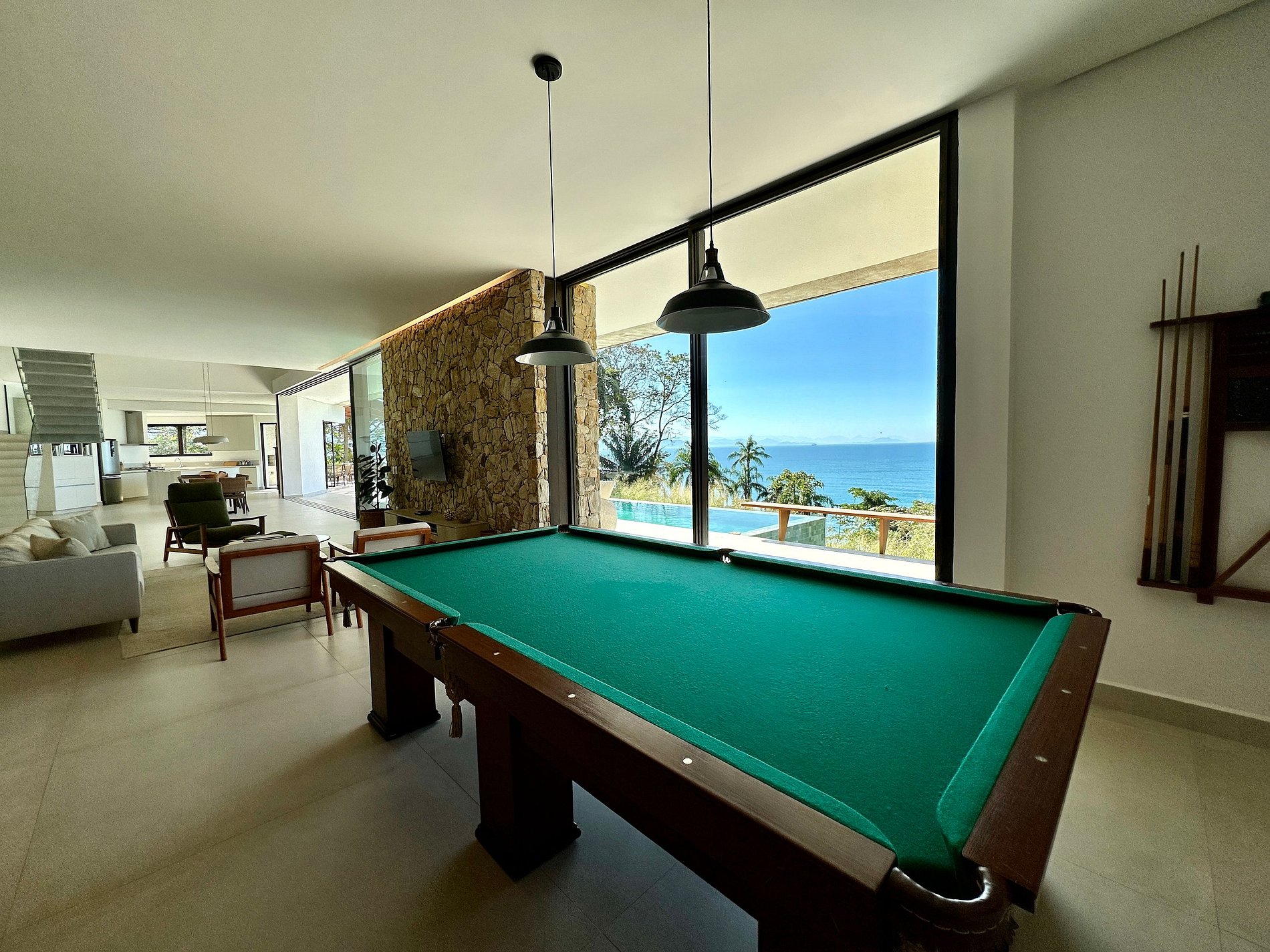 - A parte interna com decoração de muito bom gosto, com salas de estar, jantar, TV, mesa de sinuca e cozinha completa, em ambiente integrado, iluminado e muito arejado. Conta com um lavabo de apoio;