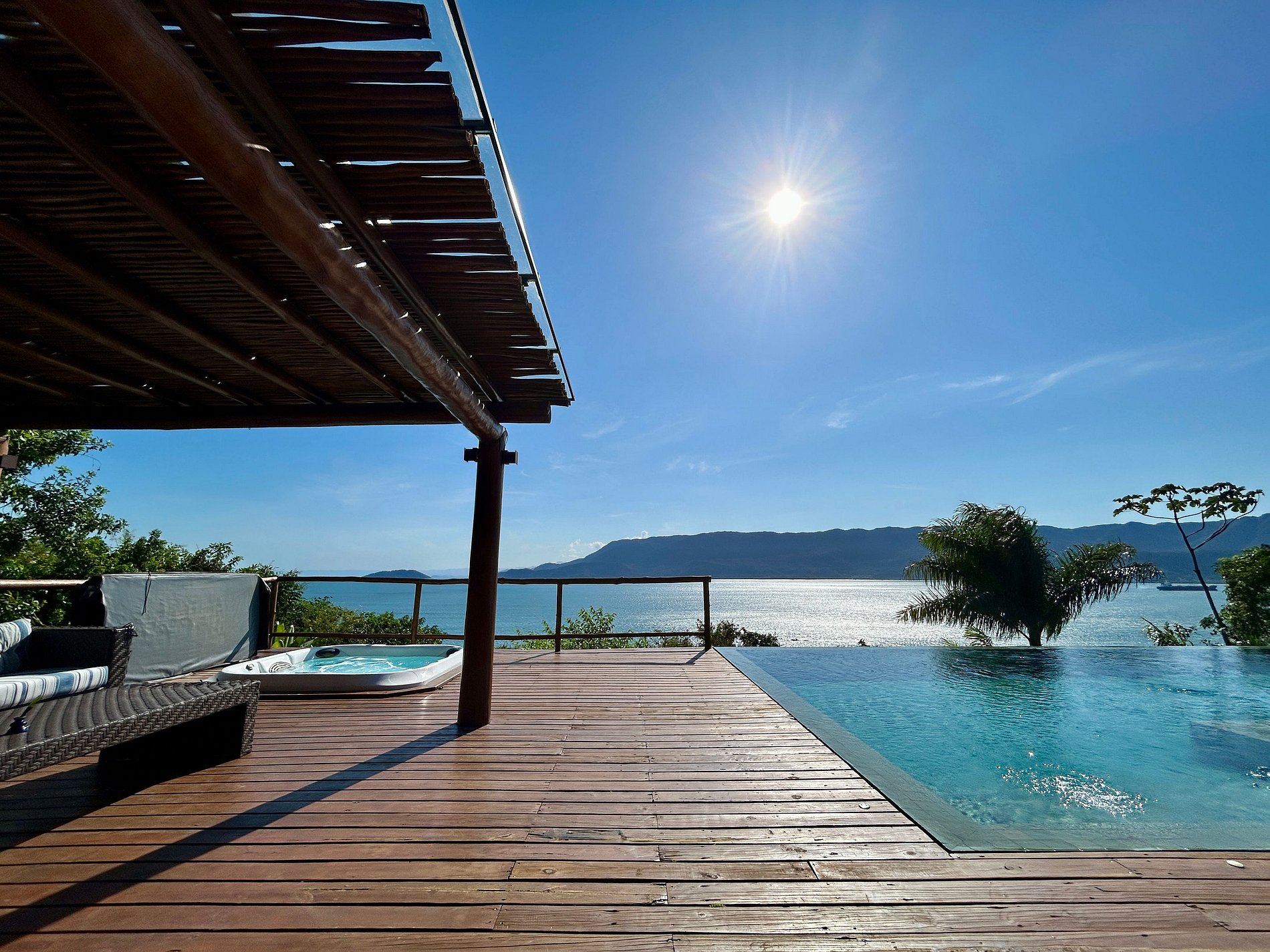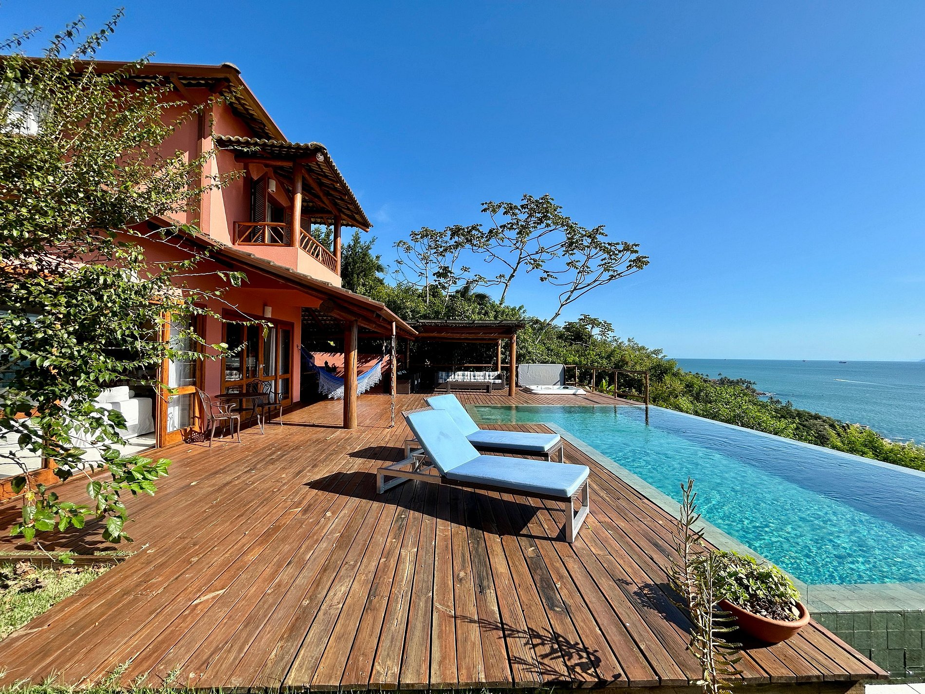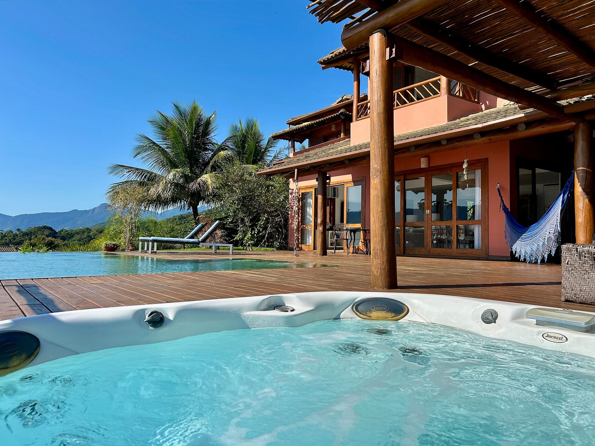 - Área externa sensacional, amplo deck com jacuzzi (sem aquecimento) piscina de borda infinita, lounge confortável, churrasqueira e mesa para refeições ao ar livre;