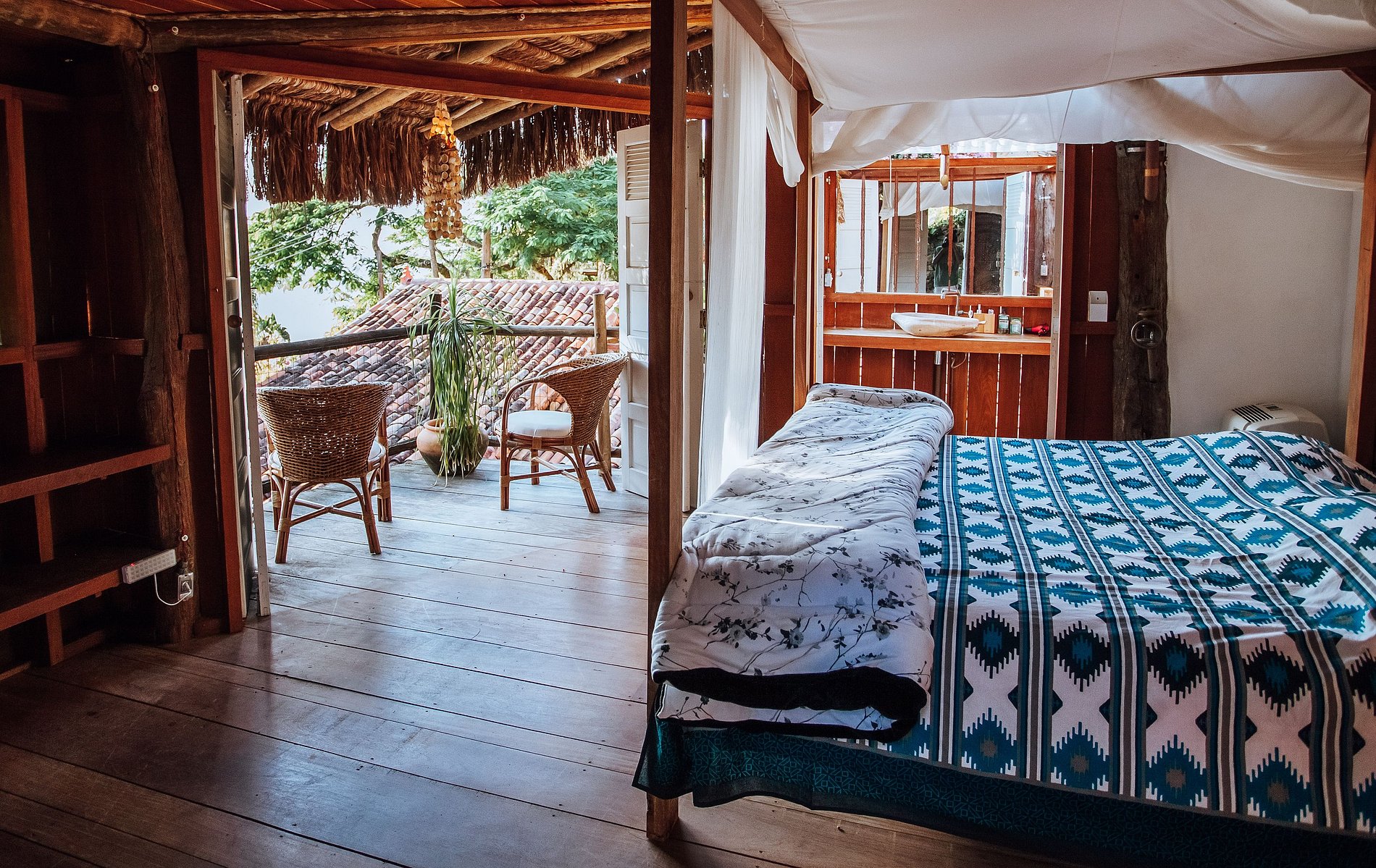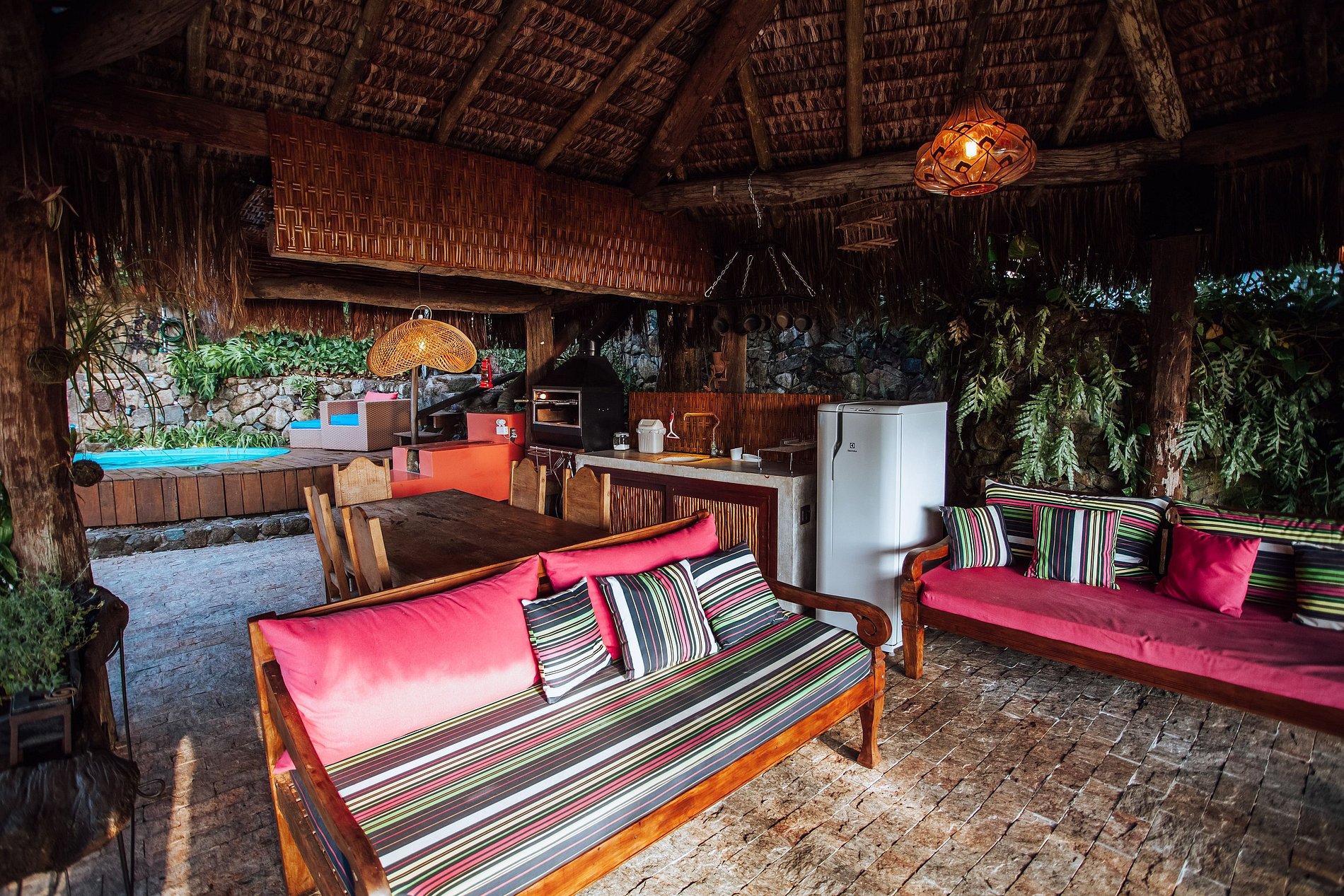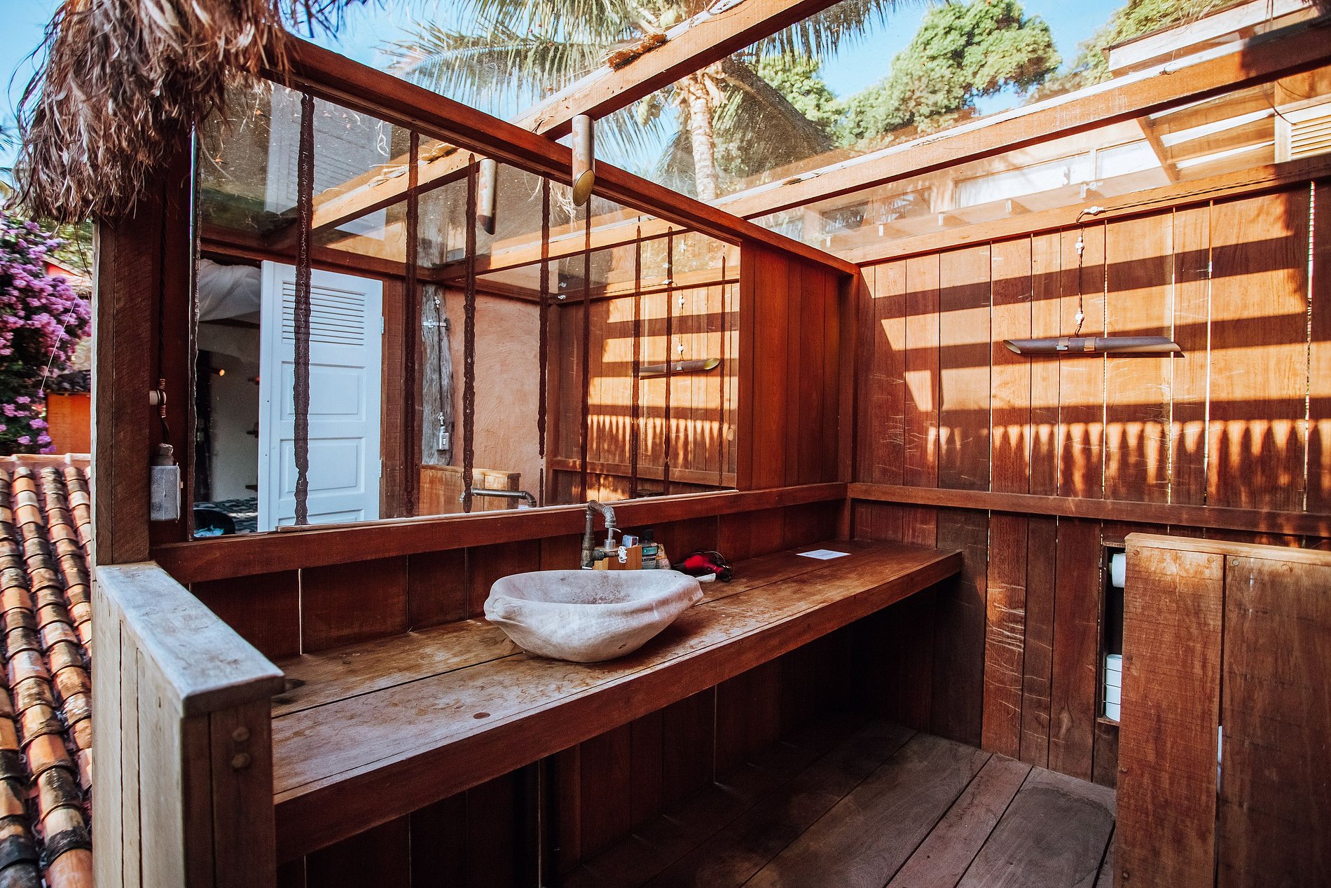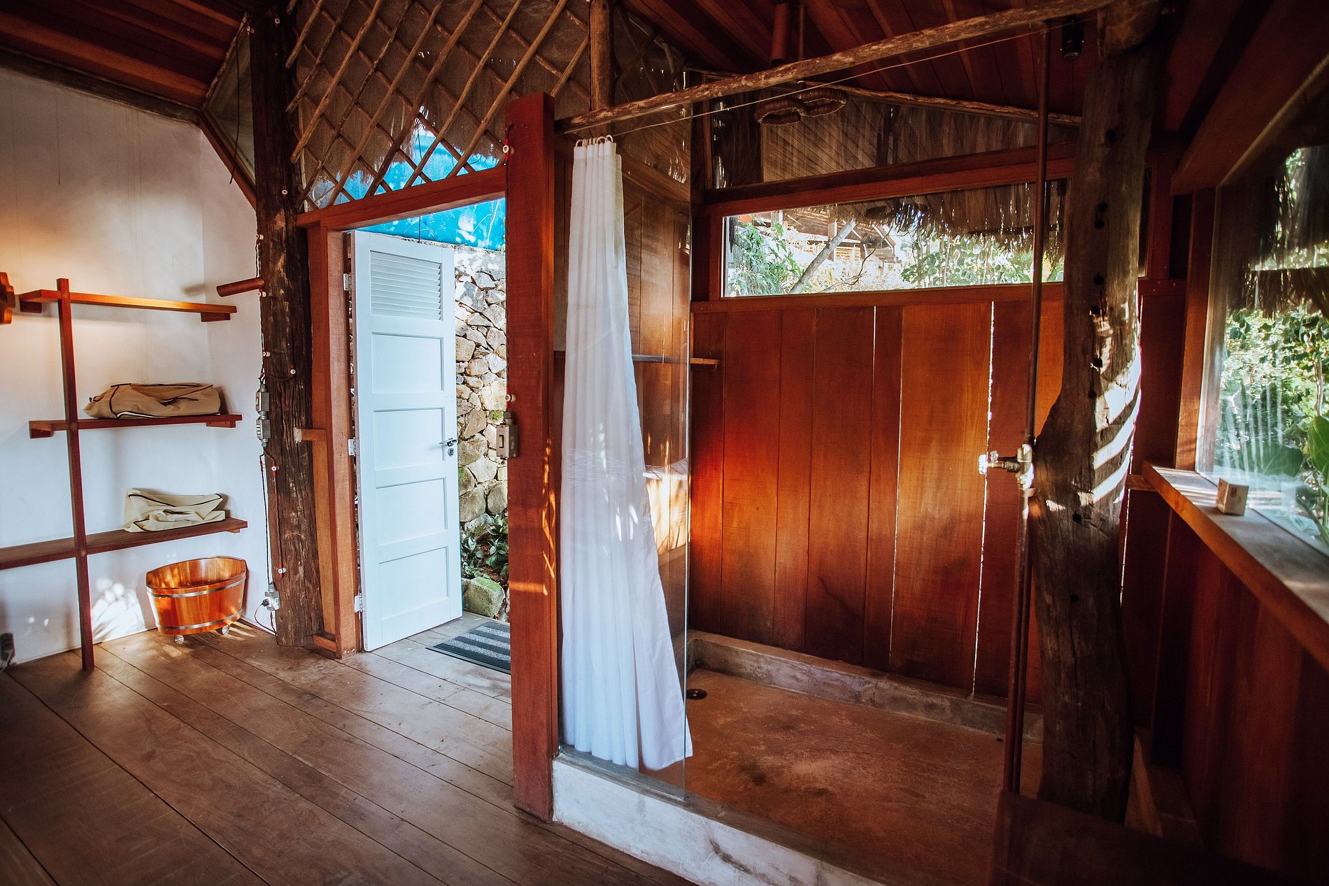 - Ainda na área externa, uma suíte na árvore proporciona uma experiência mais rústica e de integração à natureza, com banheiro com teto de policarbonato e quarto coberto de sapé;