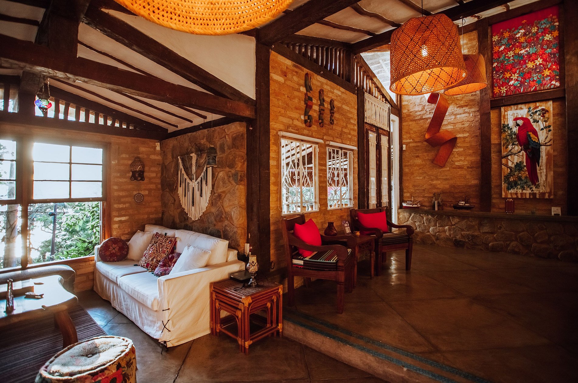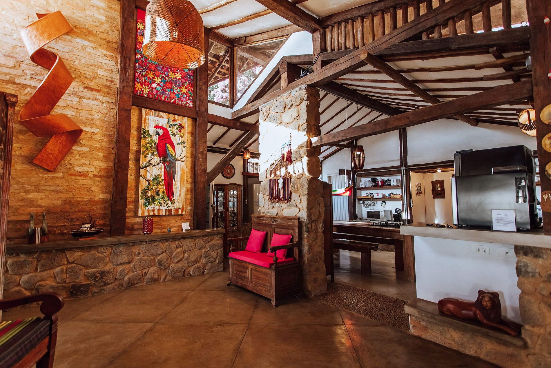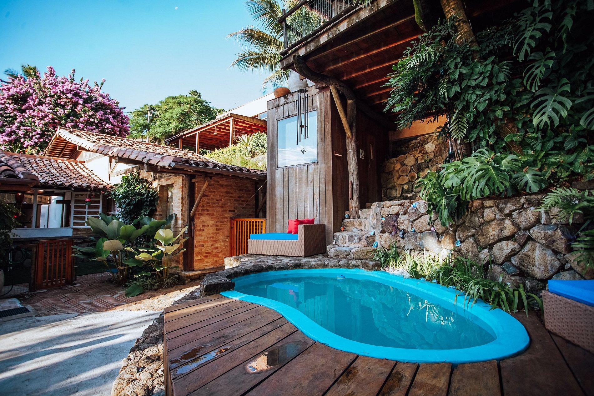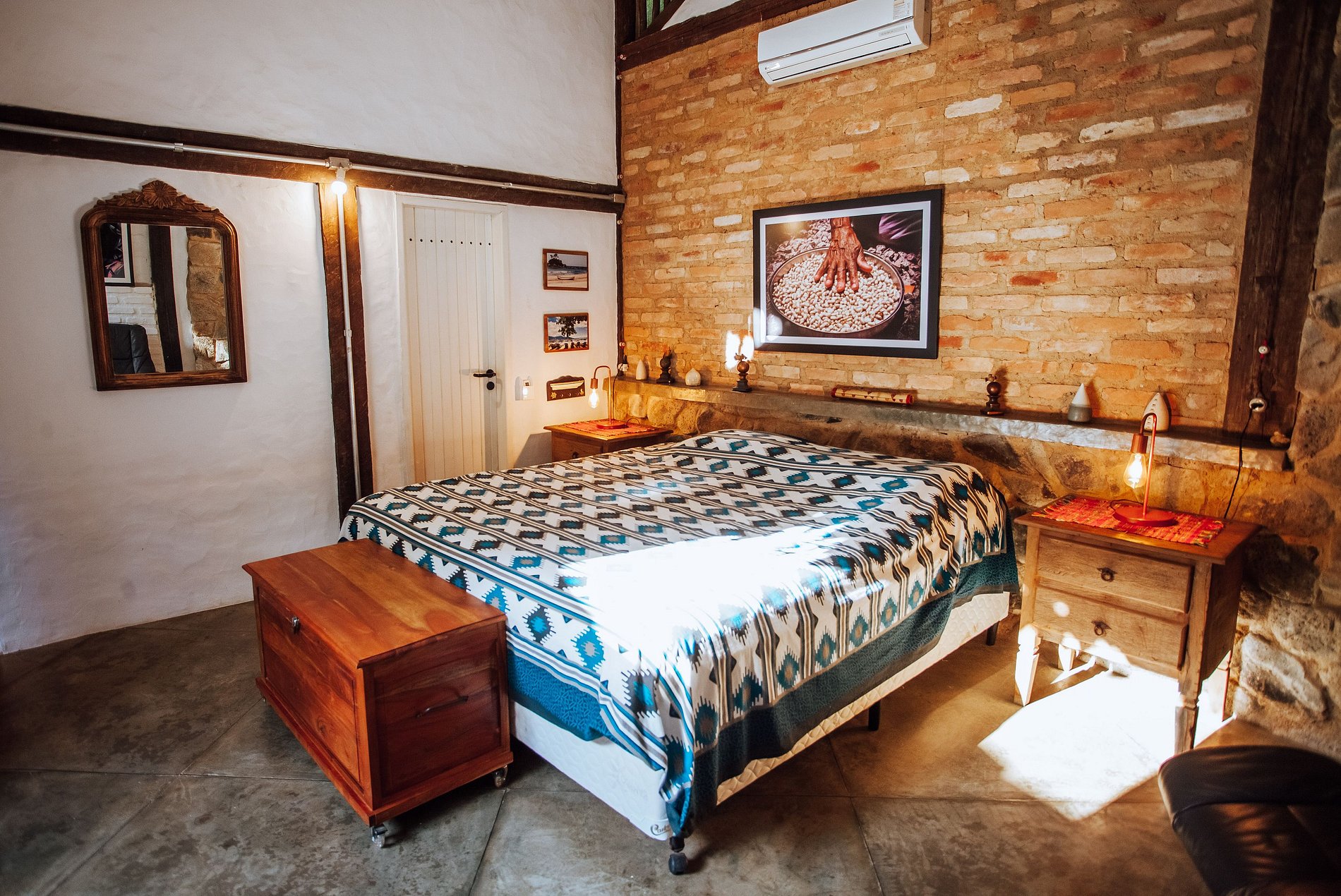 - Ainda na área externa, uma suíte na árvore proporciona uma experiência mais rústica e de integração à natureza, com banheiro com teto de policarbonato e quarto coberto de sapé;