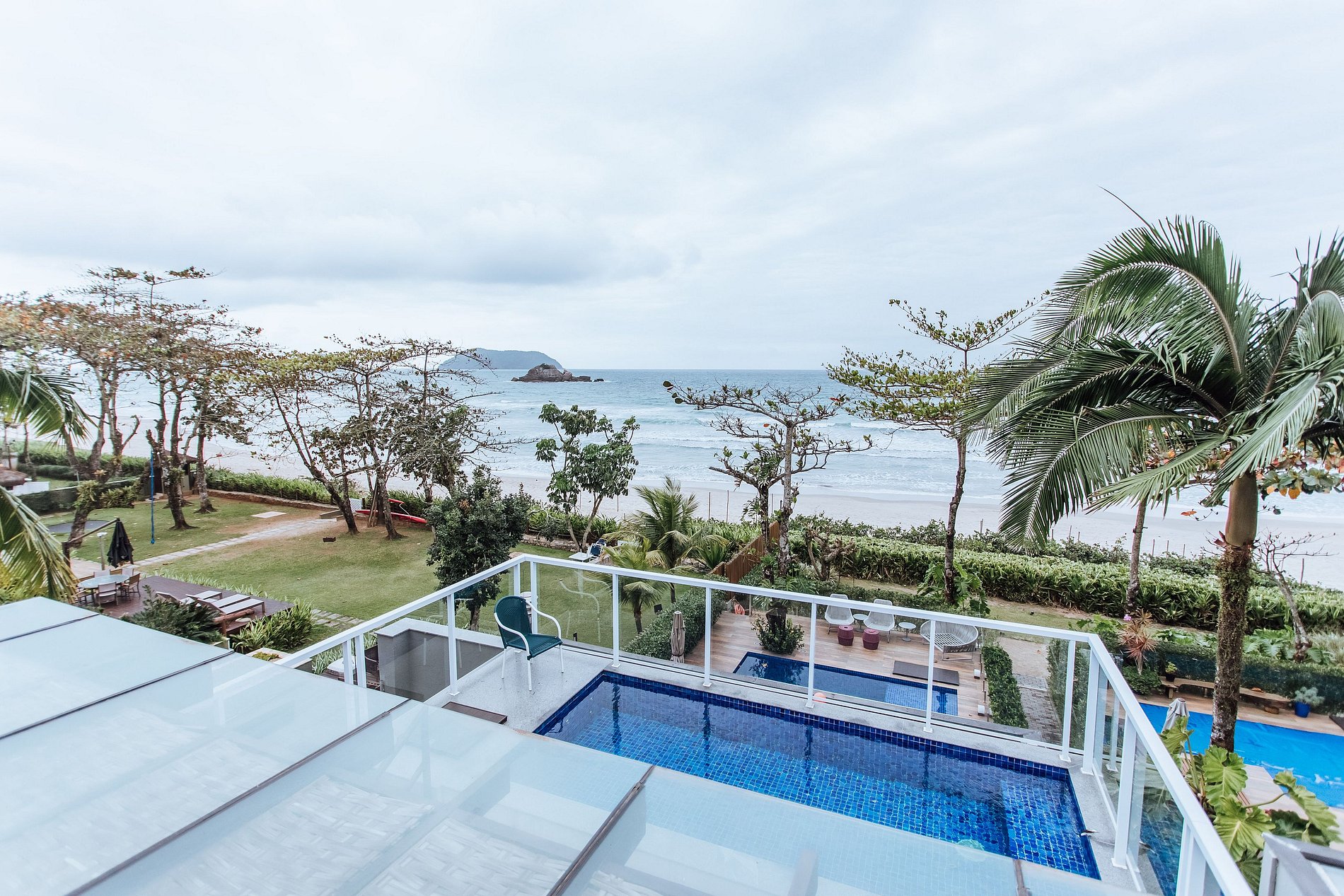 - varanda com mesa, cadeiras e uma vista sensacional da praia de Juquehy;