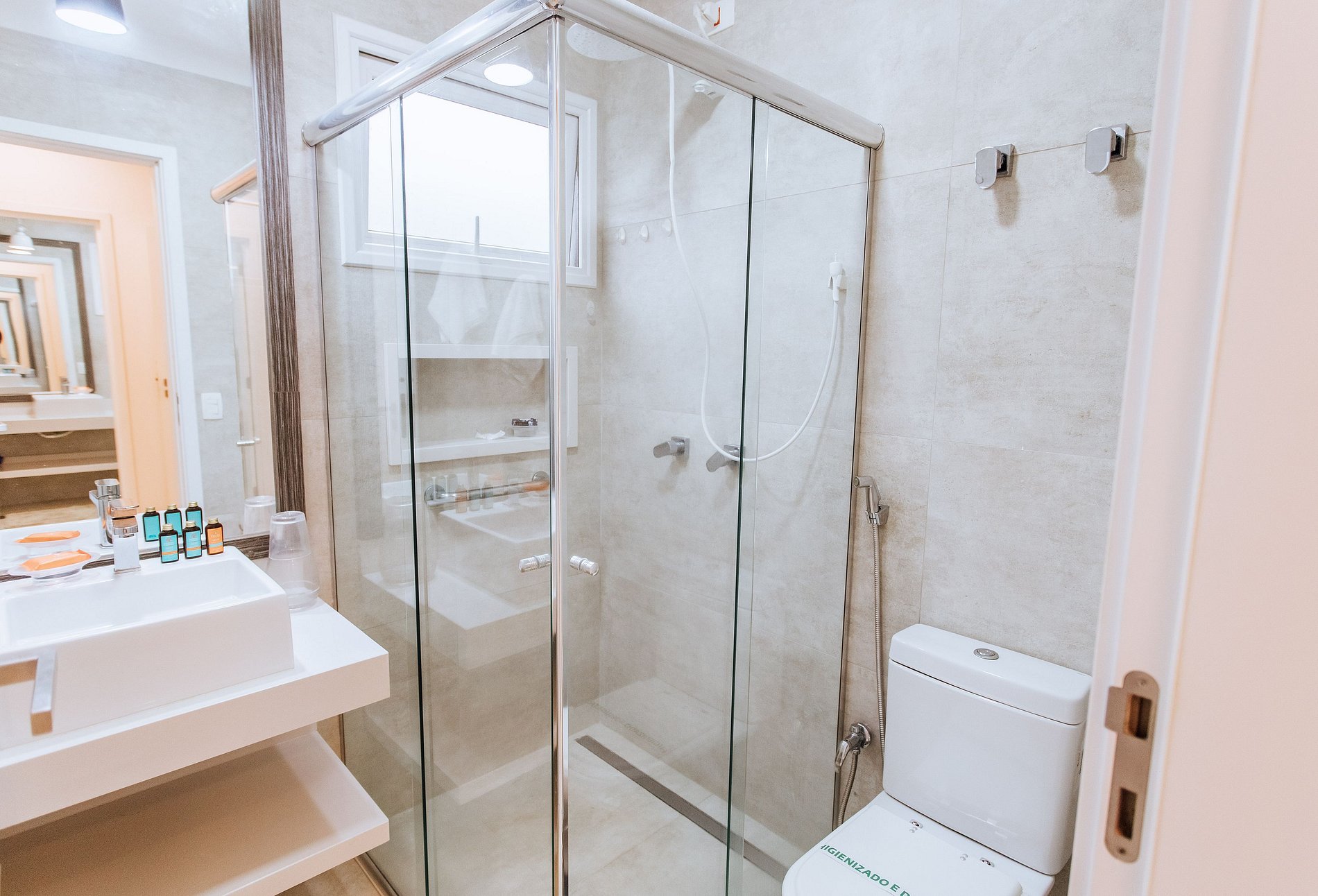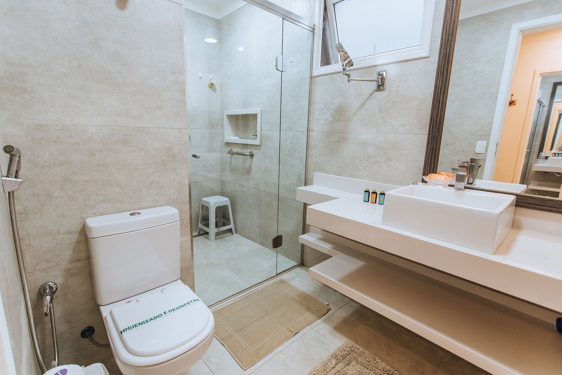 - suíte 1 - master, com 1 cama de casal, armário, sofá, enxoval completo, 2 banheiros e ar-condicionado;
