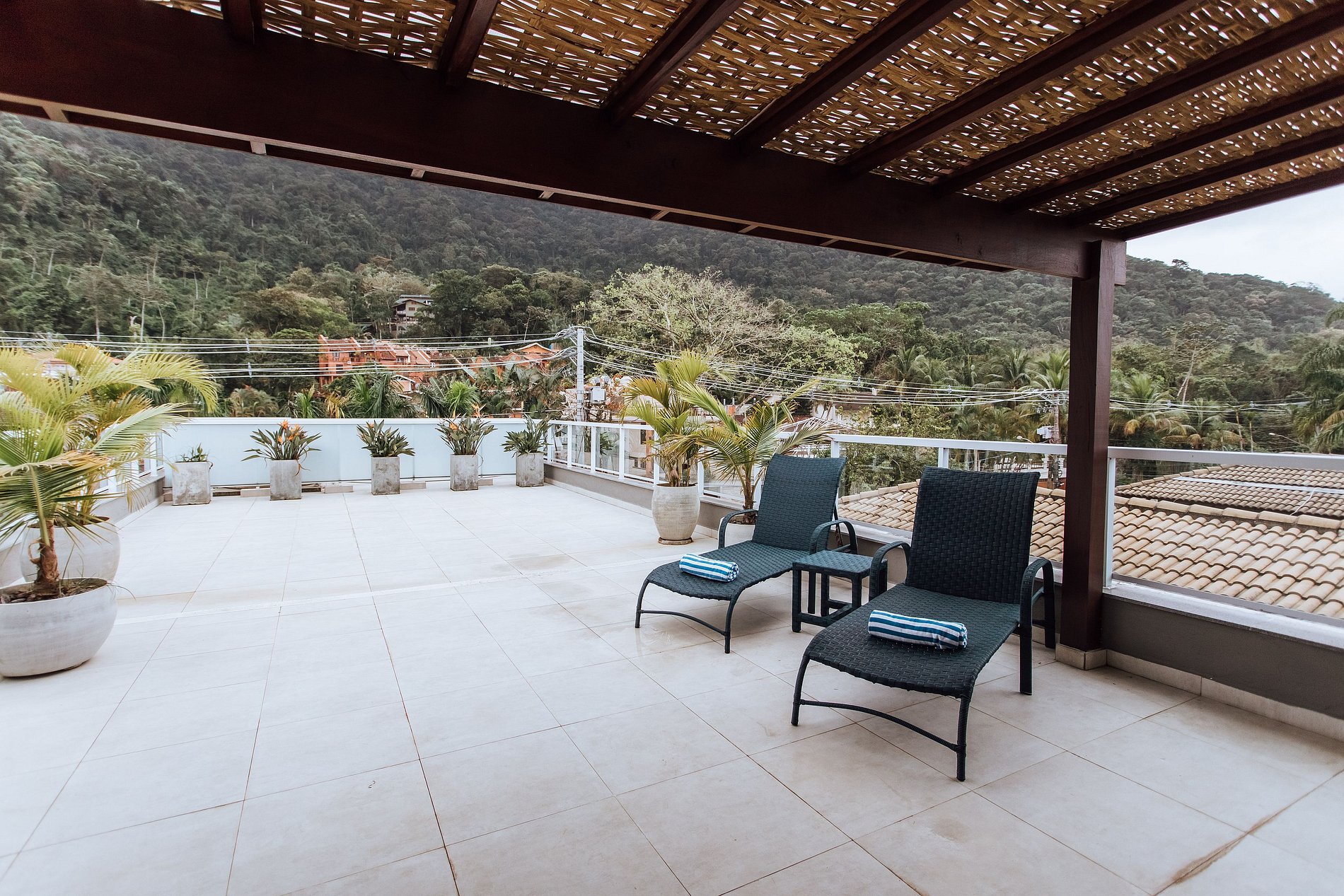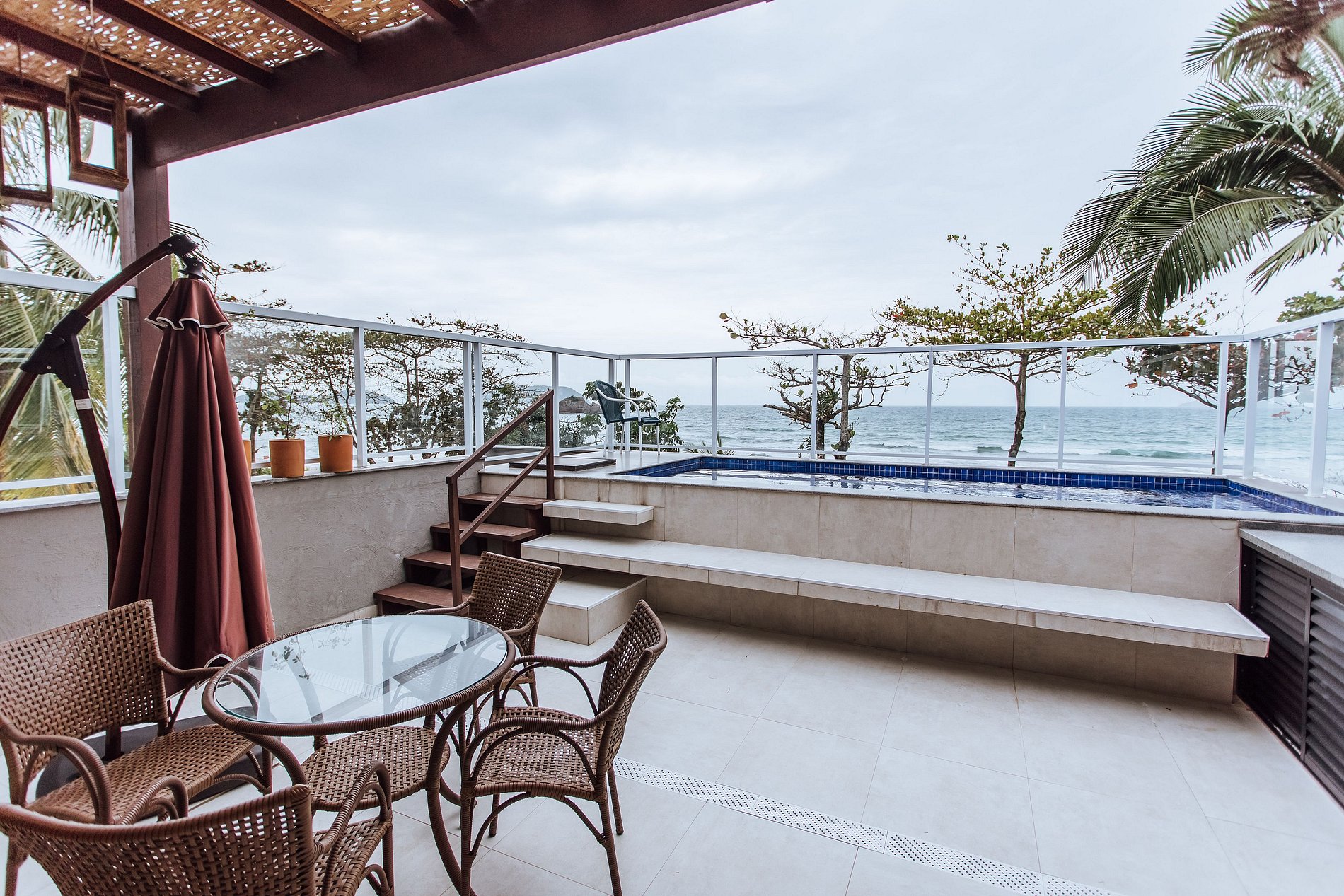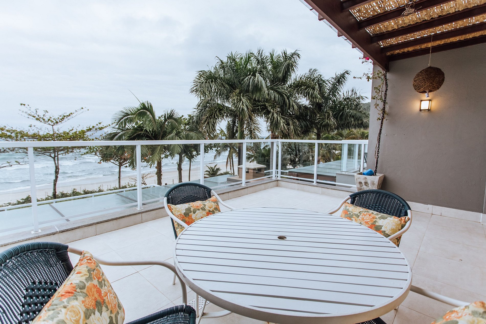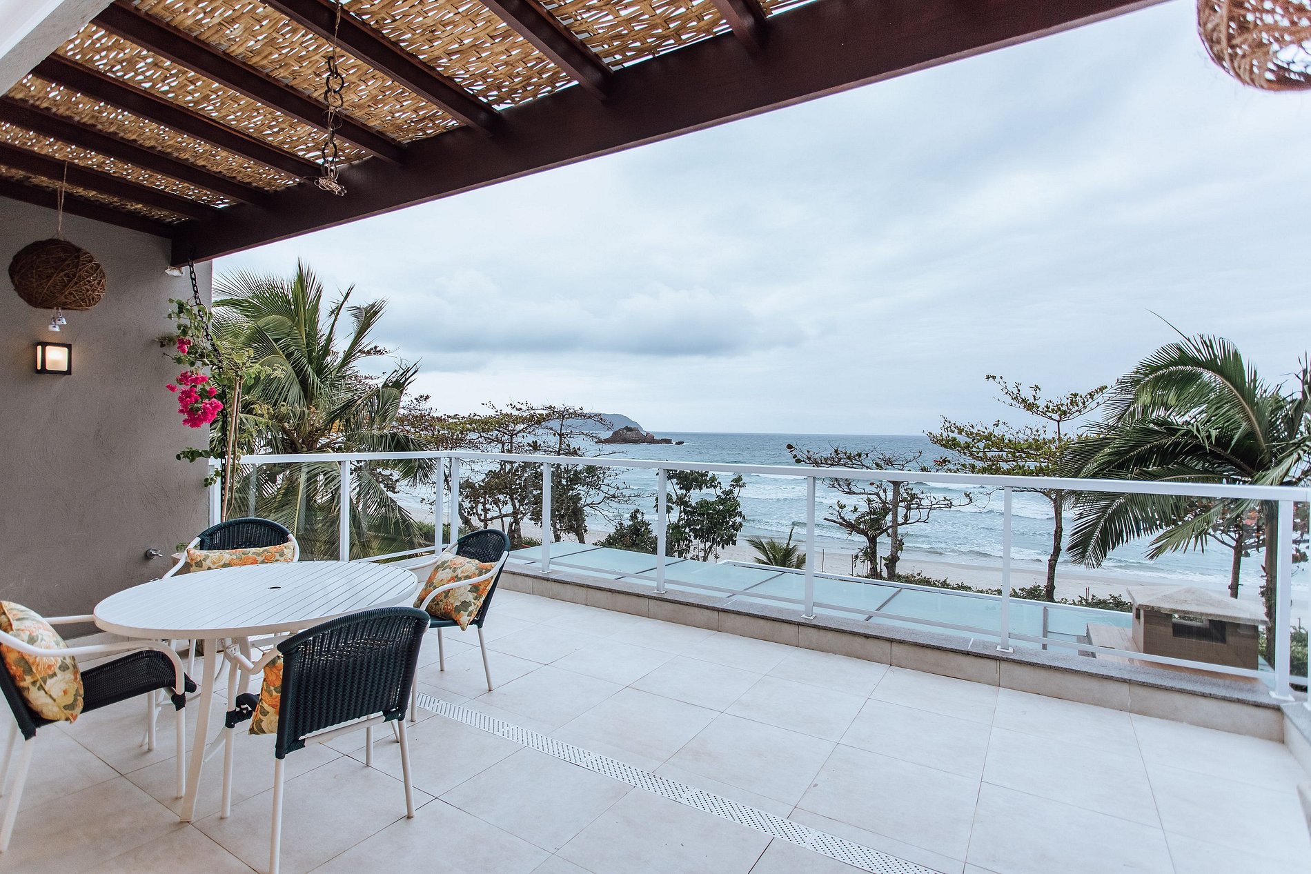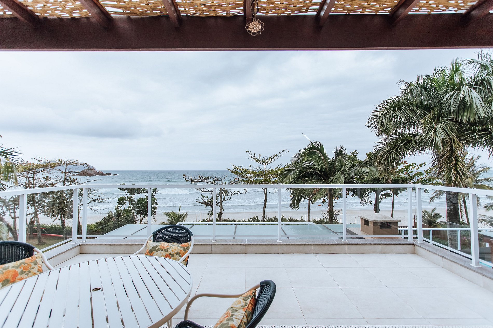 - varanda com mesa, cadeiras e uma vista sensacional da praia de Juquehy;